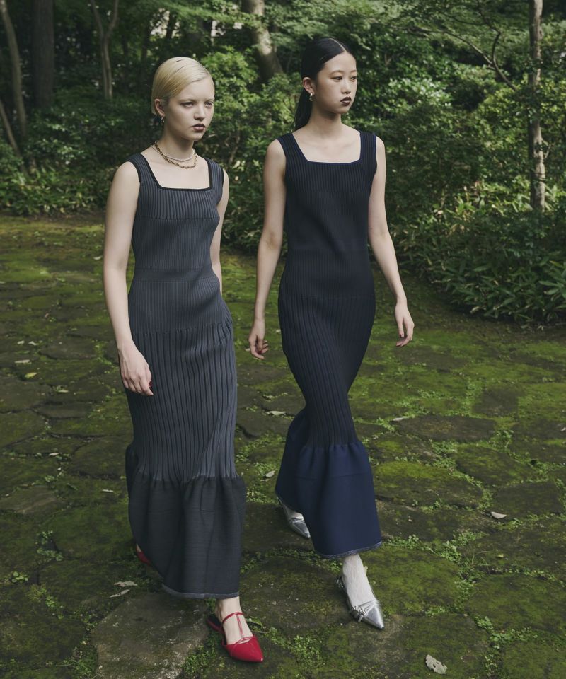 からだにフィットする部分と裾部分のフォルムがつくる、コントラストあるシルエットが特徴的。