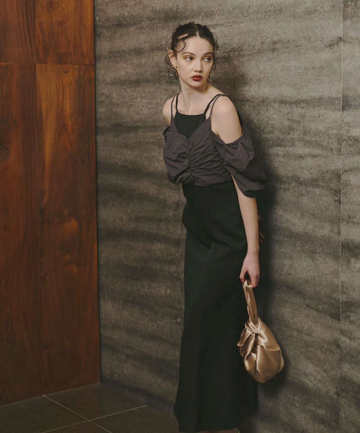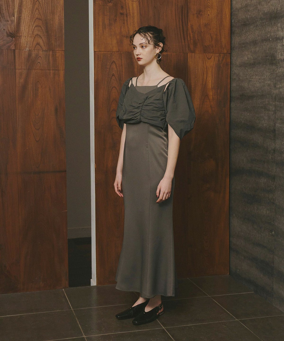トップスとワンピースの相反するボリューム感と生地感のバランスが、