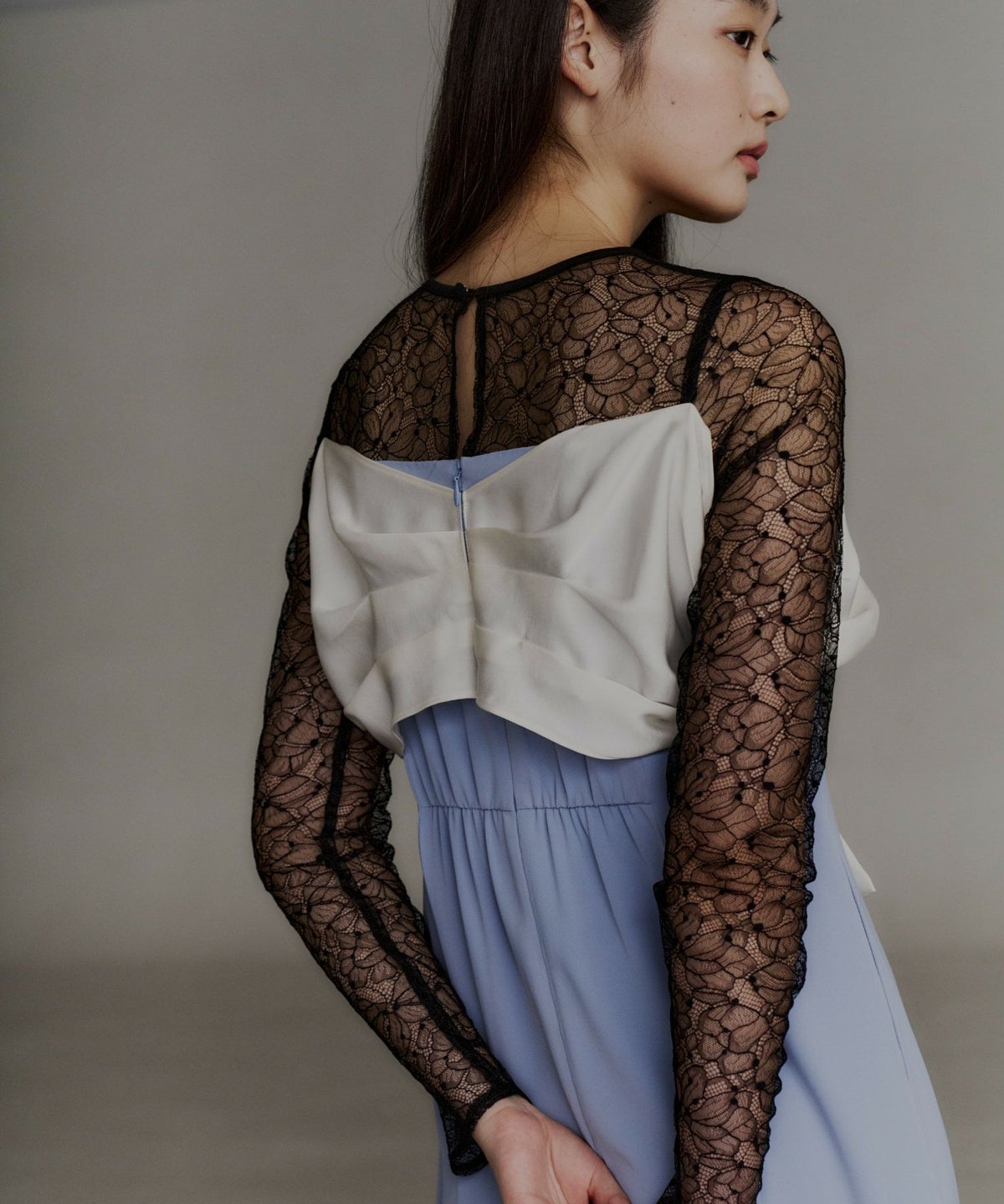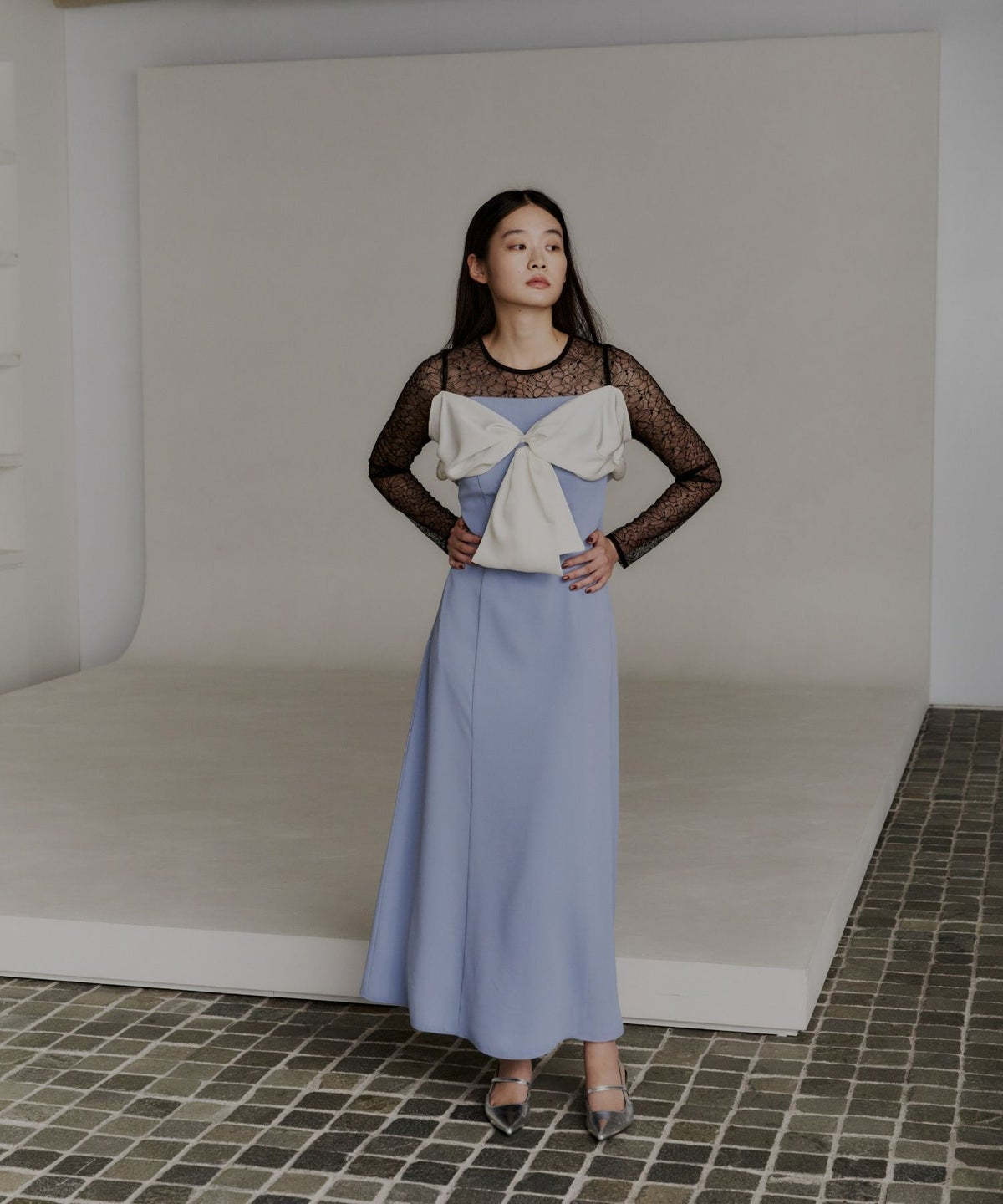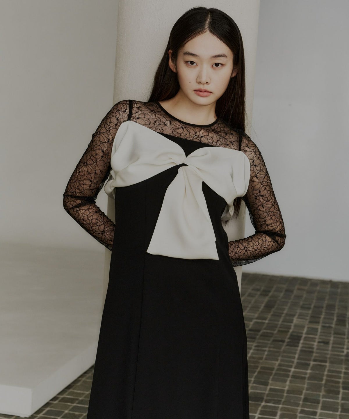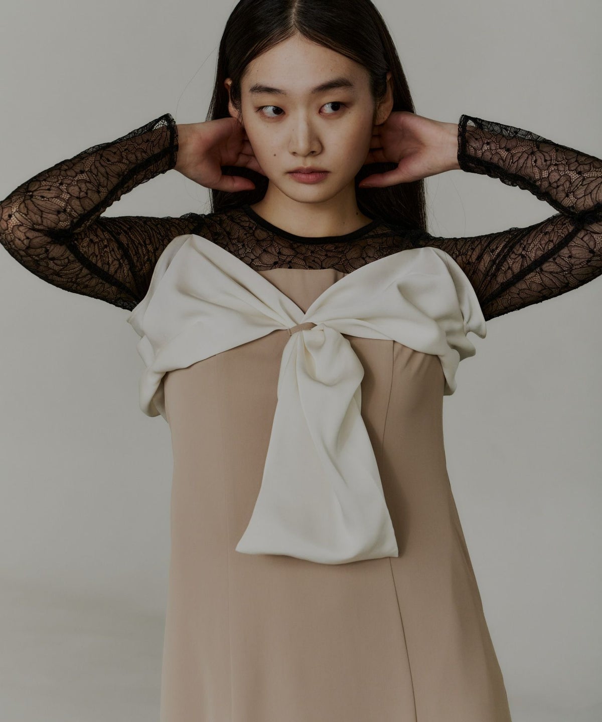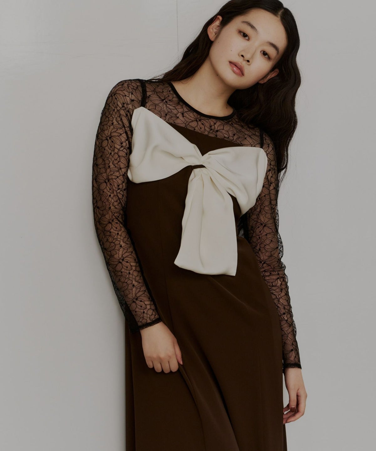 胸元のリボンディテールのジャケットを合わせても隠れずコーデのポイントに。