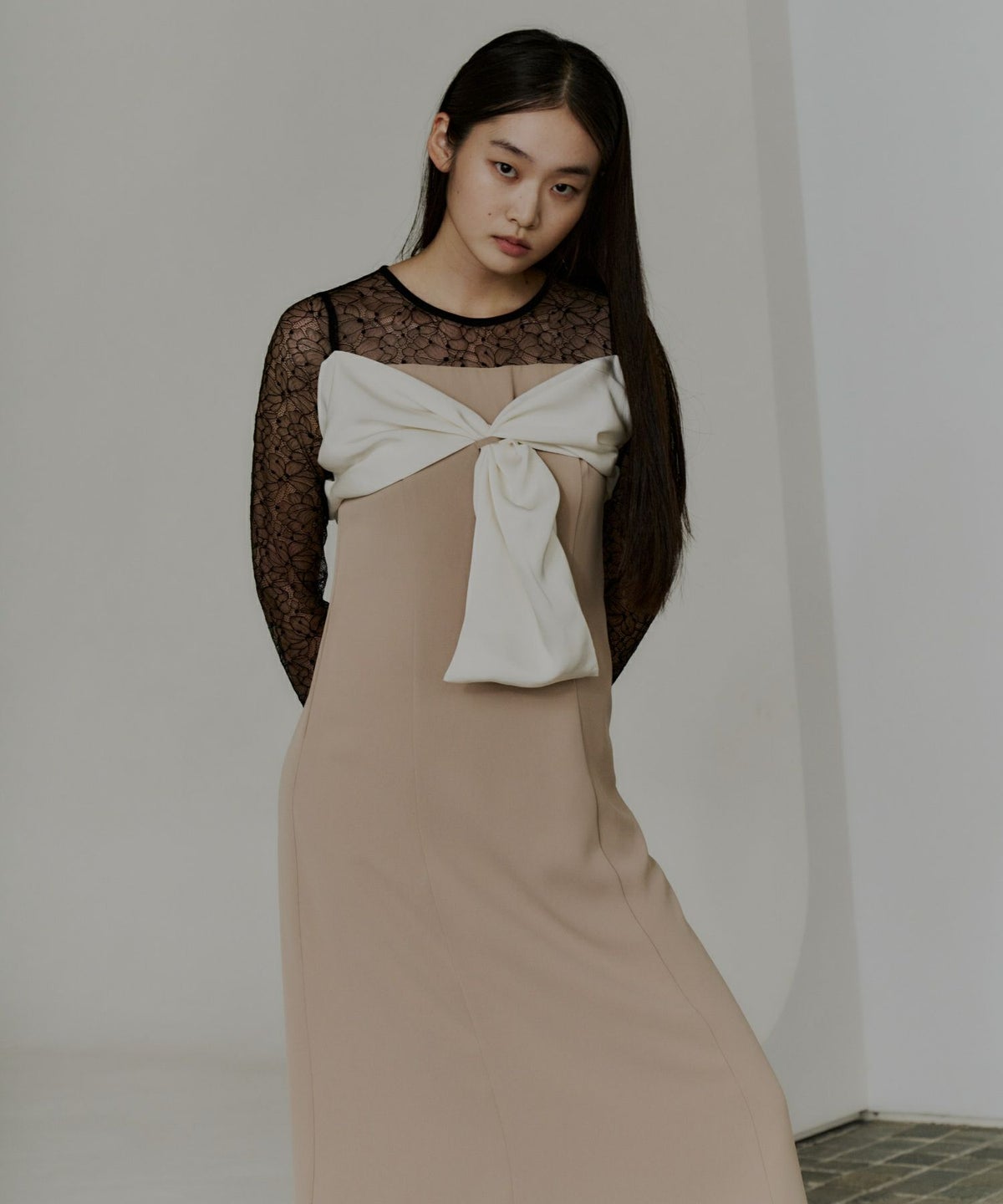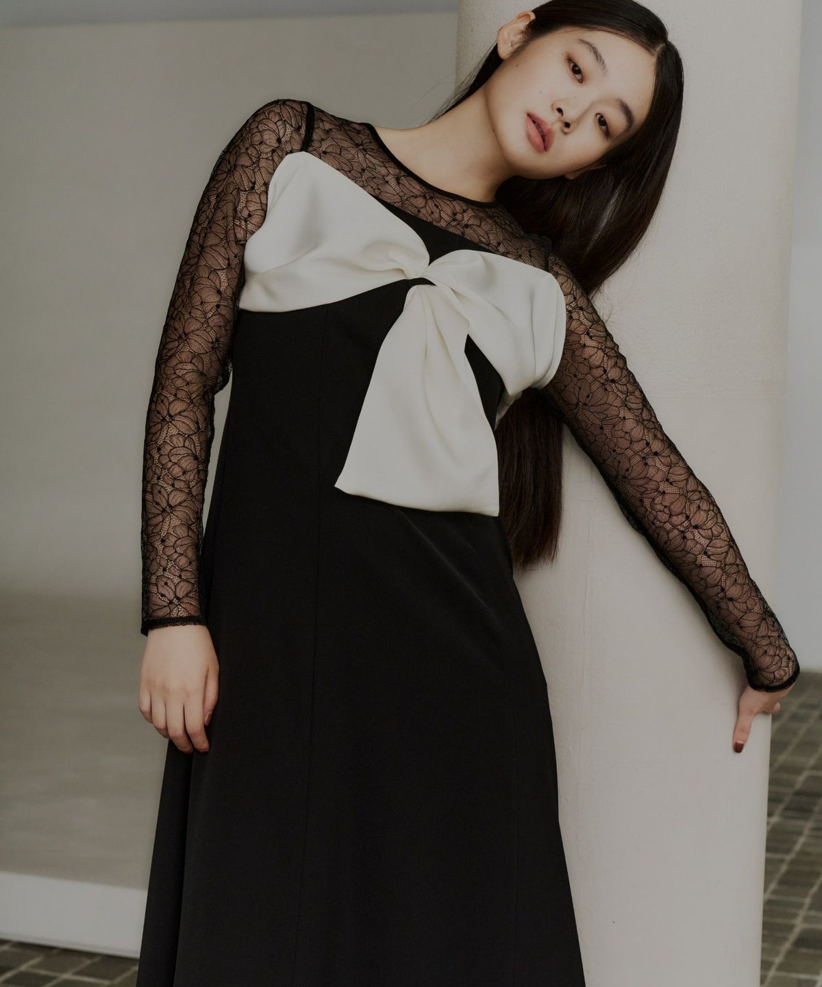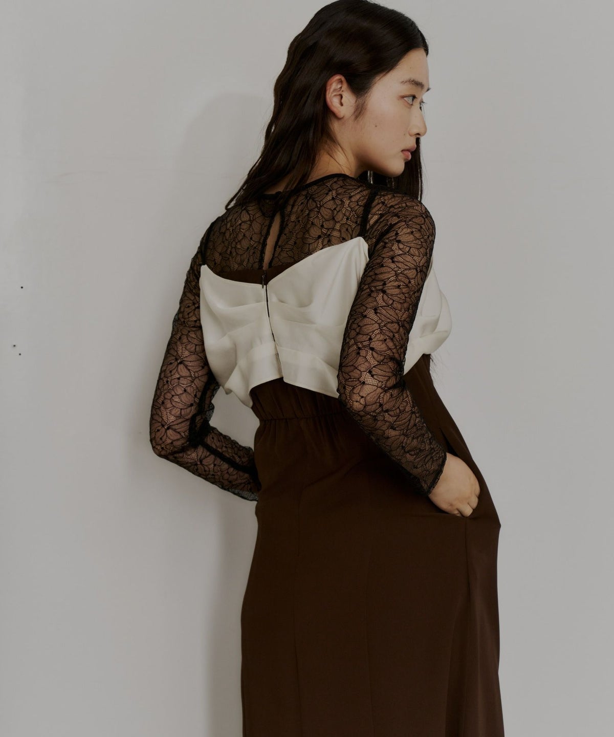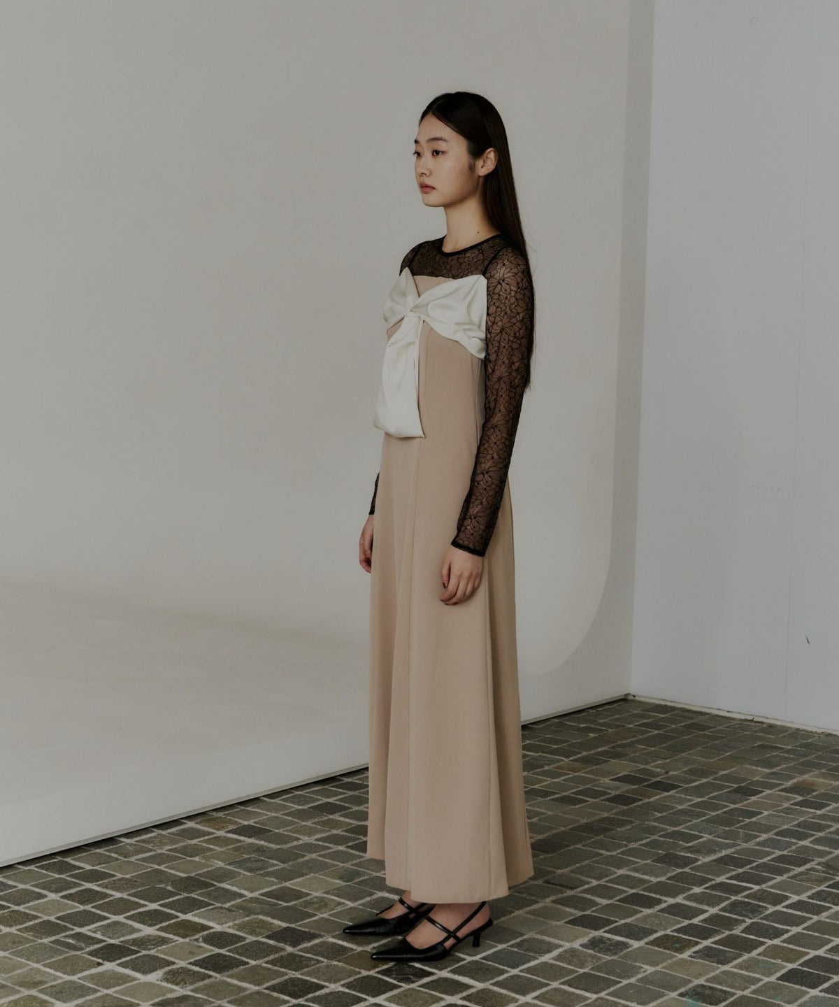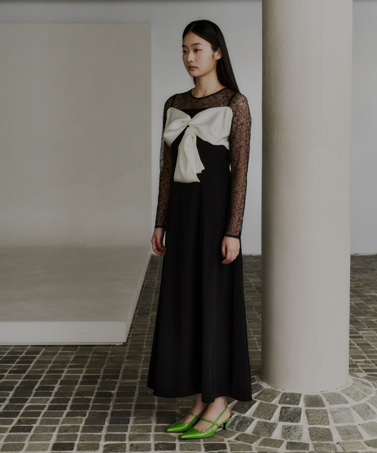 胸元のリボンディテールのジャケットを合わせても隠れずコーデのポイントに。