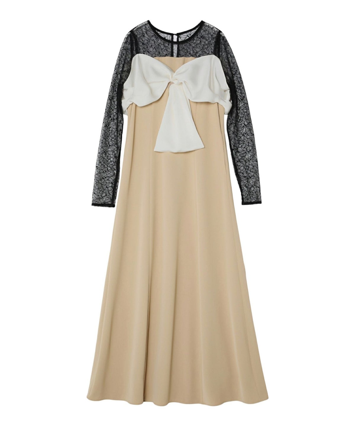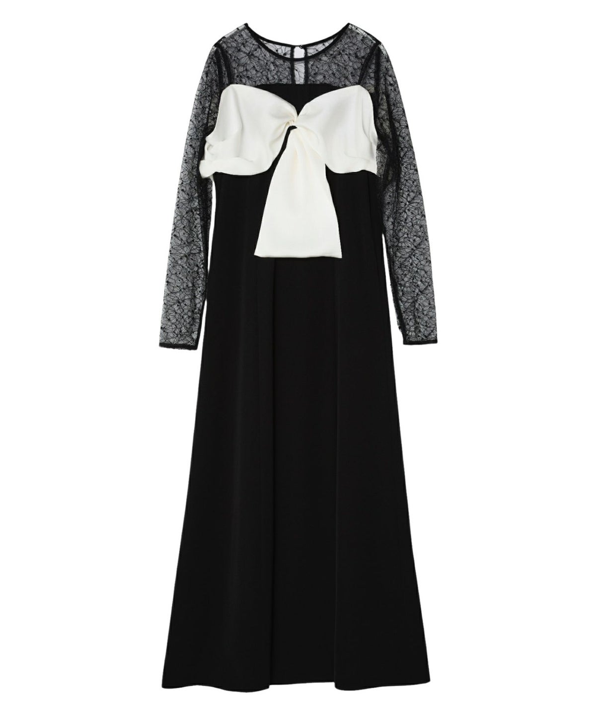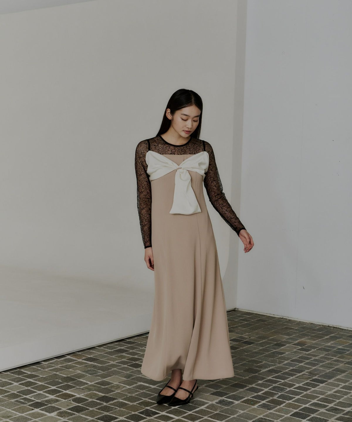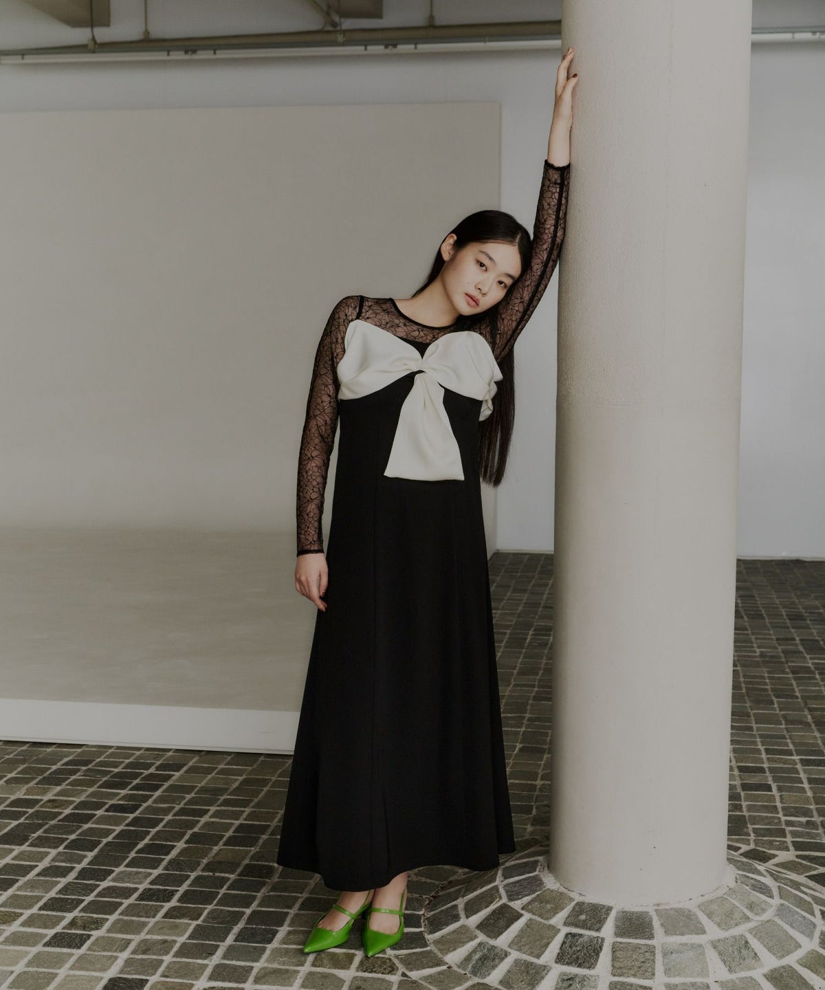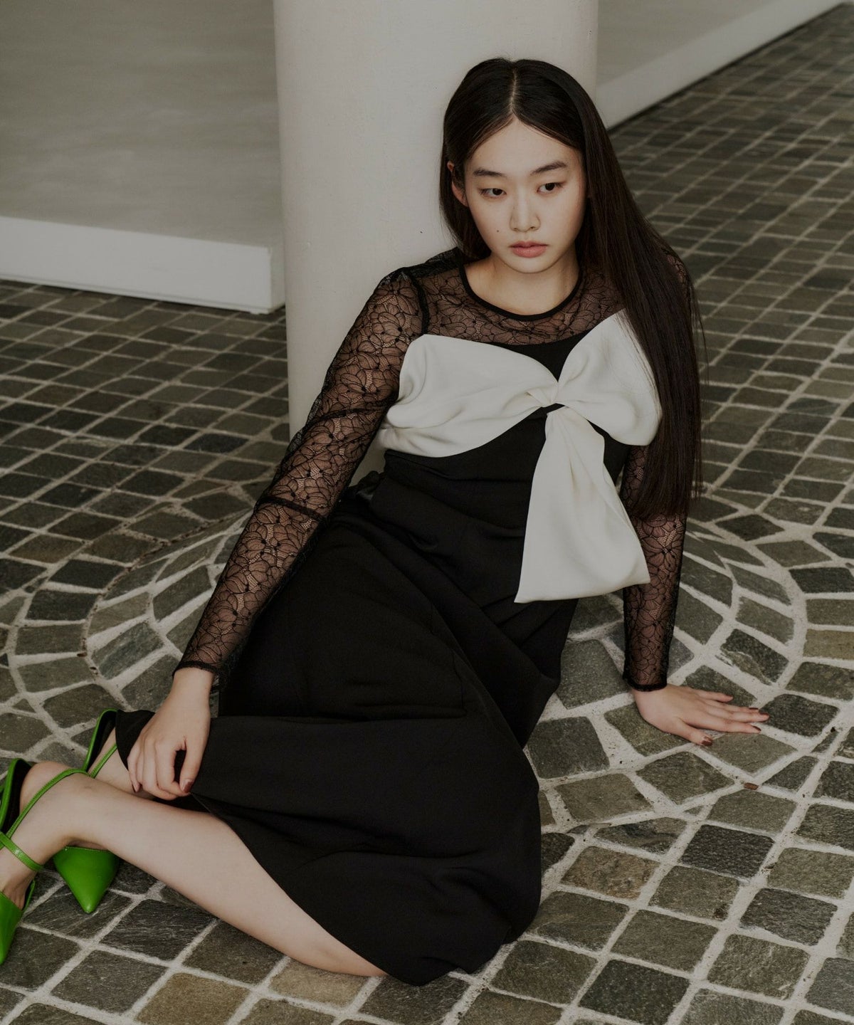 胸元のリボンディテールのジャケットを合わせても隠れずコーデのポイントに。