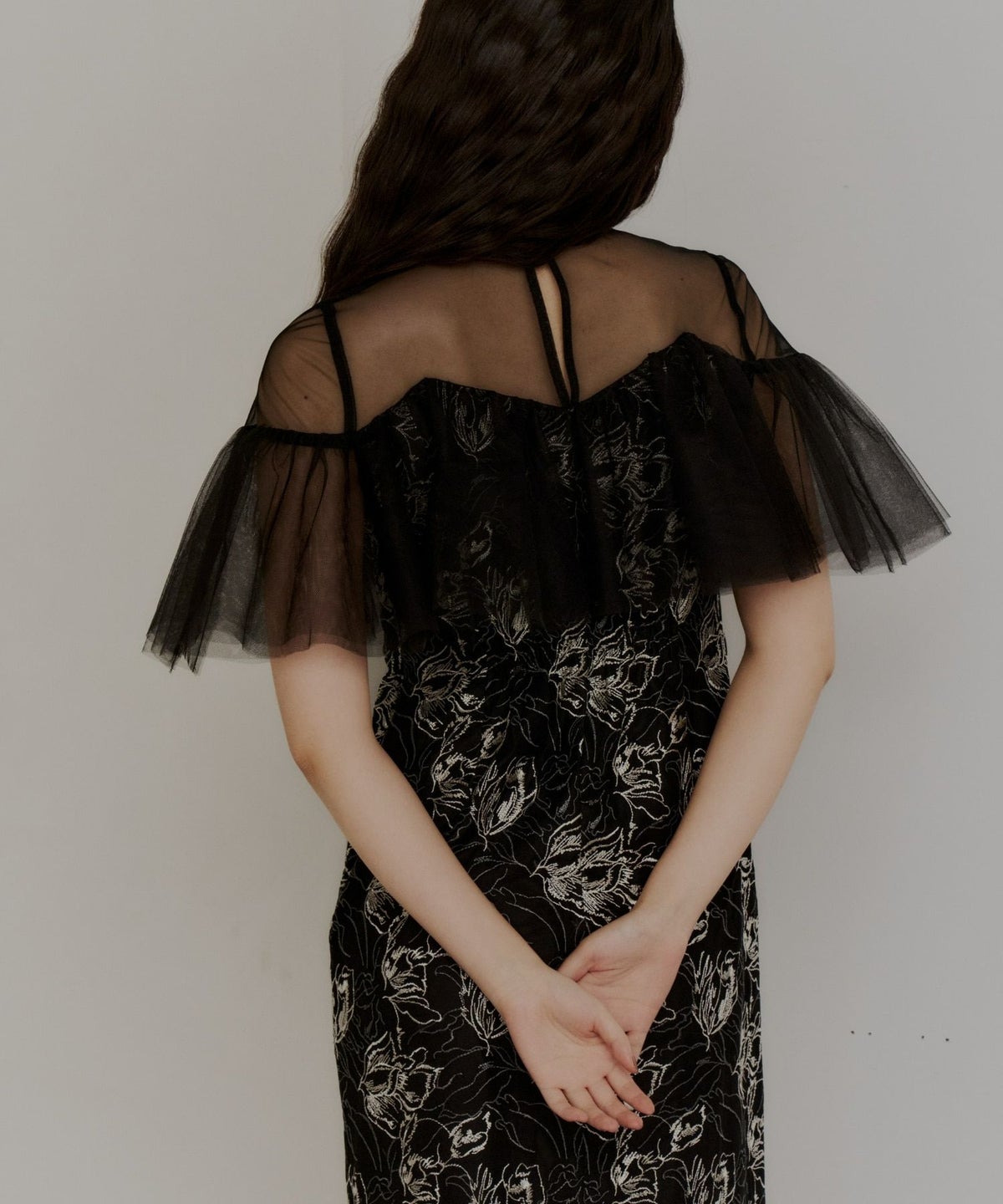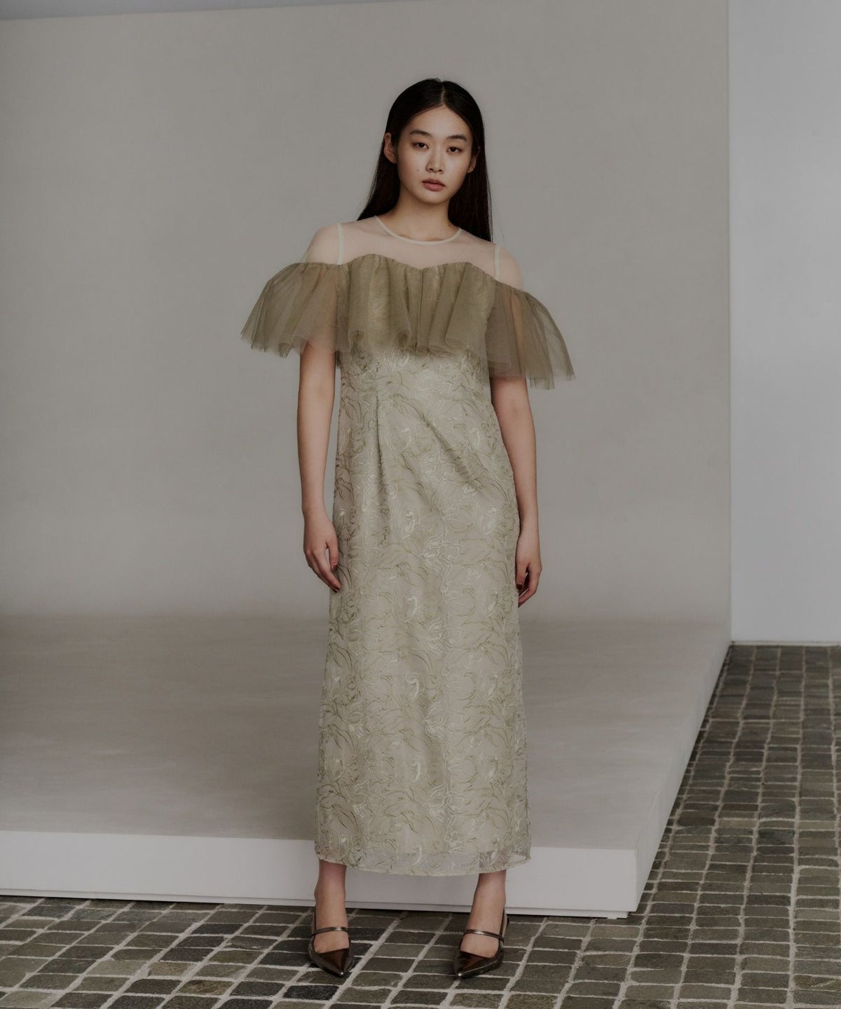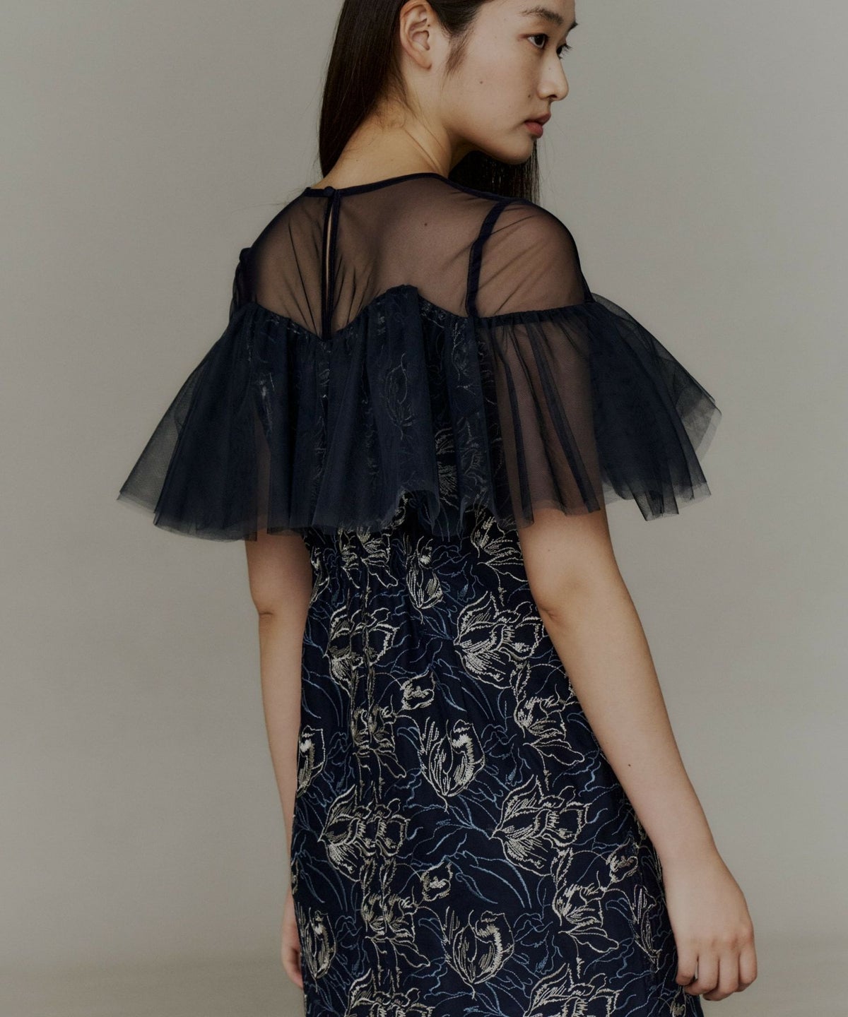 トップにあしらったフリルはハリのあるチュールでボリュームを引き立てオフショル見えのデザインに。