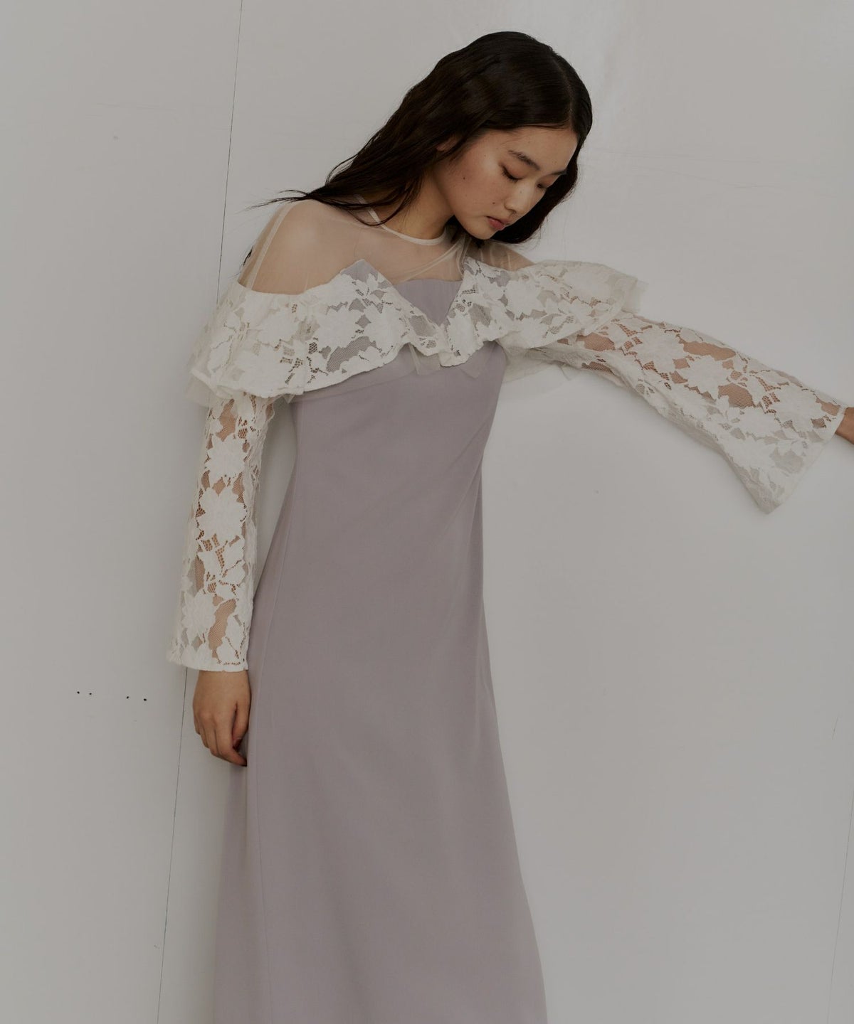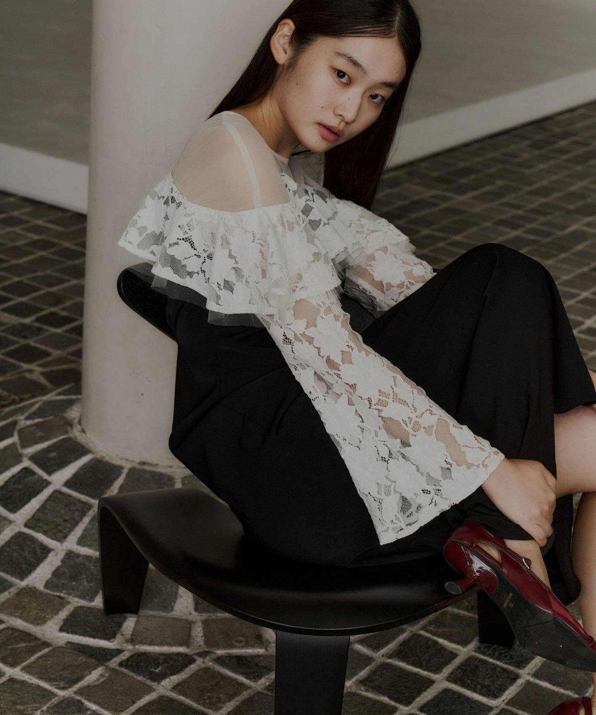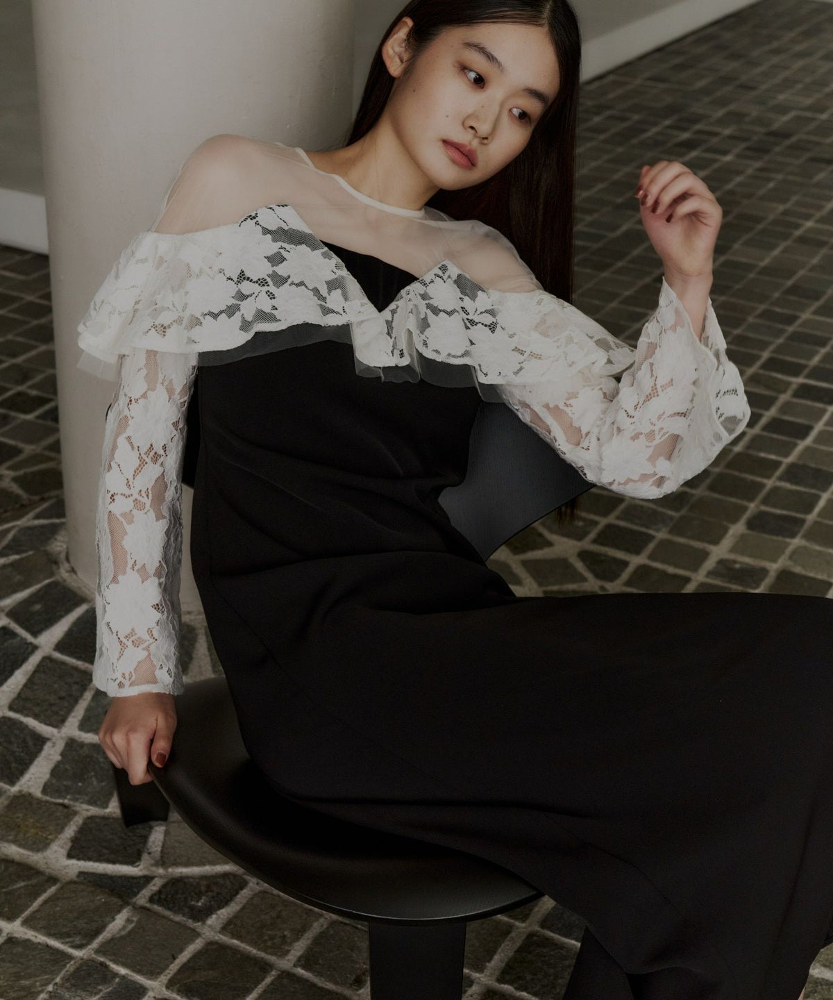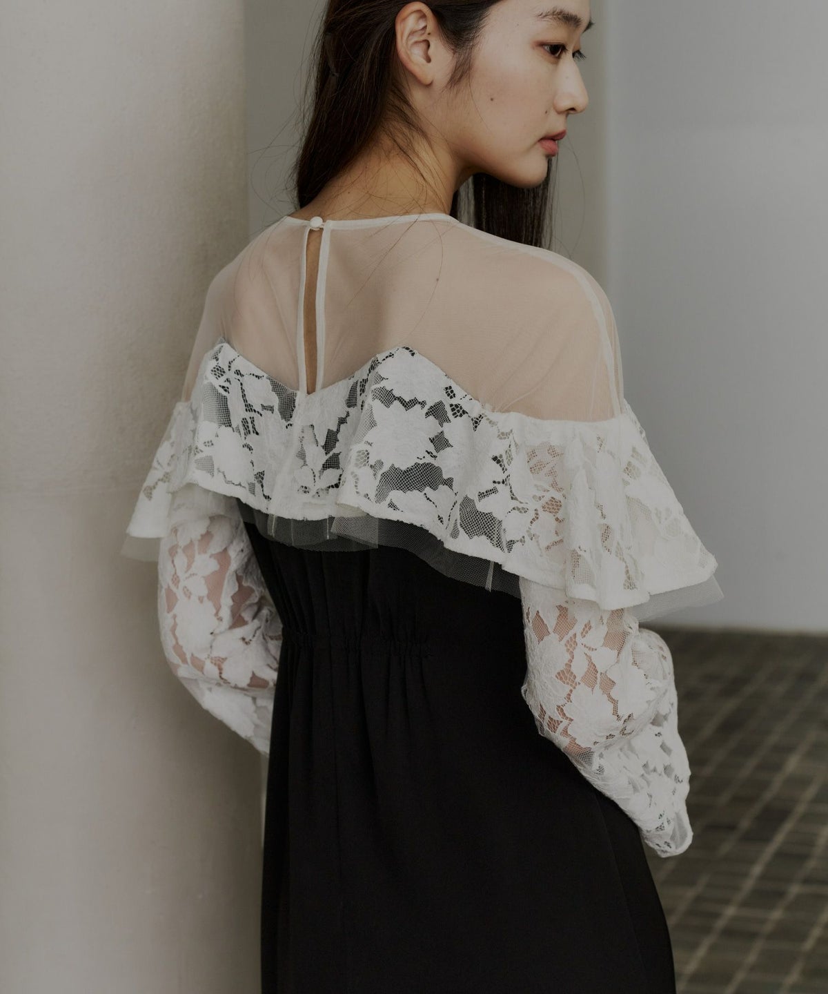 バストからスリーブへと流れるレースのラッフルが印象的な一着。