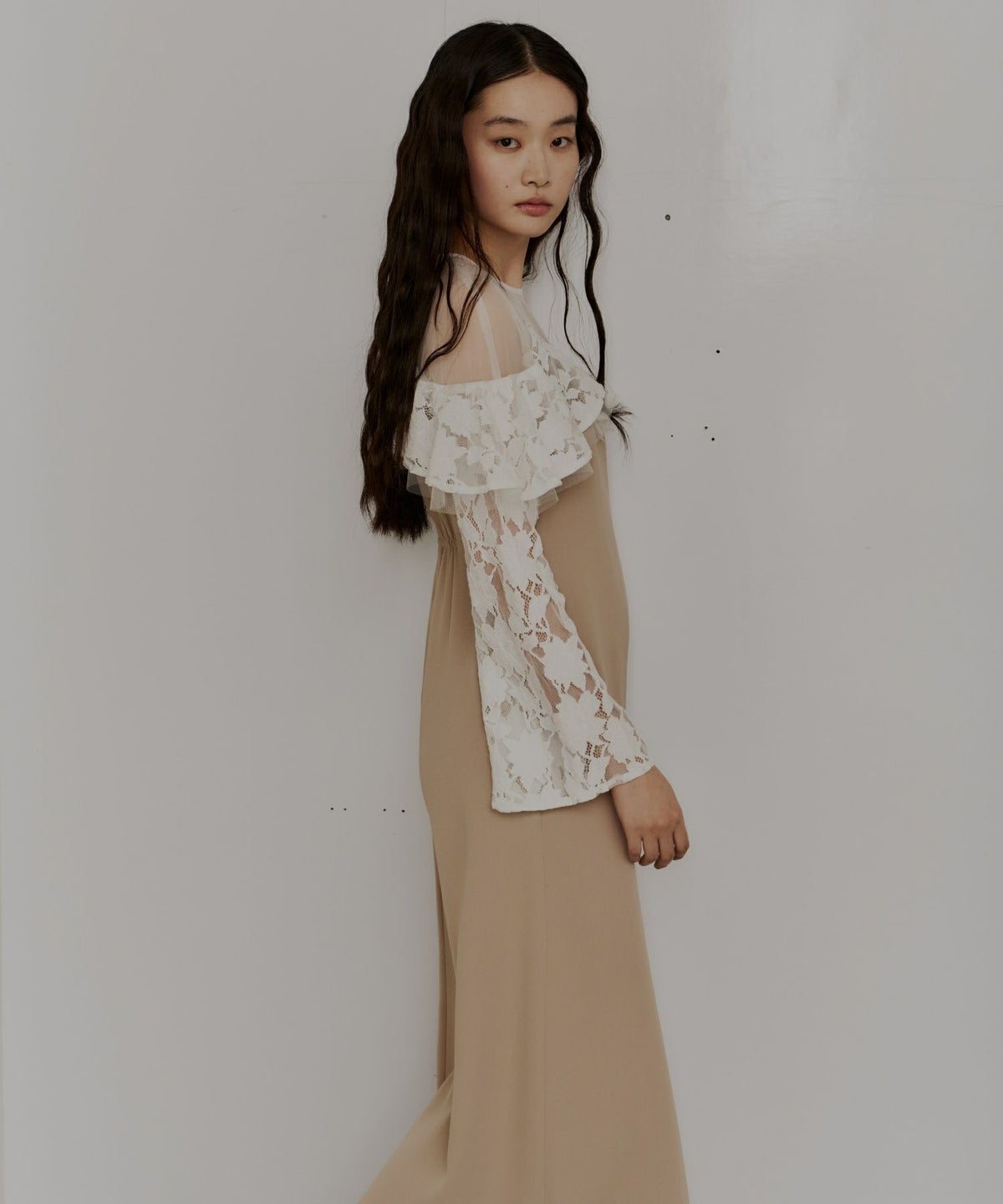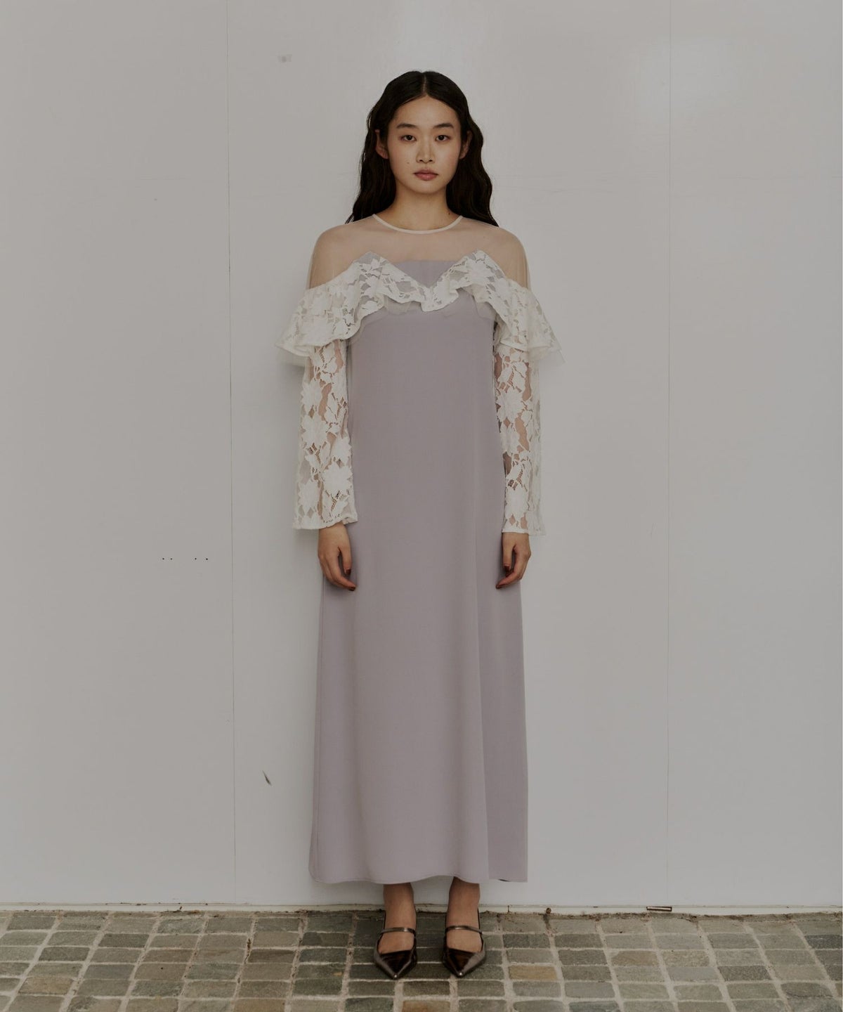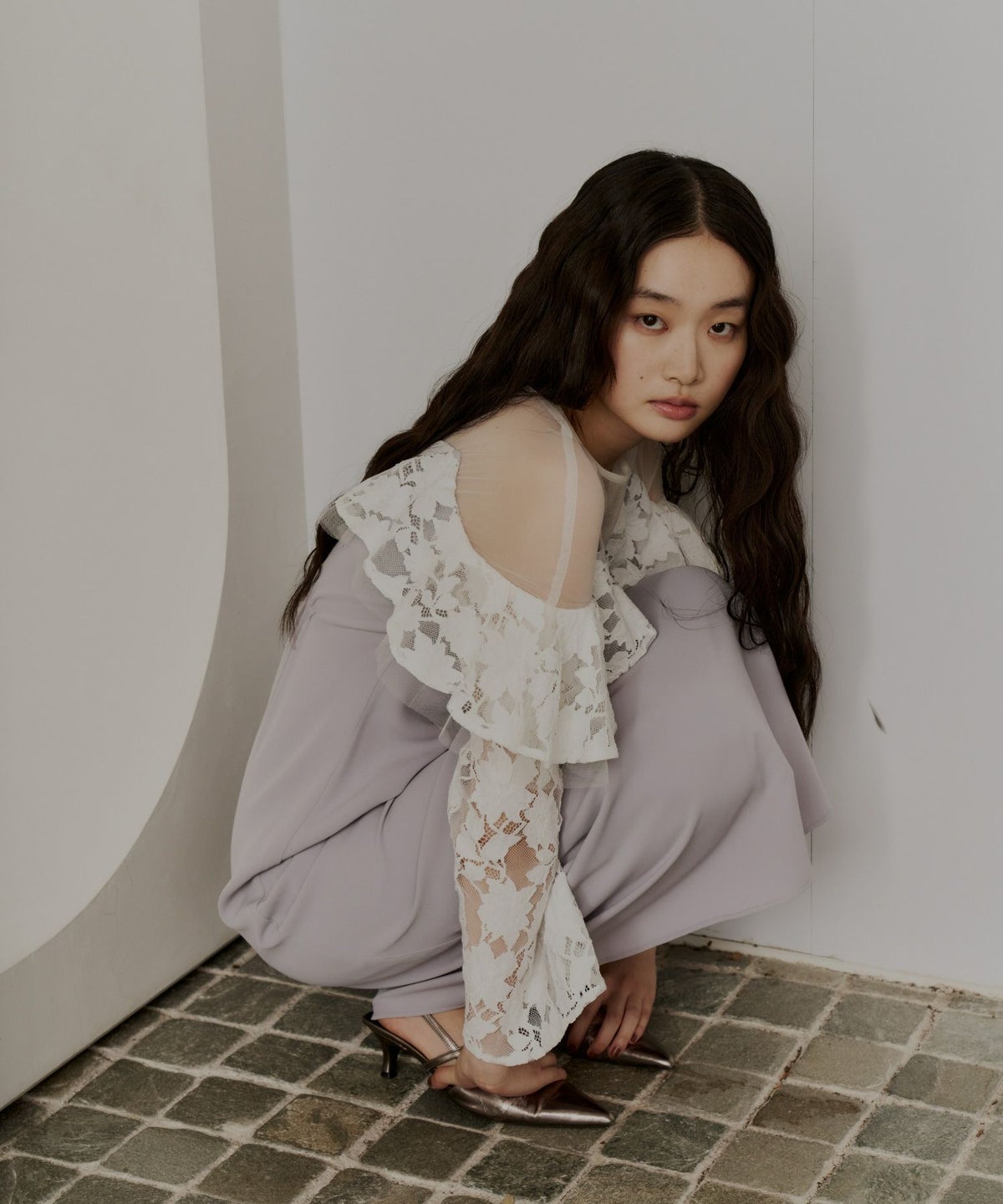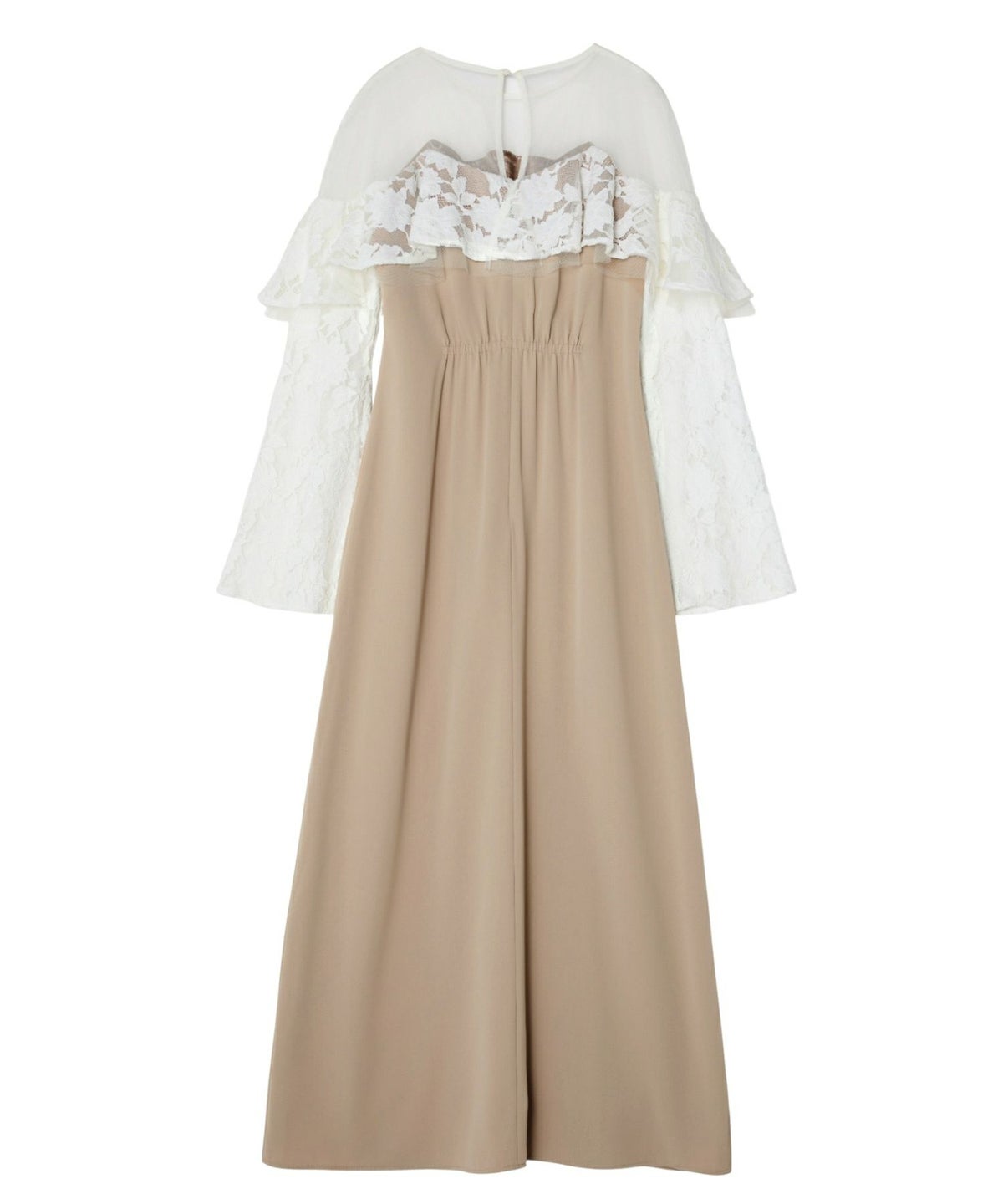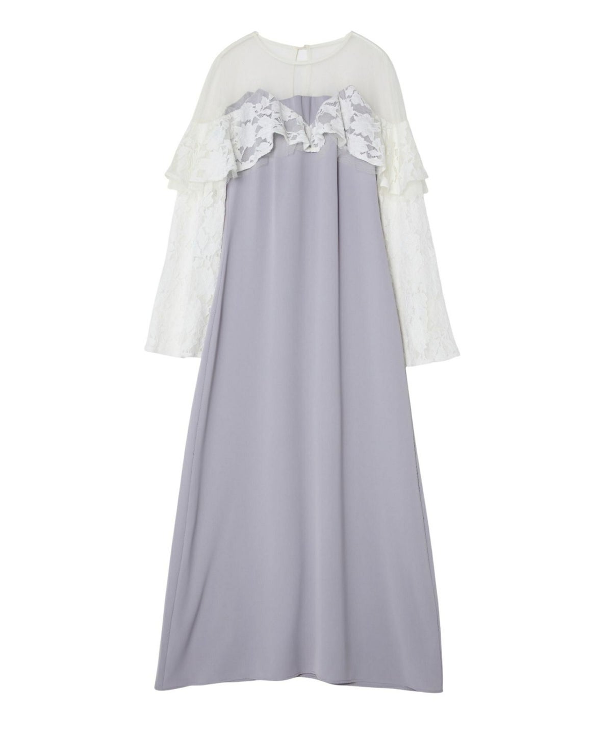 バストからスリーブへと流れるレースのラッフルが印象的な一着。
