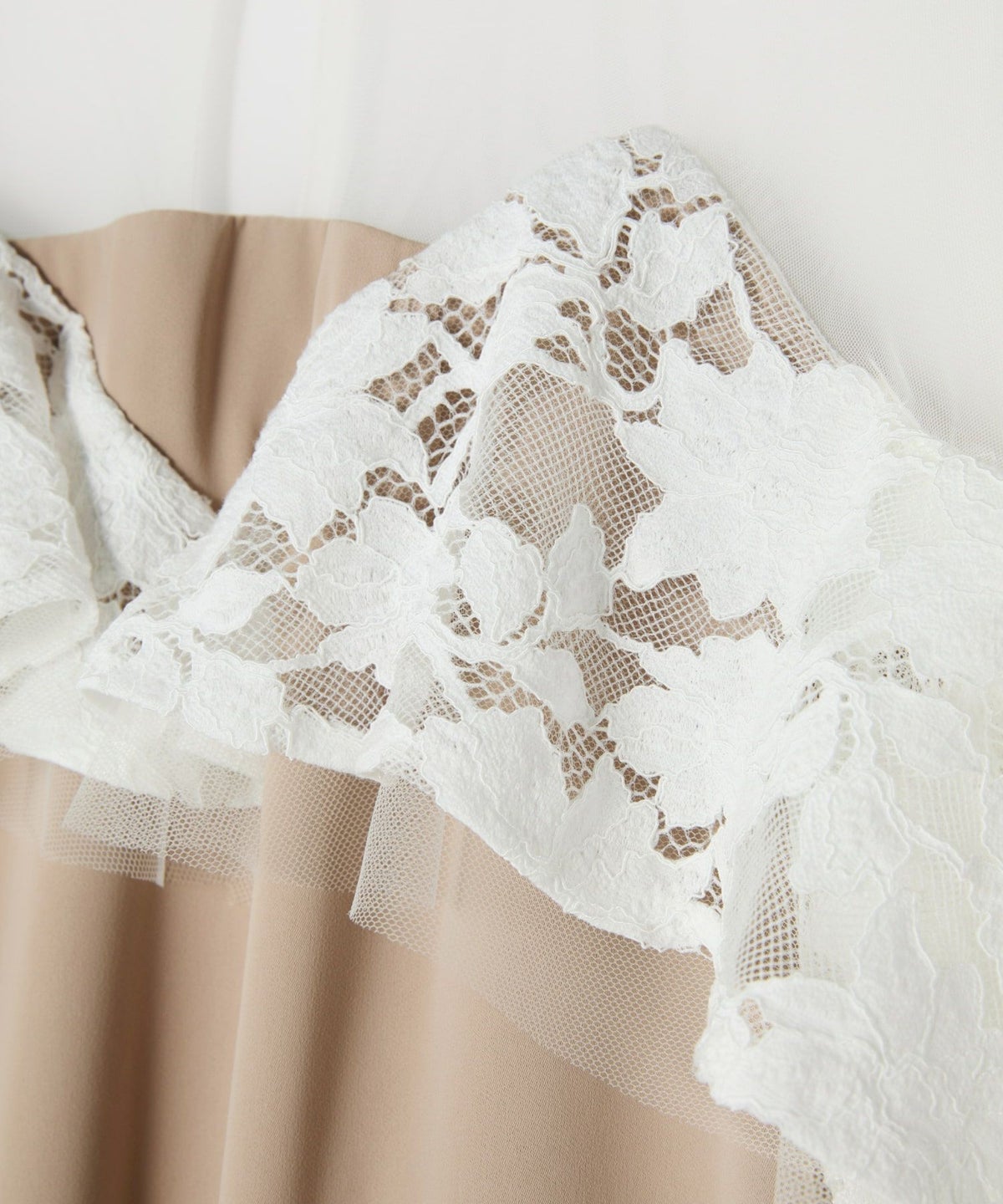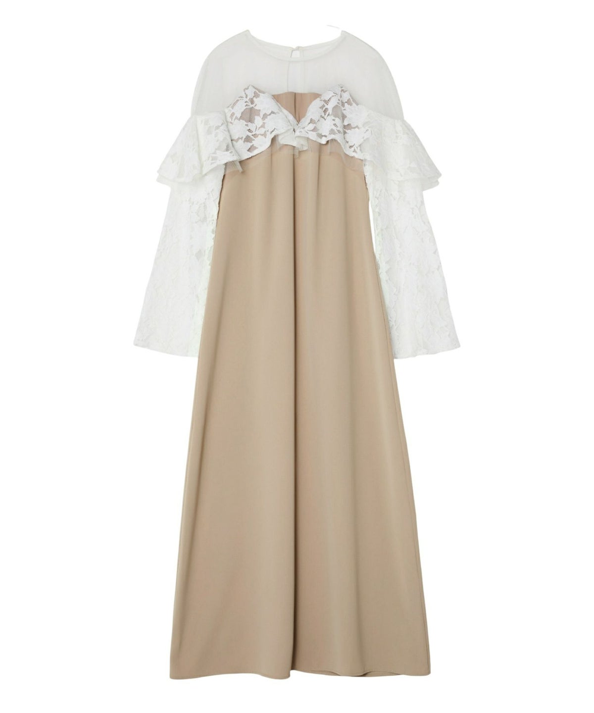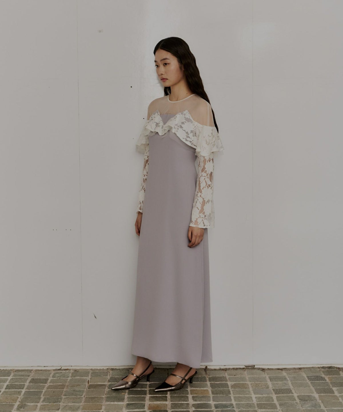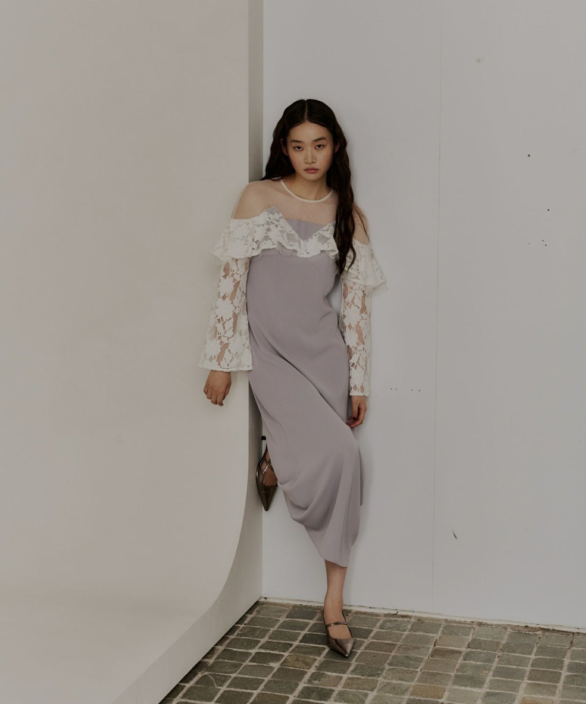 バストからスリーブへと流れるレースのラッフルが印象的な一着。