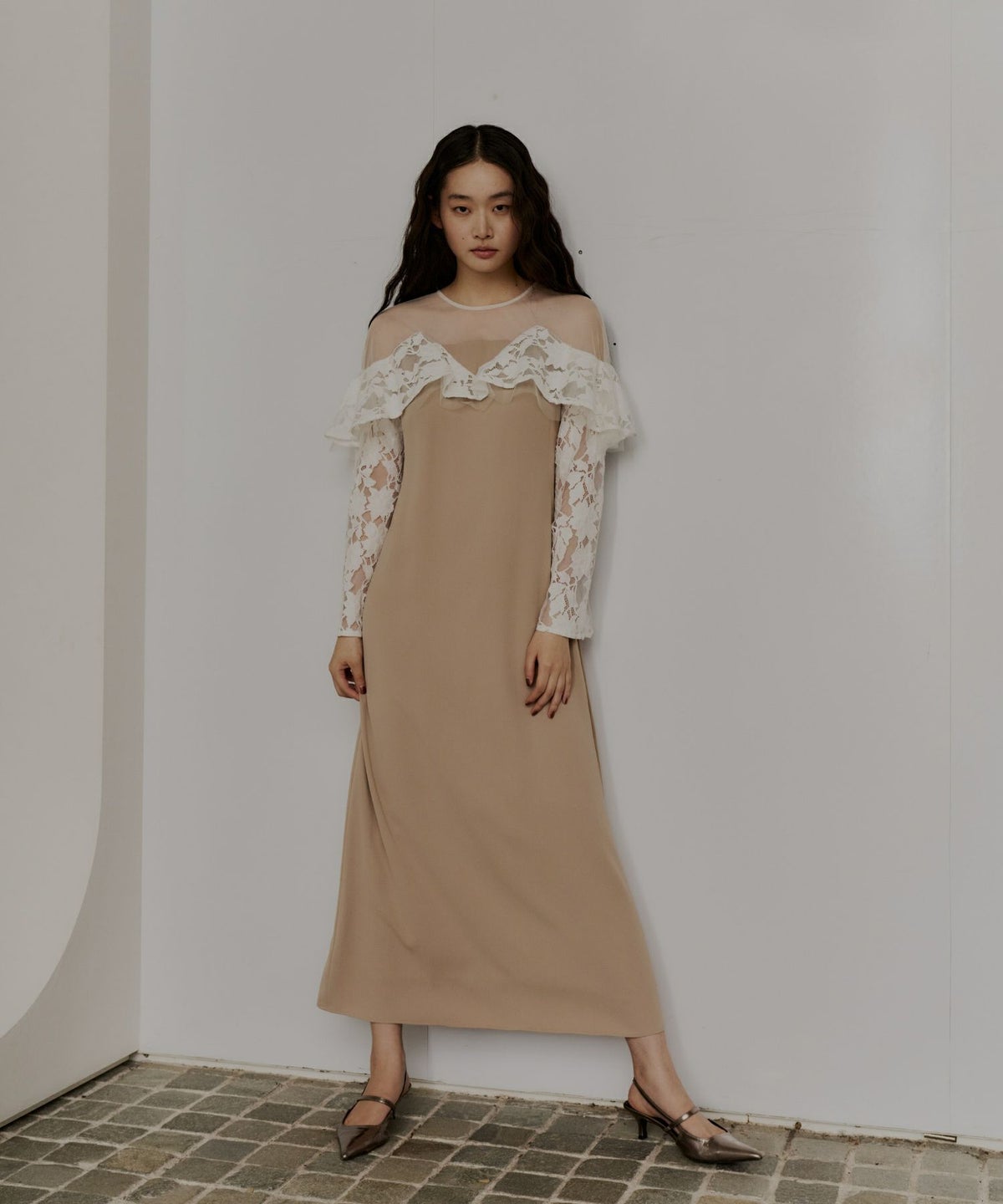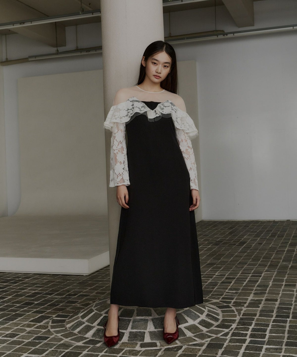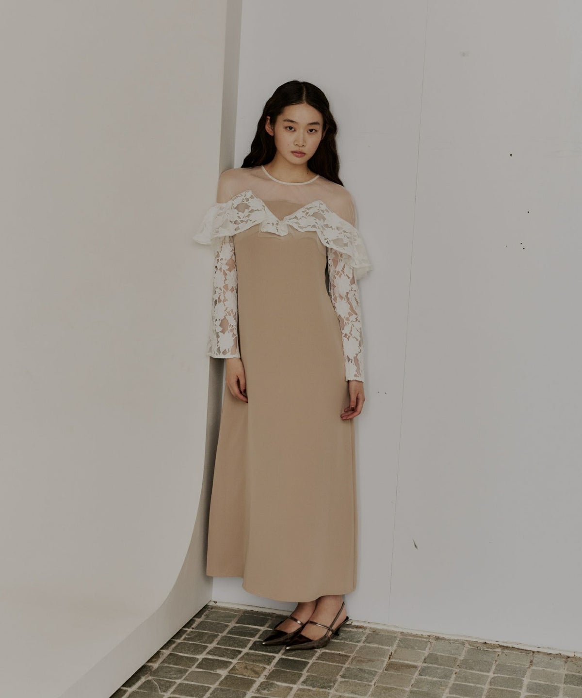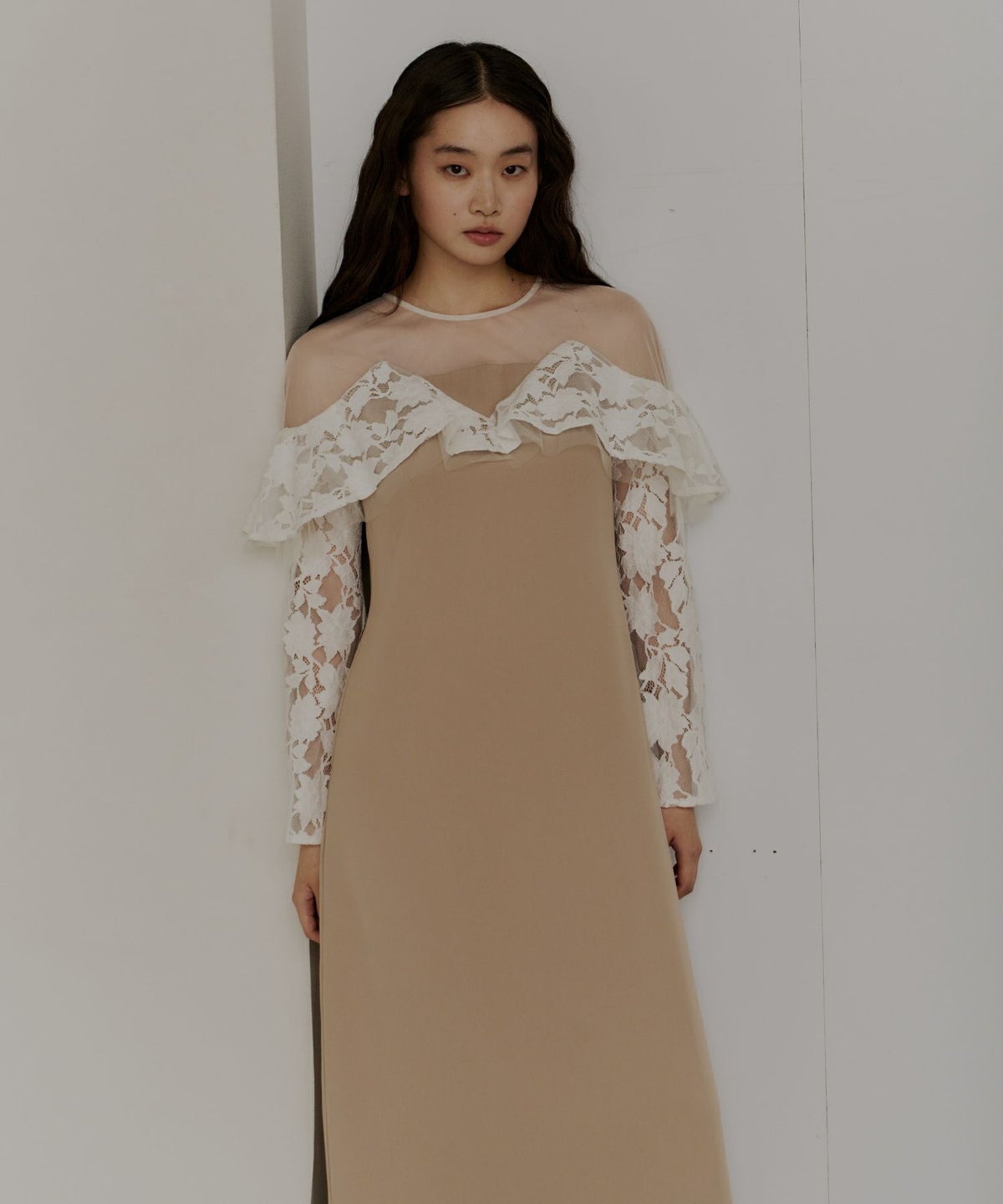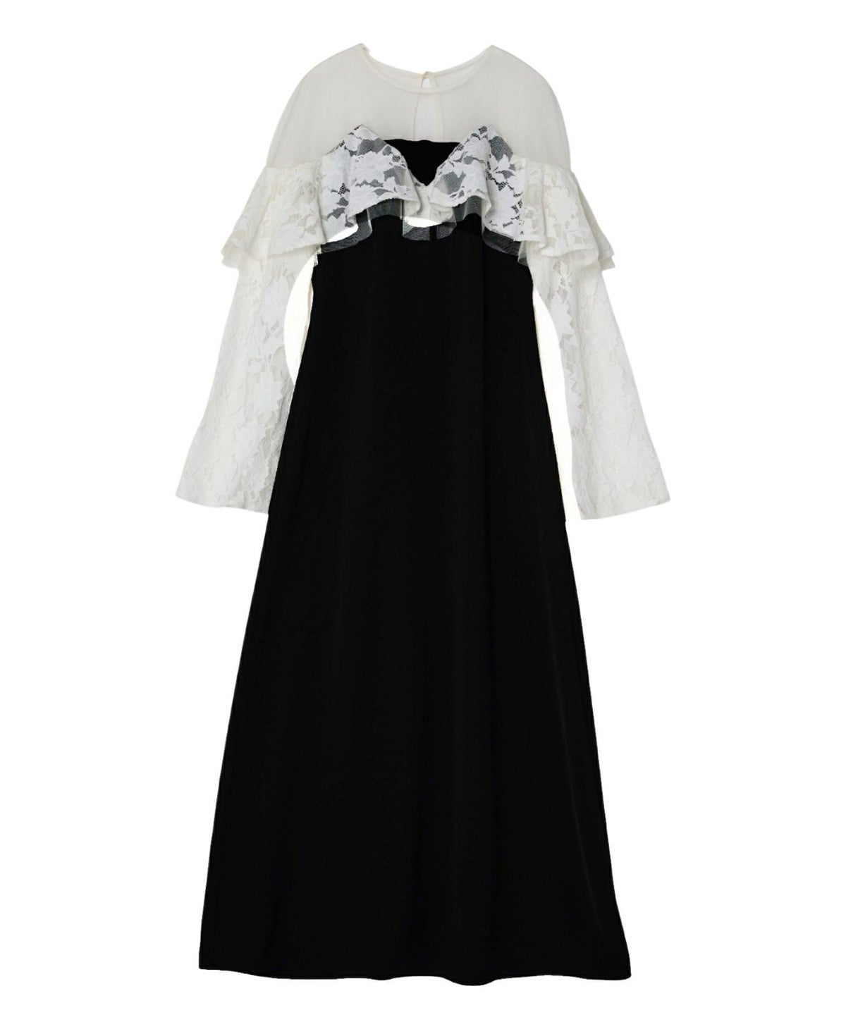 バストからスリーブへと流れるレースのラッフルが印象的な一着。