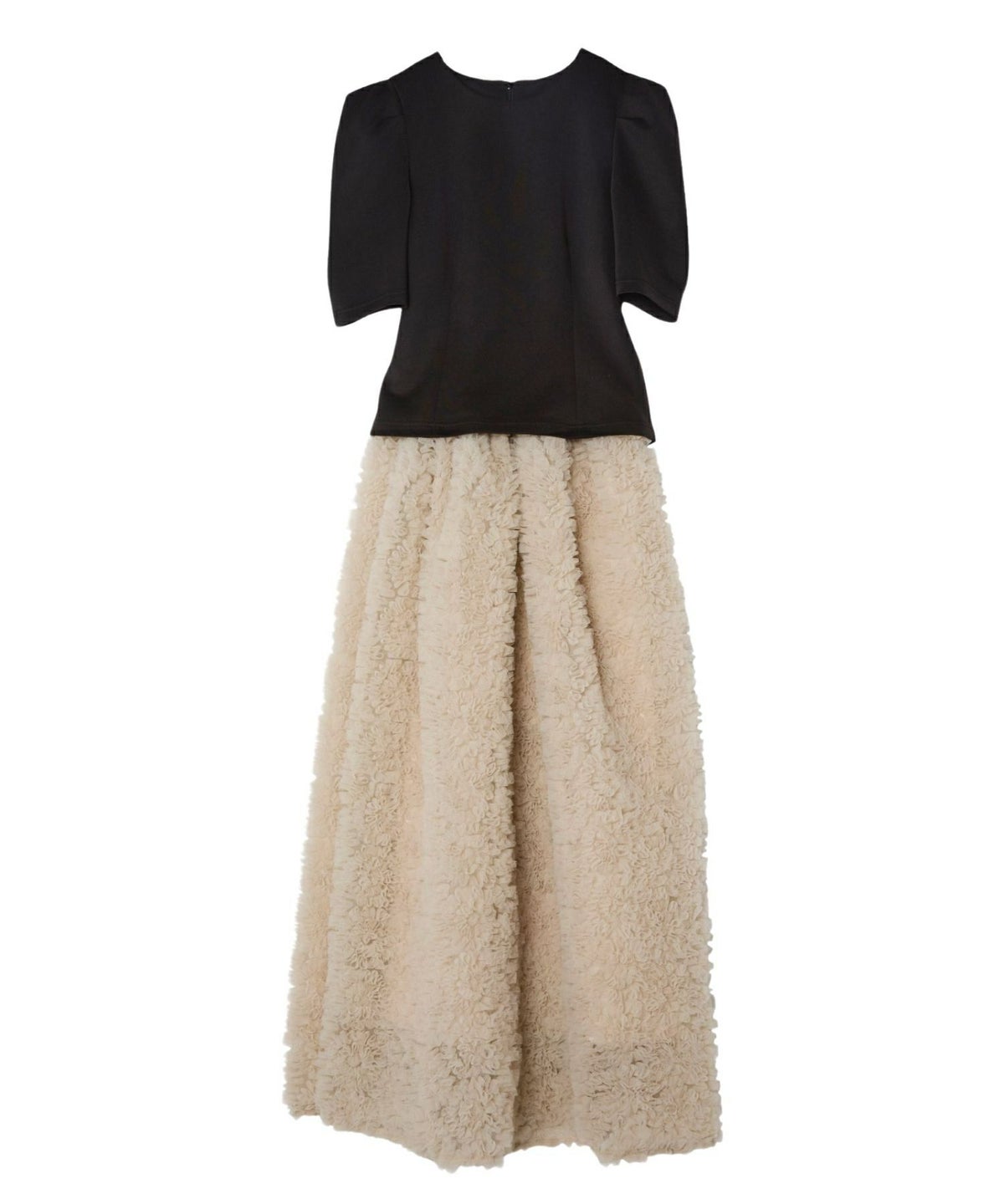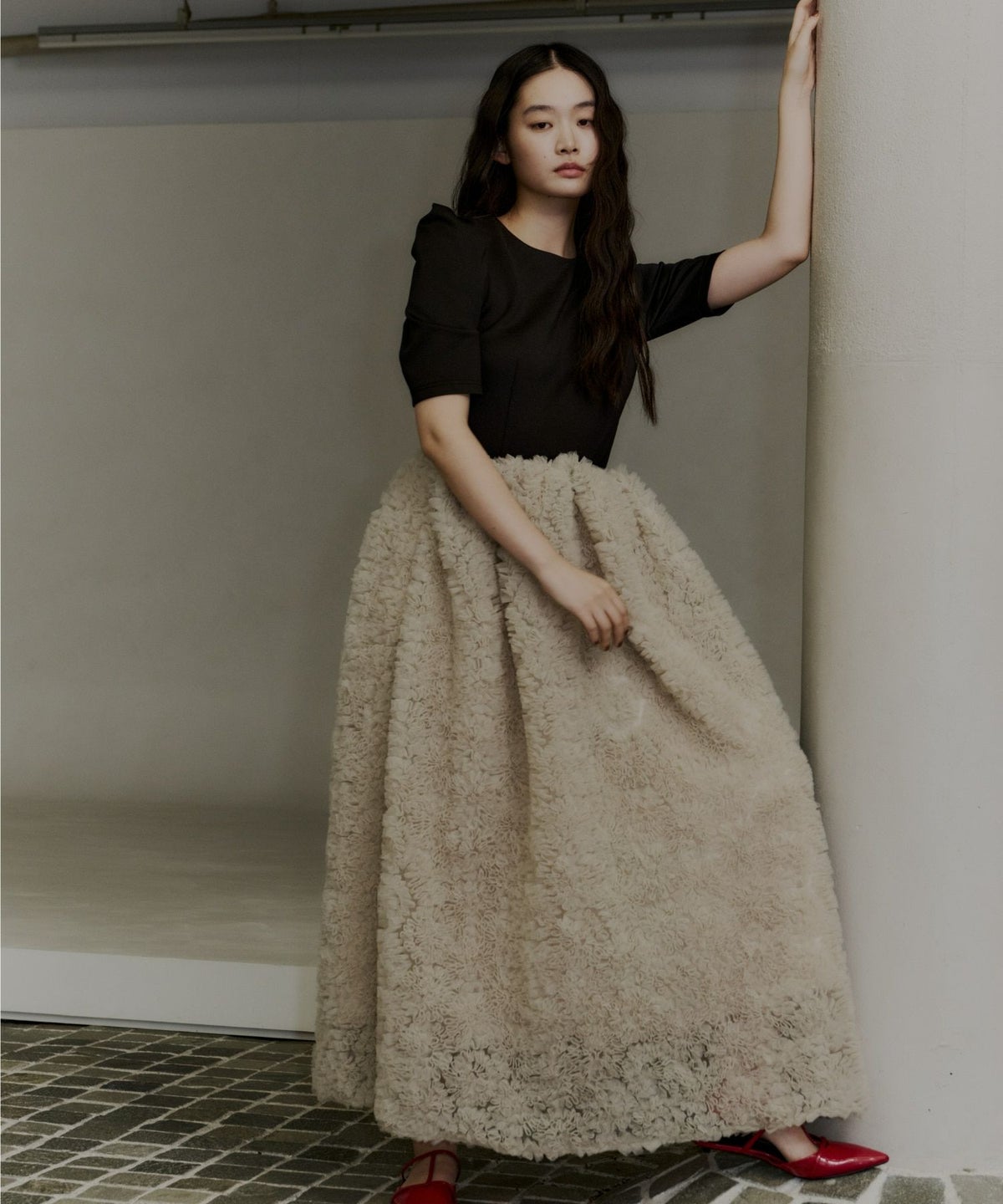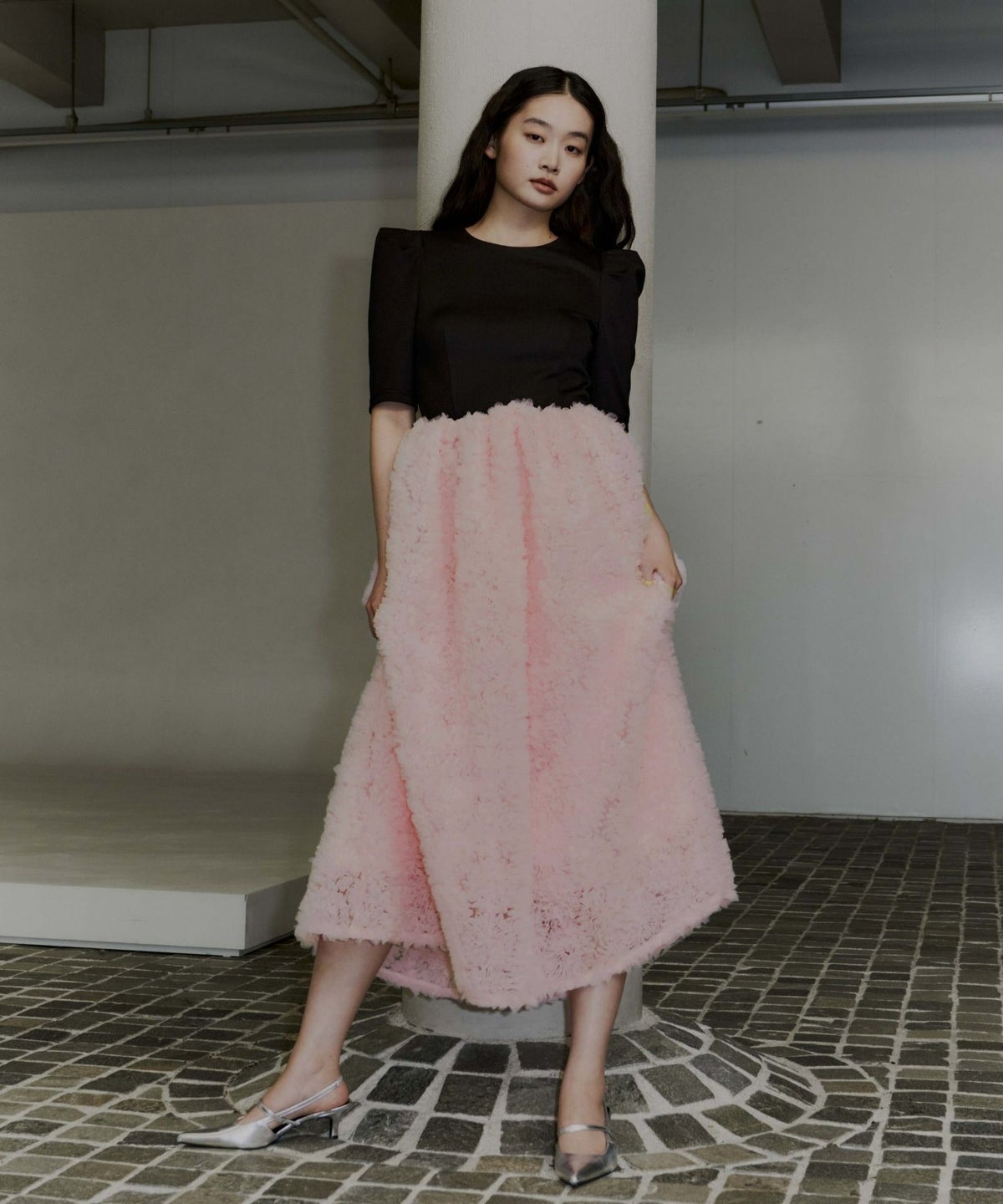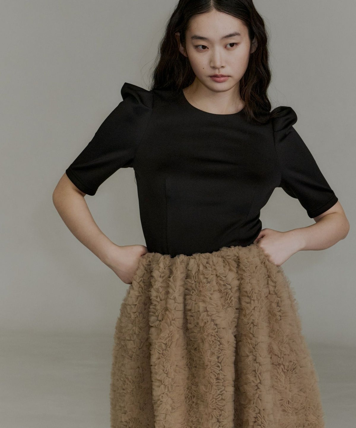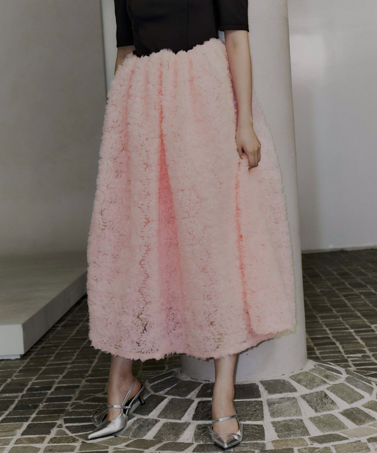 たっぷりのチュールを使ったふんわりフラワーチュール刺繍のもこもこスカートに、