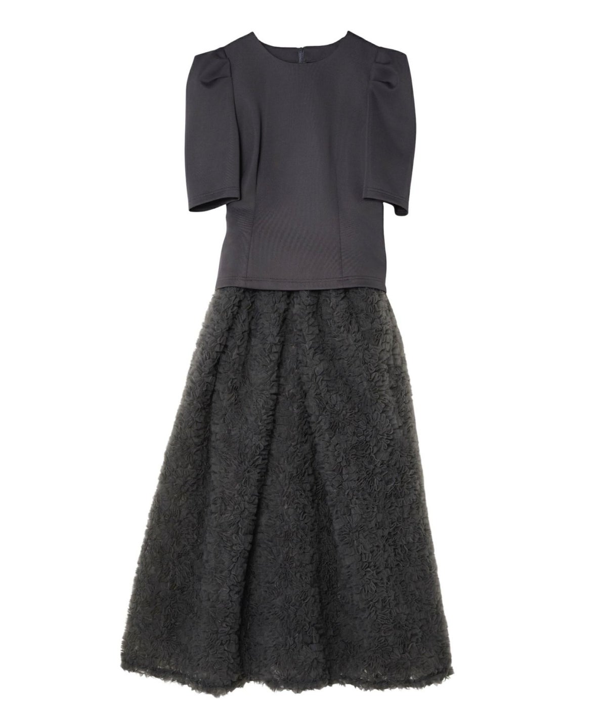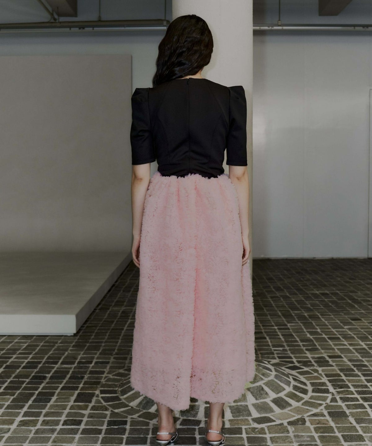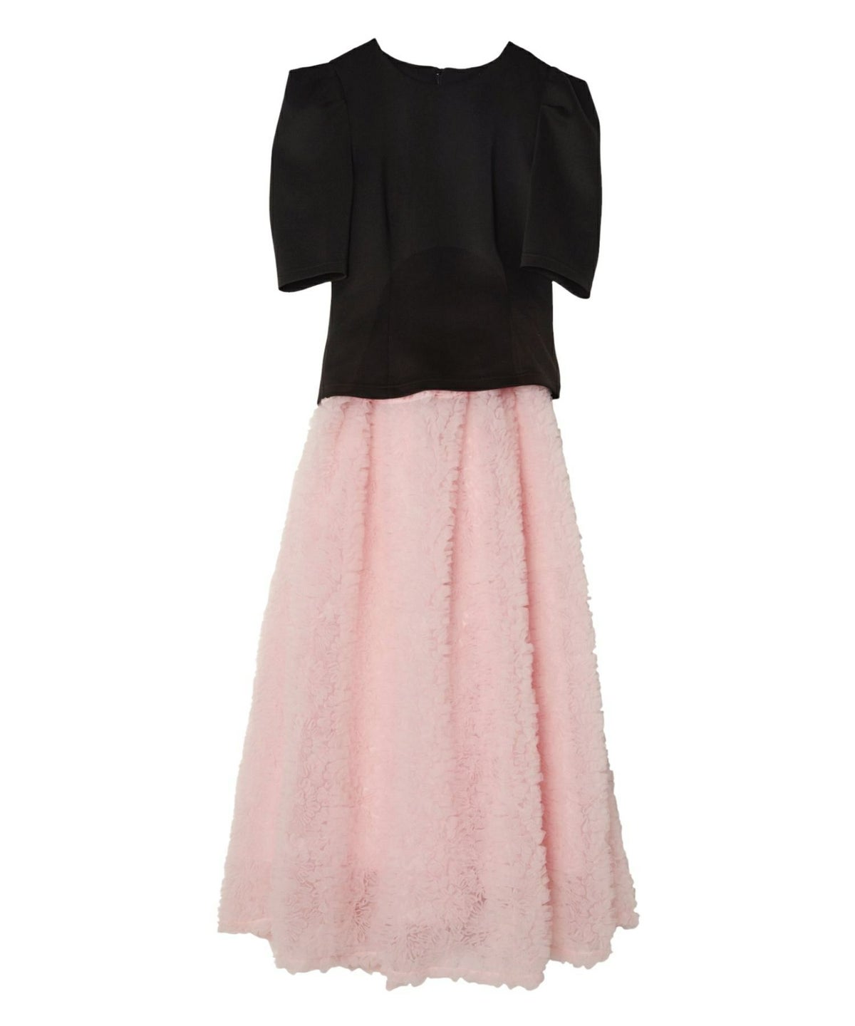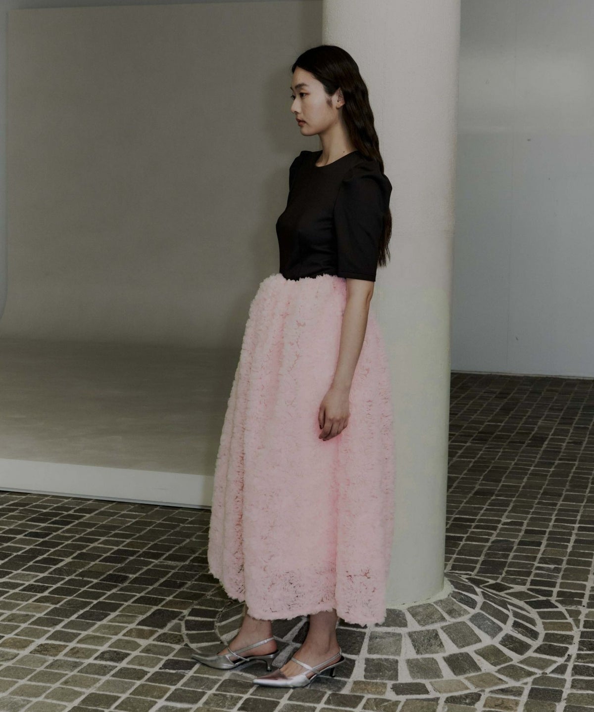 たっぷりのチュールを使ったふんわりフラワーチュール刺繍のもこもこスカートに、