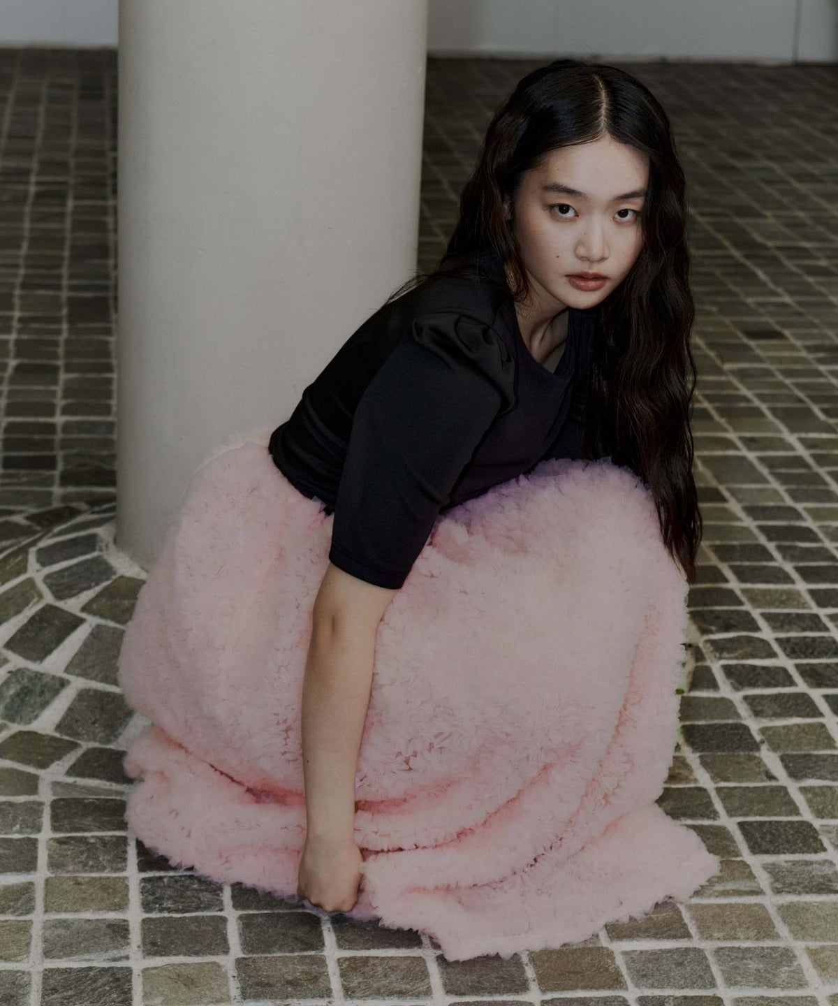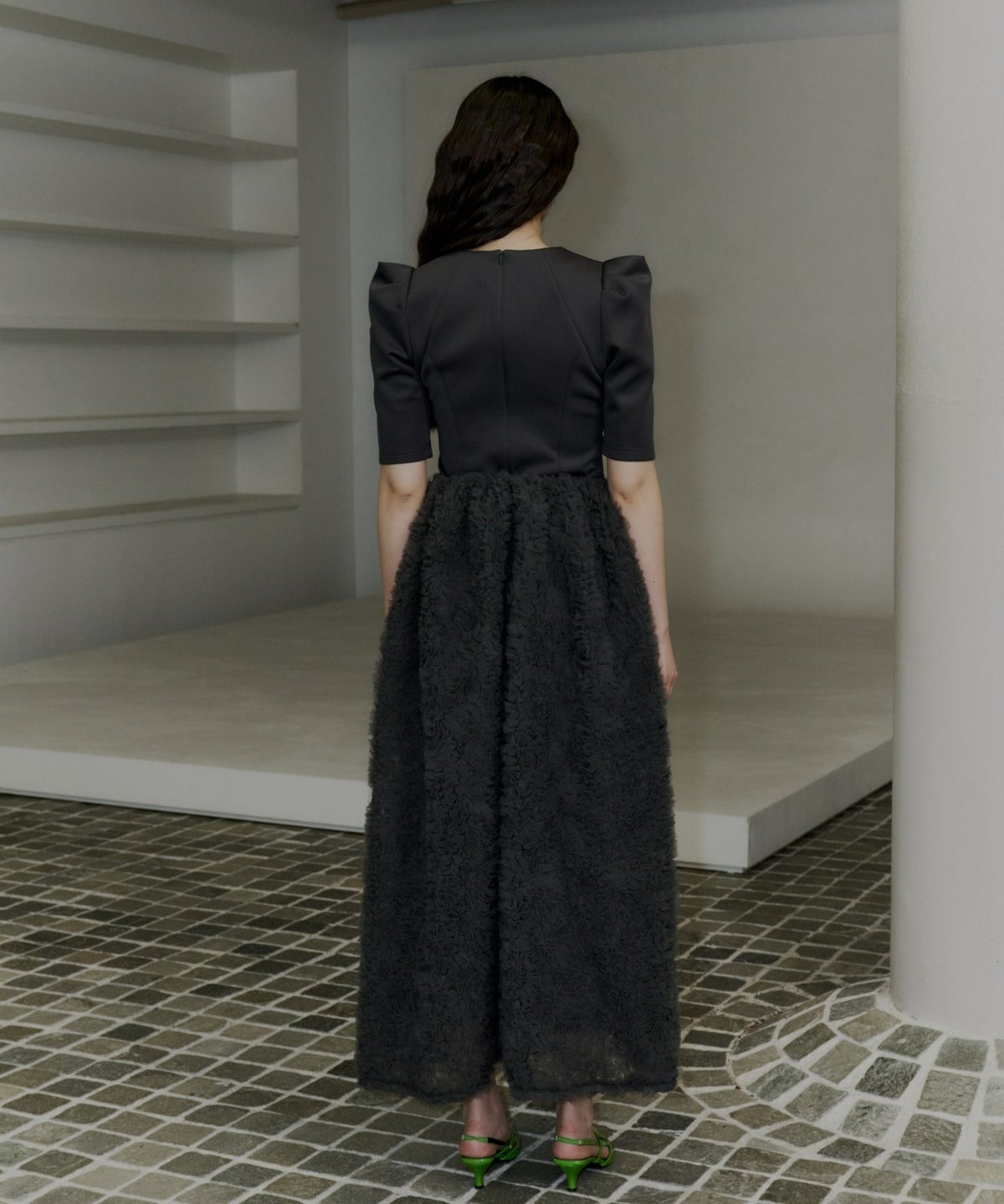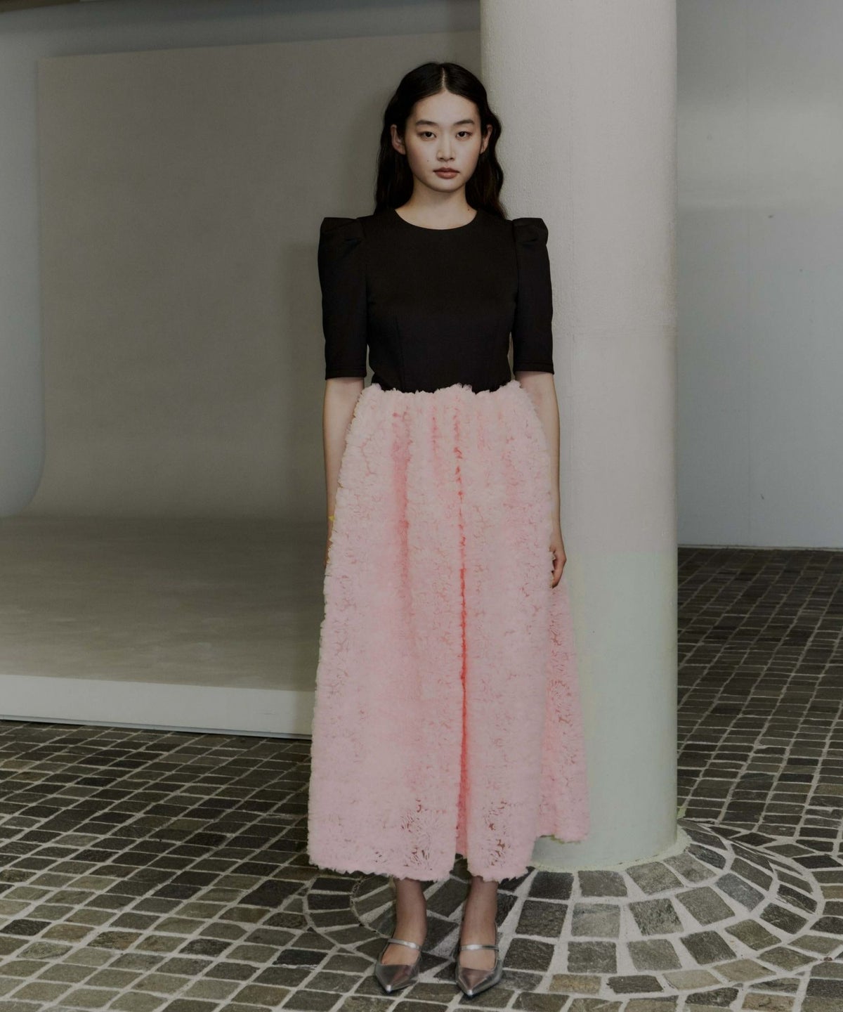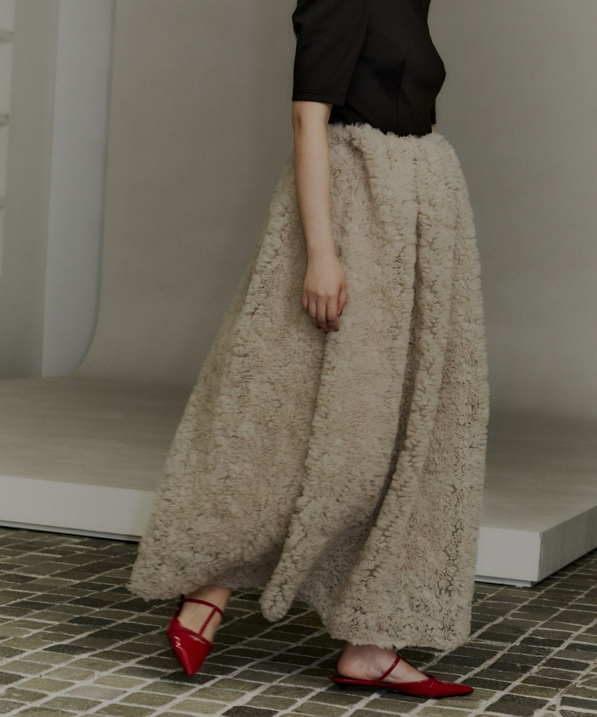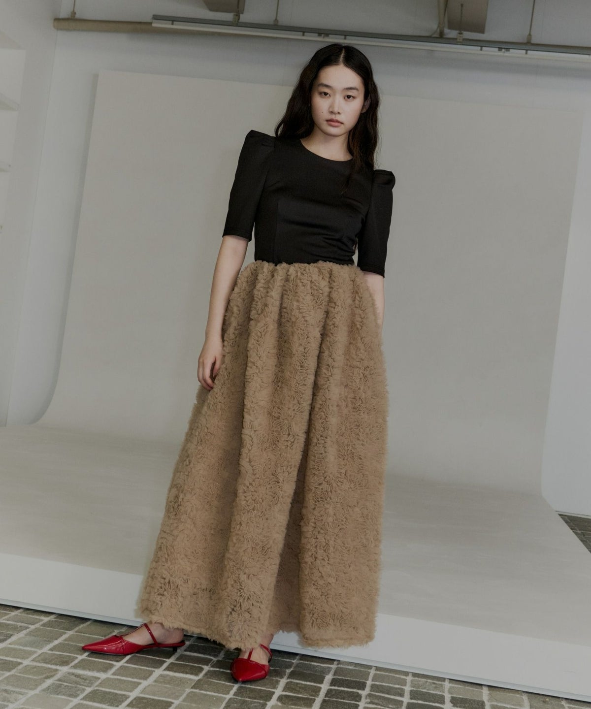 たっぷりのチュールを使ったふんわりフラワーチュール刺繍のもこもこスカートに、