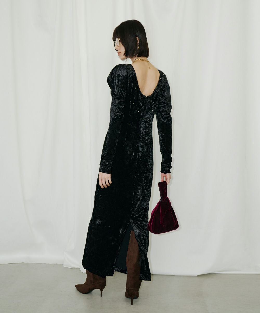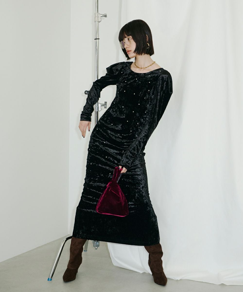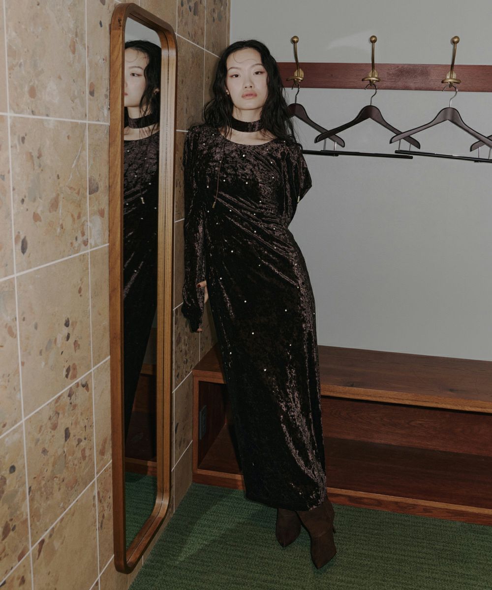 ベロア独特の柔らかいドレープが女っぽさを残してくれる絶妙なバランスのワンピース。