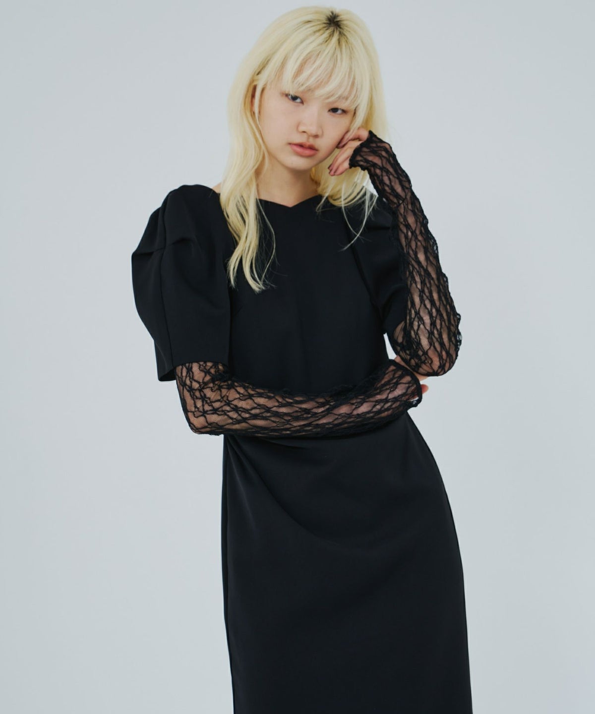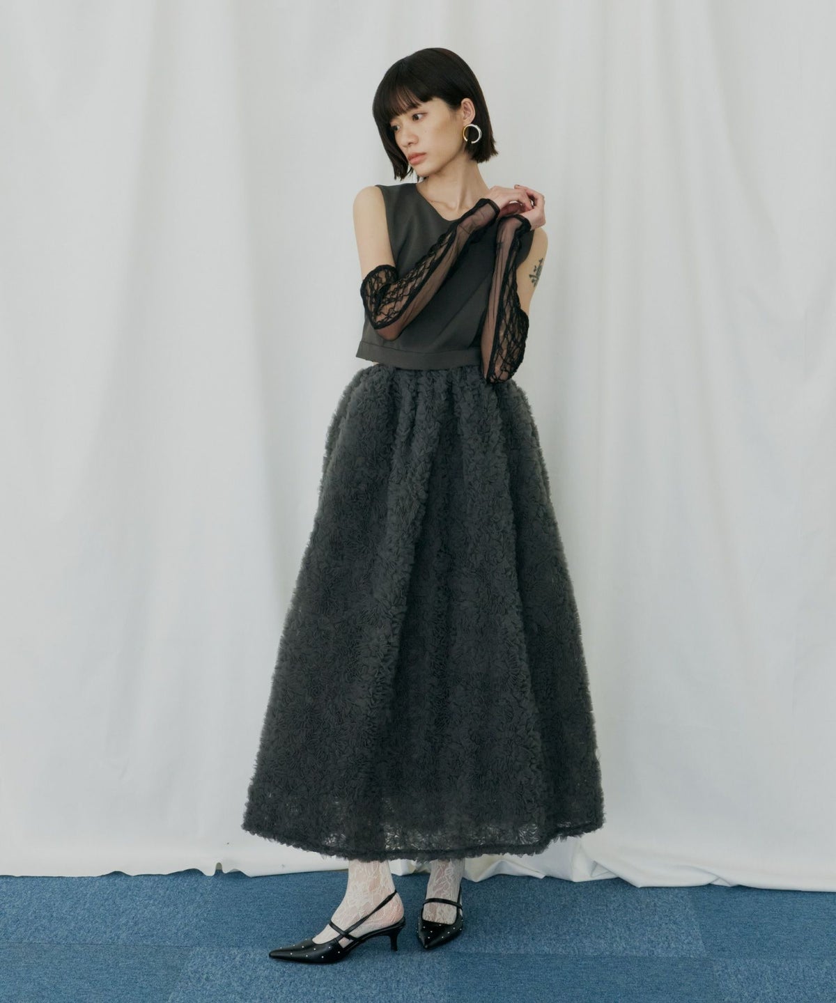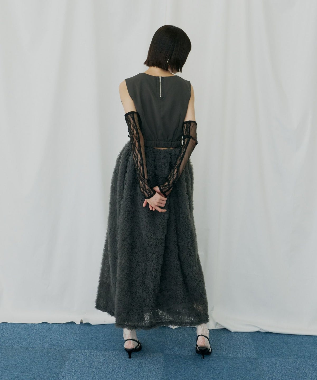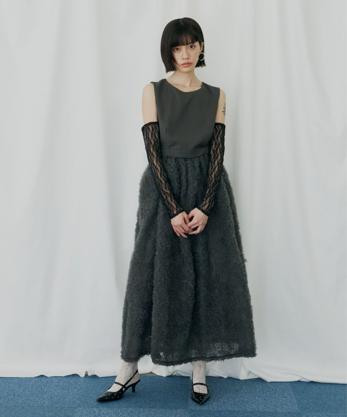ストレッチ性のある繊細レースとチュールの切り替えで異素材の組み合わせでデザインし