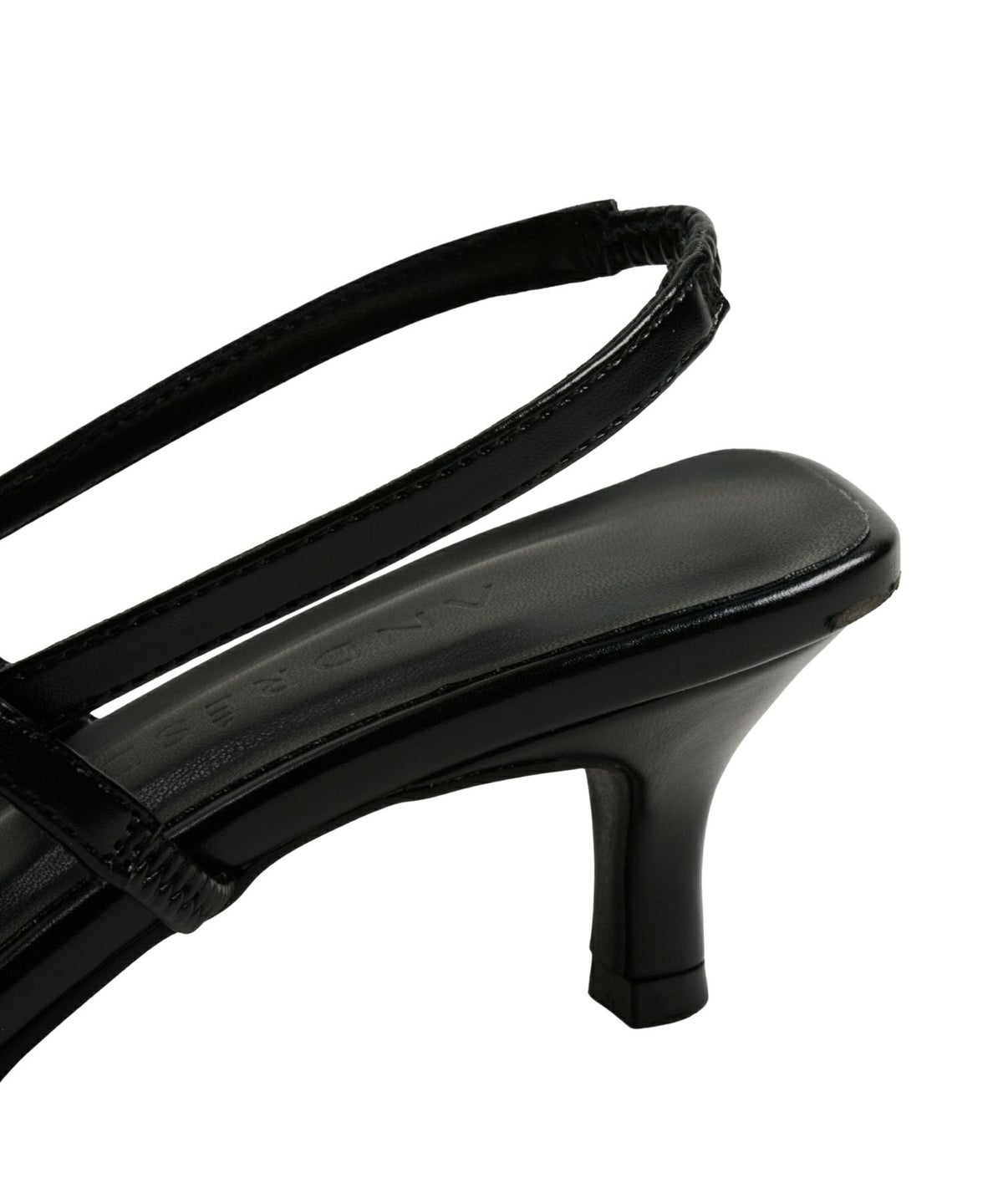 スクエアカットの履き口と踵がモードな印象をプラスしつつ、フロントストラップがしっかりと足をホールド。