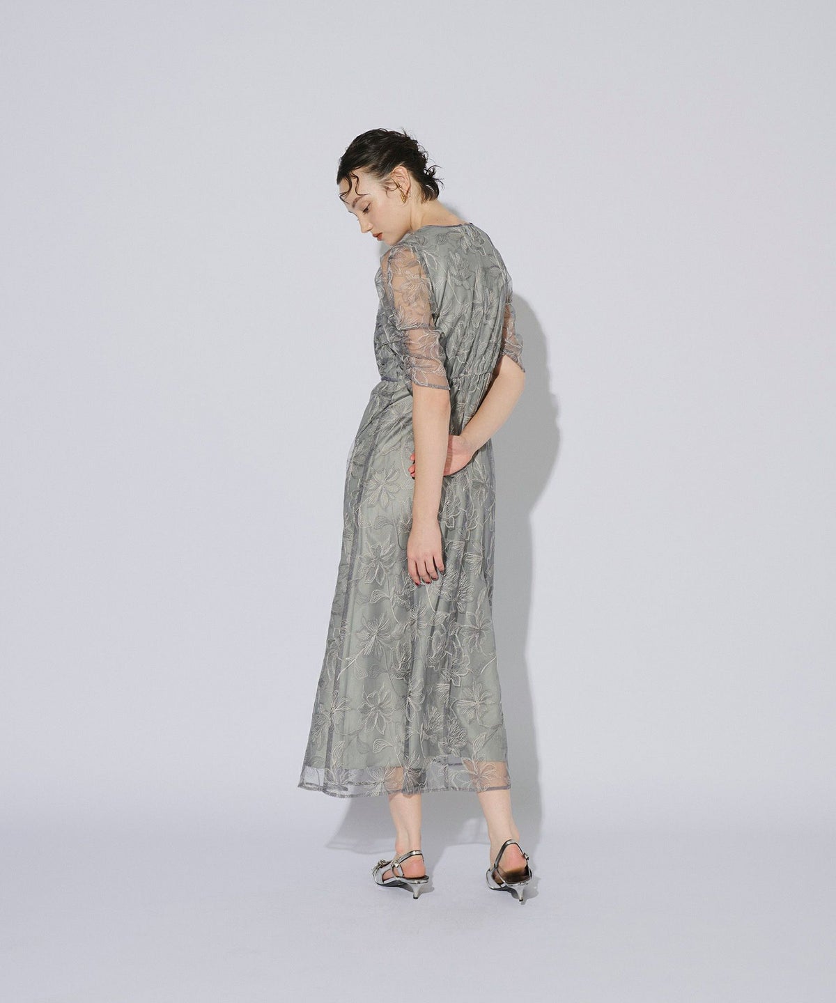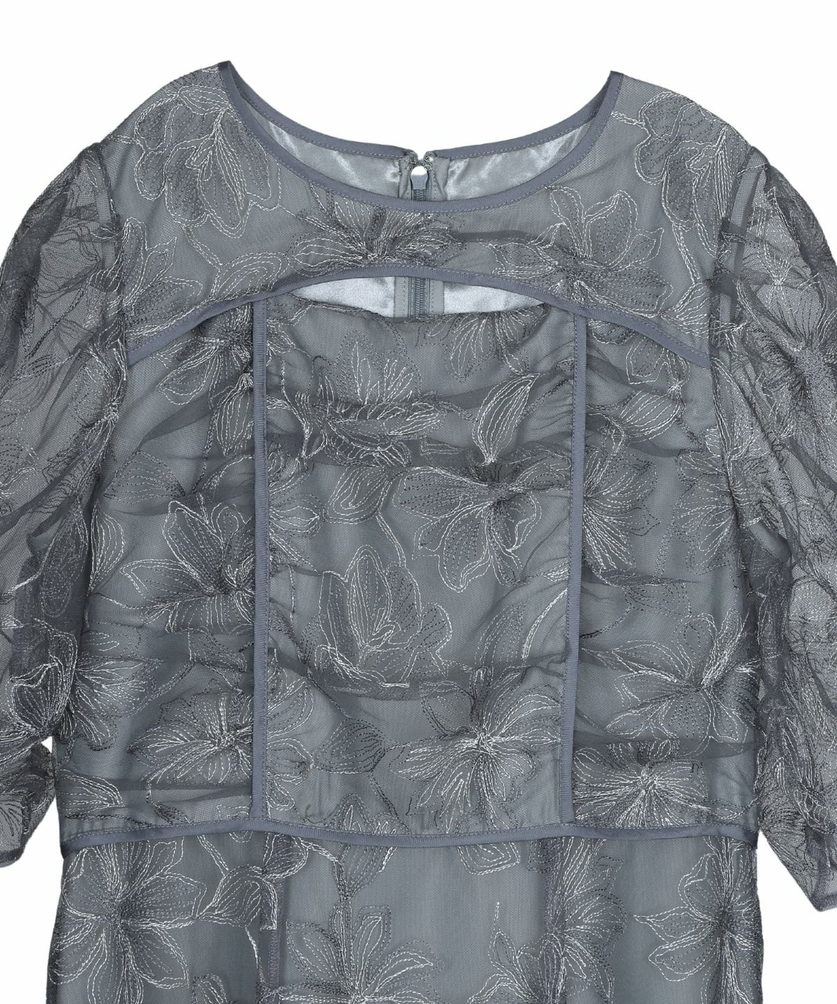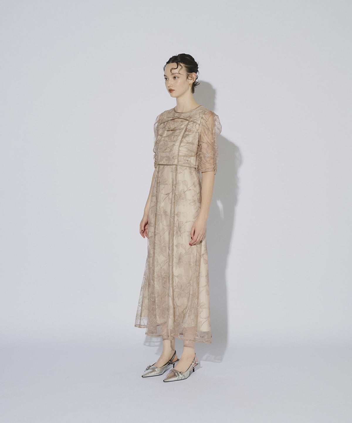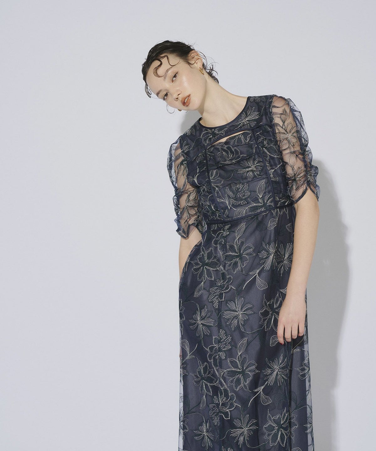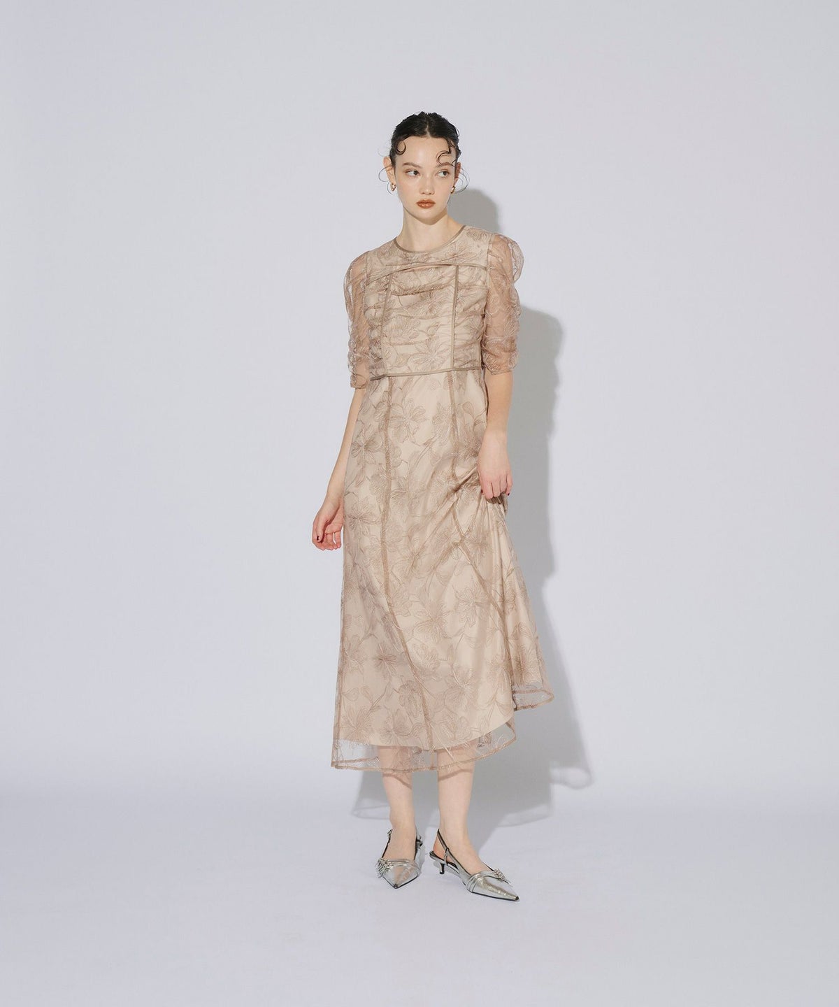 チュール素材に、甘すぎないフラワー柄を刺繍した素材を使用。