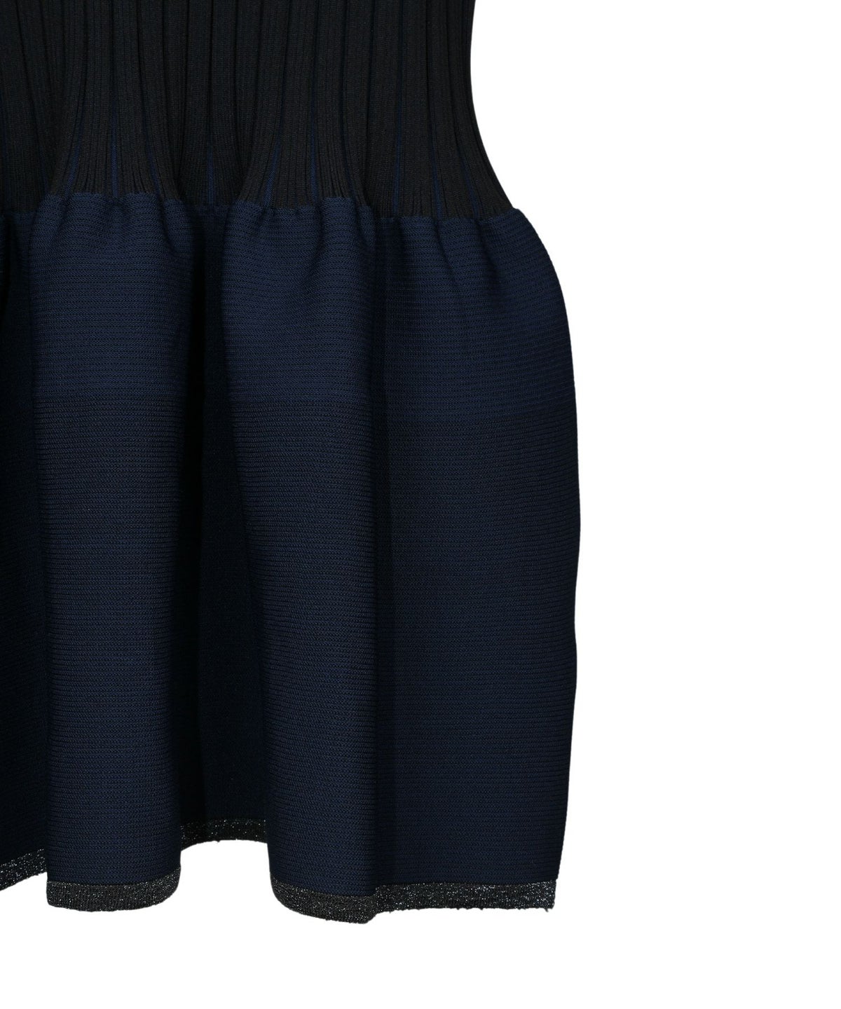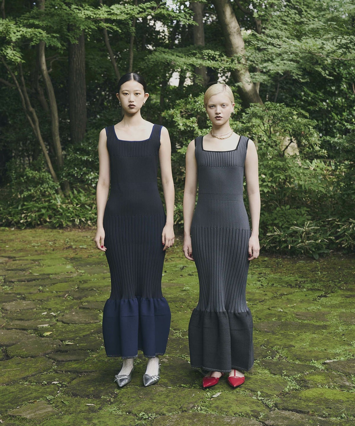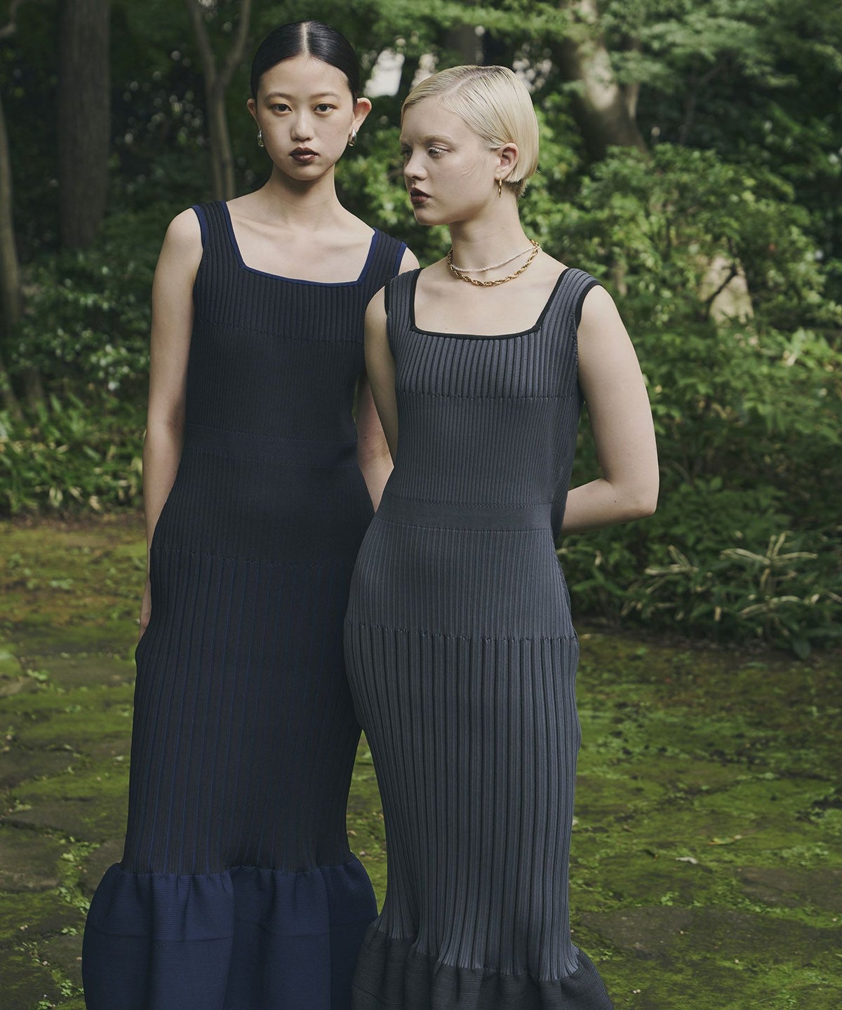 からだにフィットする部分と裾部分のフォルムがつくる、コントラストあるシルエットが特徴的。