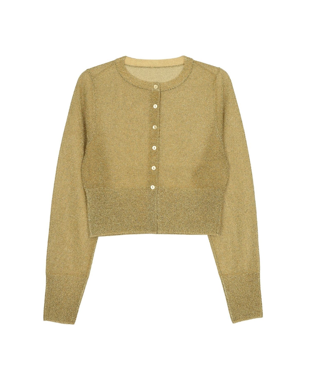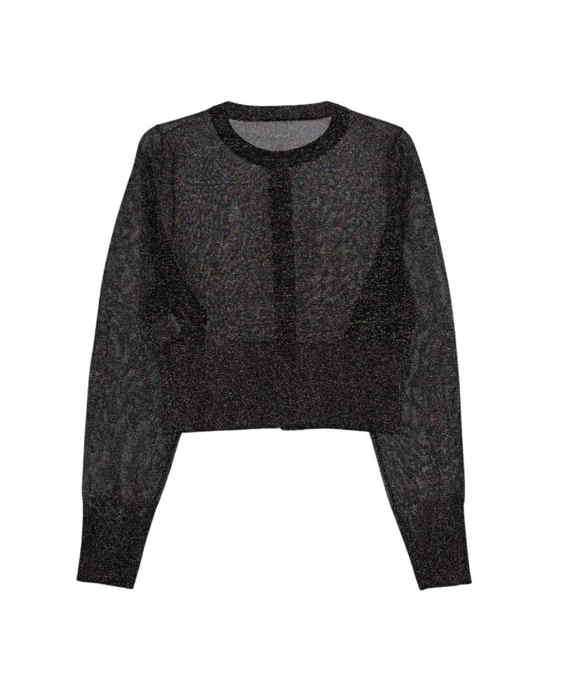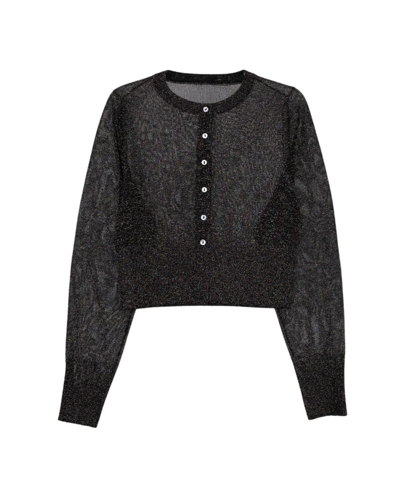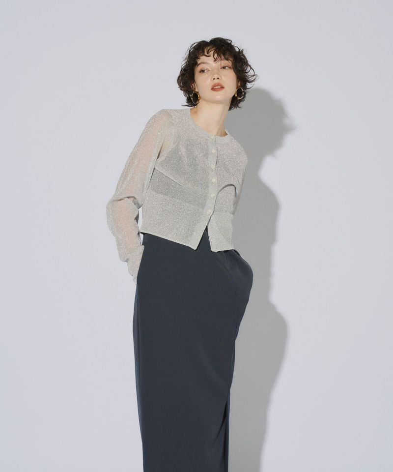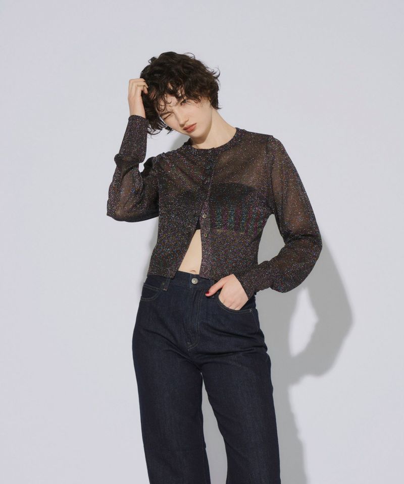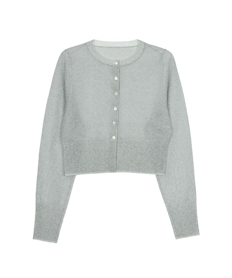 繊細な透け感のある糸にラメ糸を編み込んだ、キラキラが目を惹くニットカーディガン。
