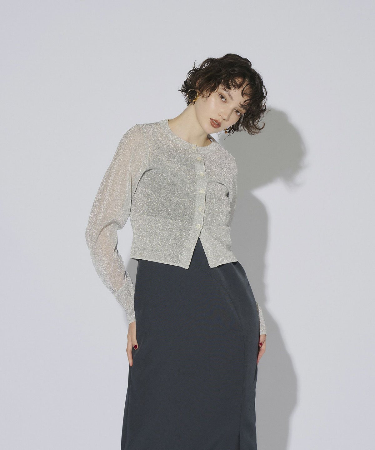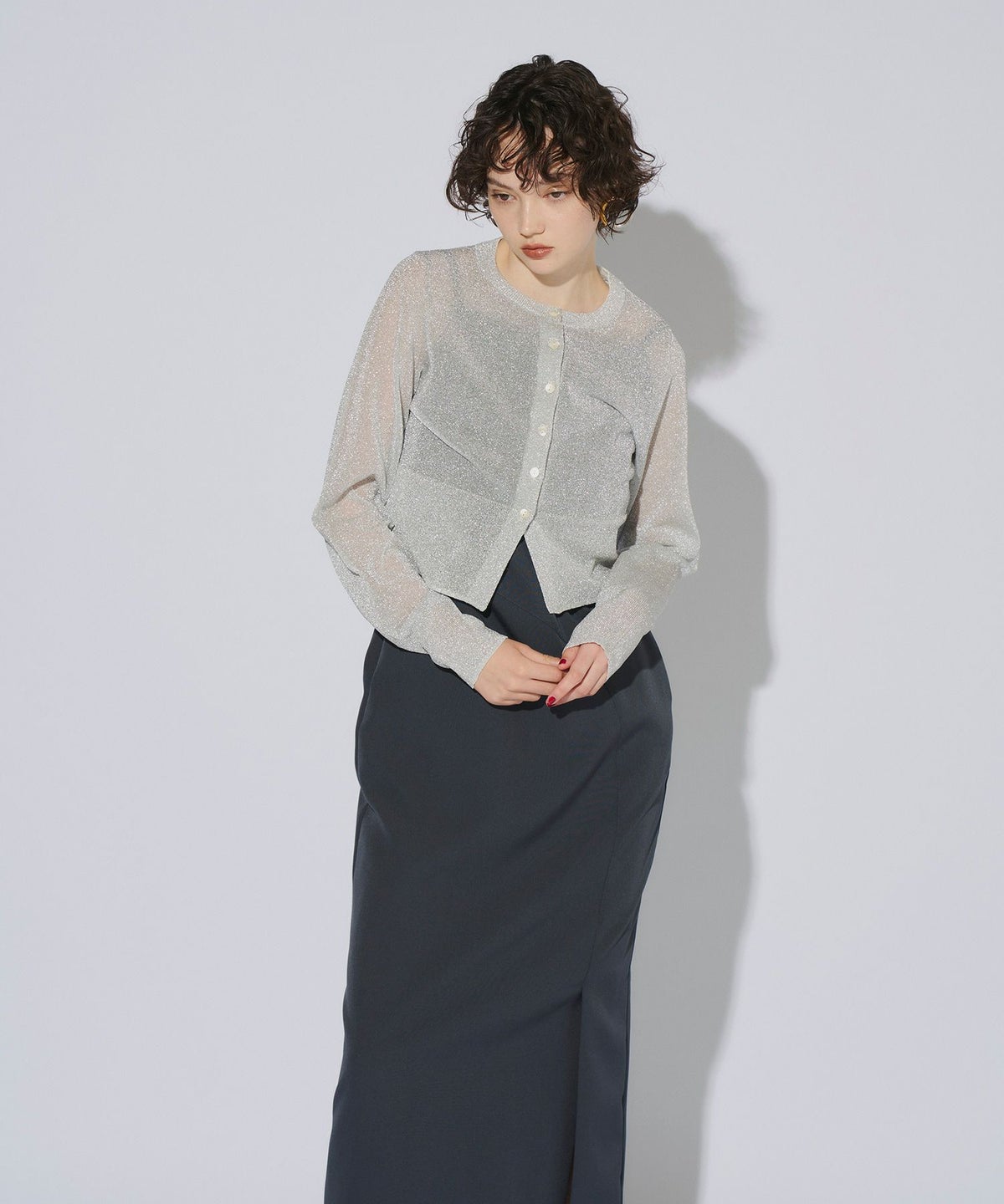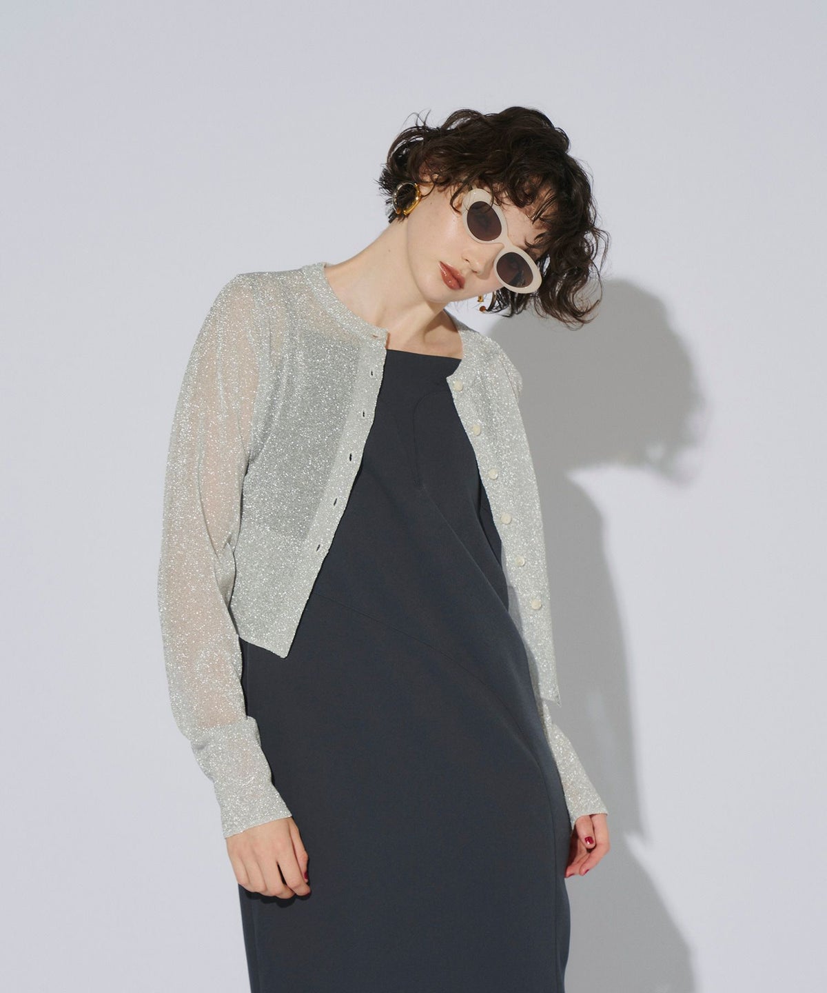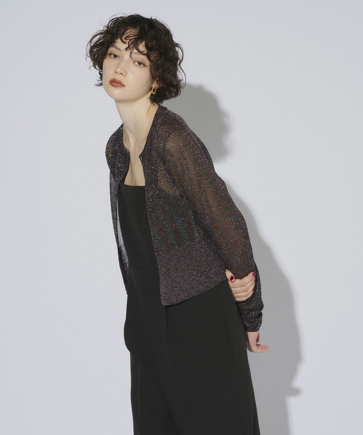 繊細な透け感のある糸にラメ糸を編み込んだ、キラキラが目を惹くニットカーディガン。