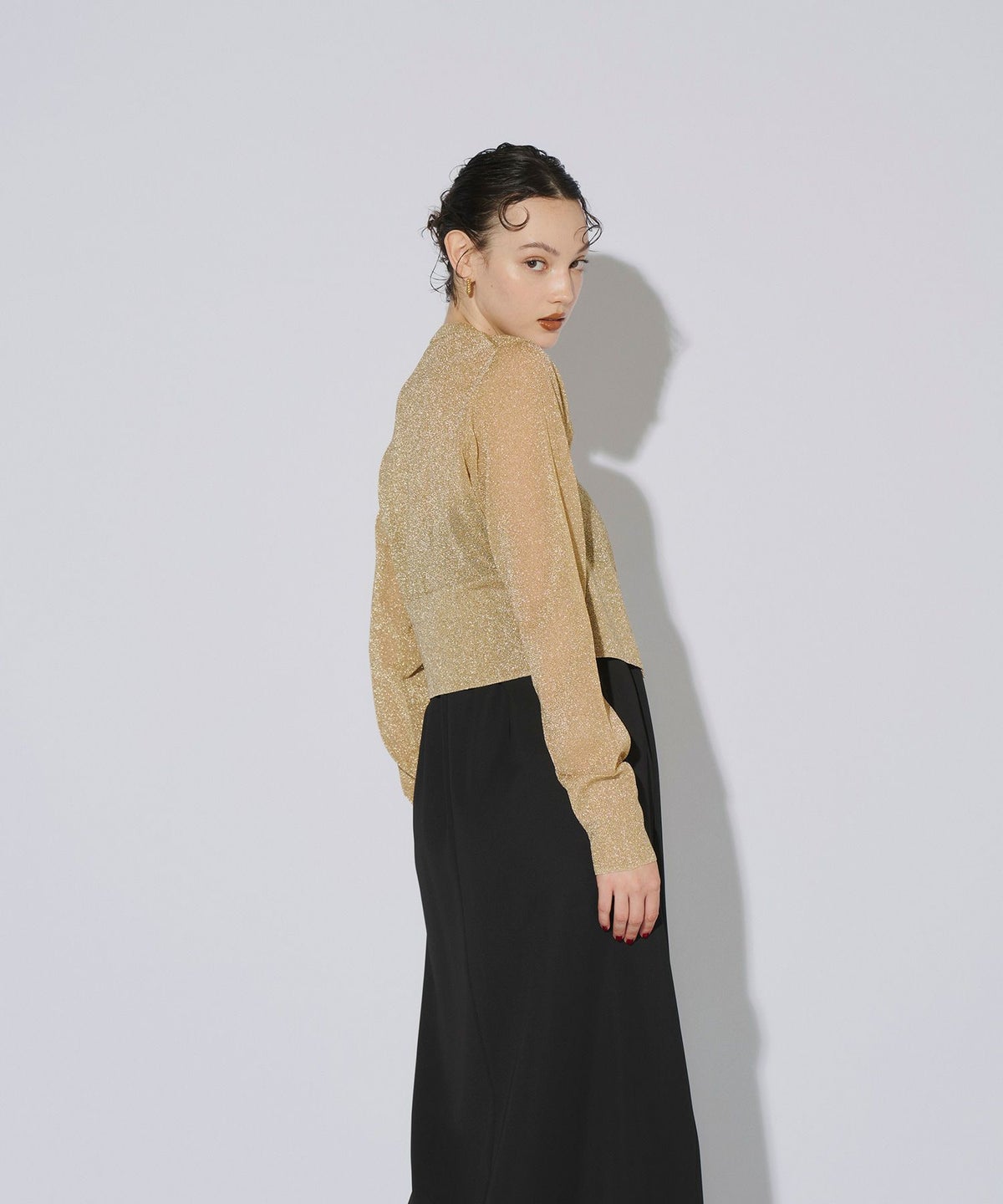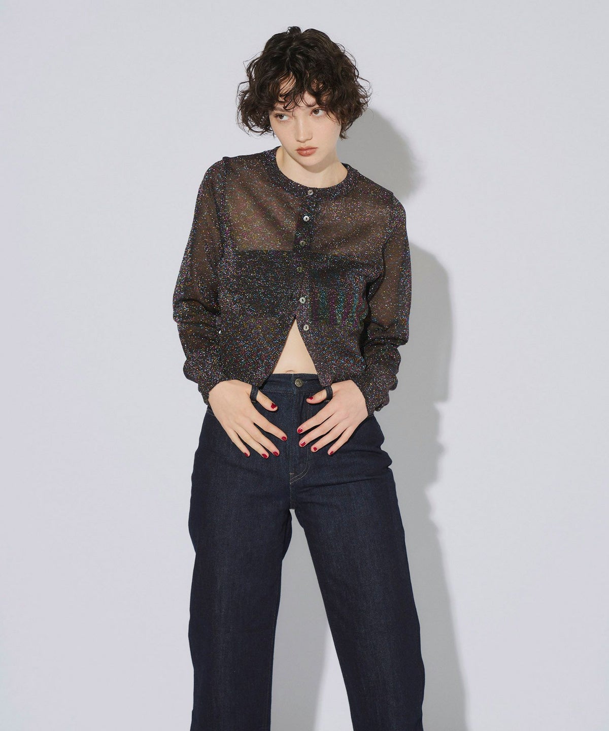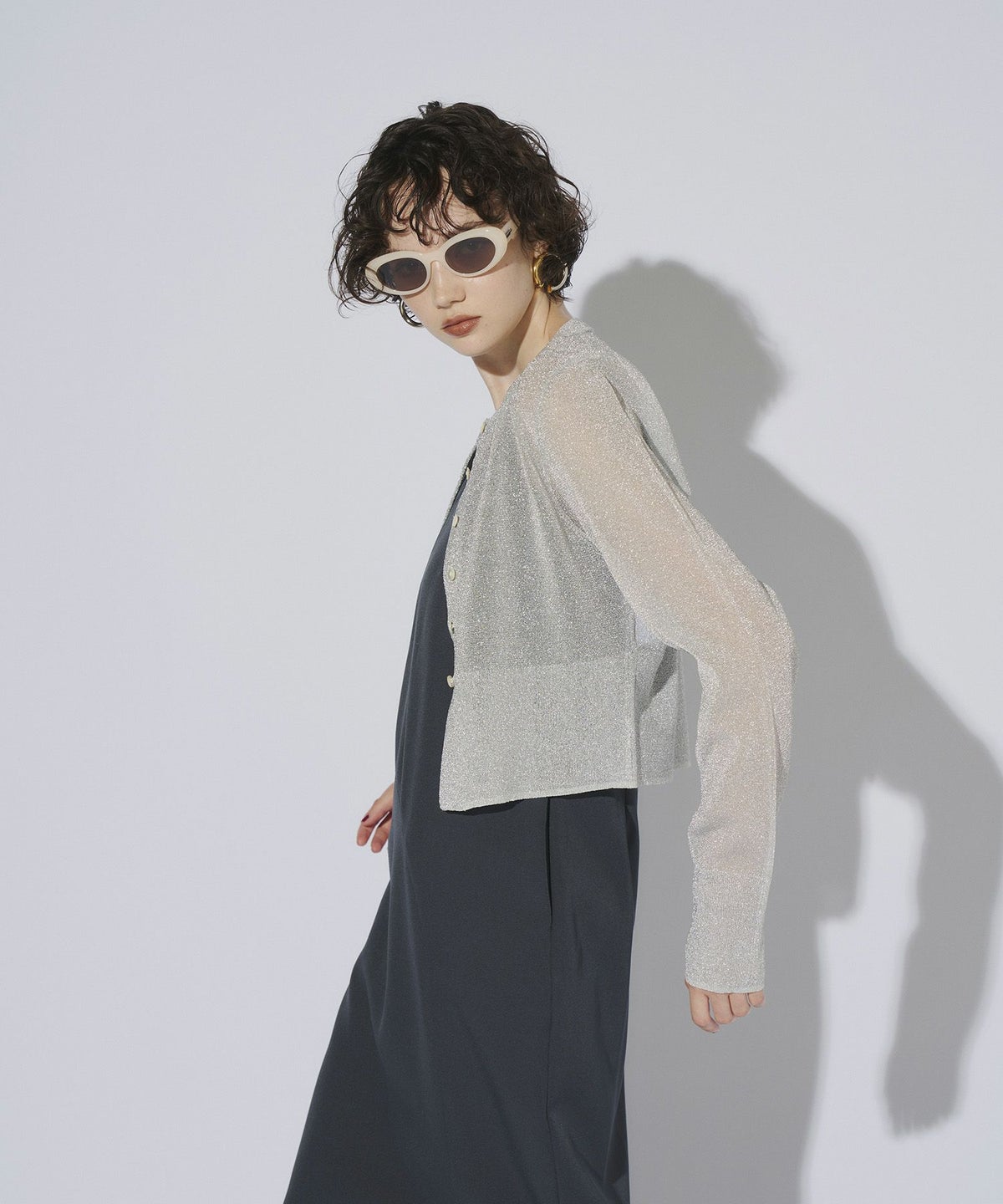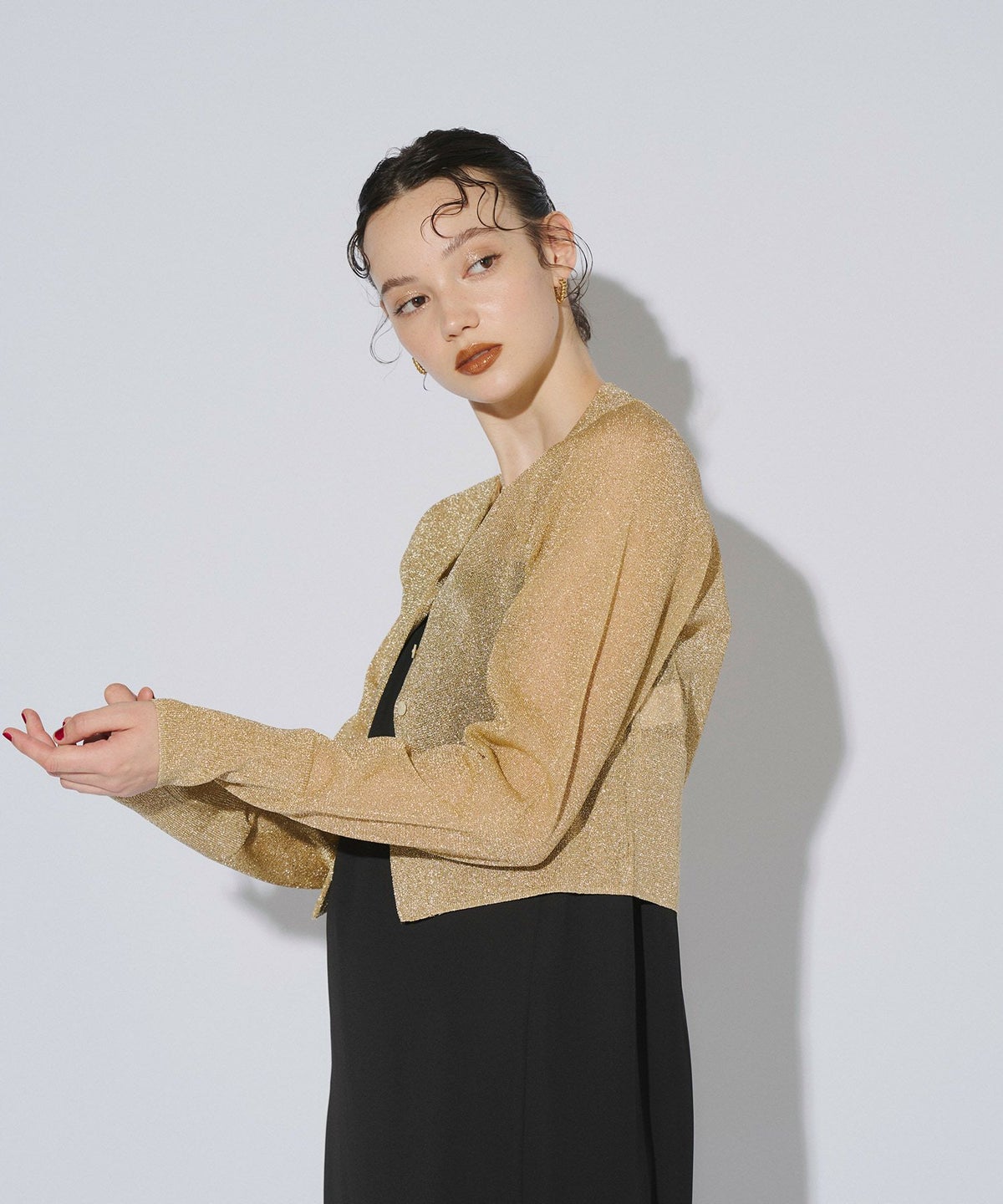 繊細な透け感のある糸にラメ糸を編み込んだ、キラキラが目を惹くニットカーディガン。