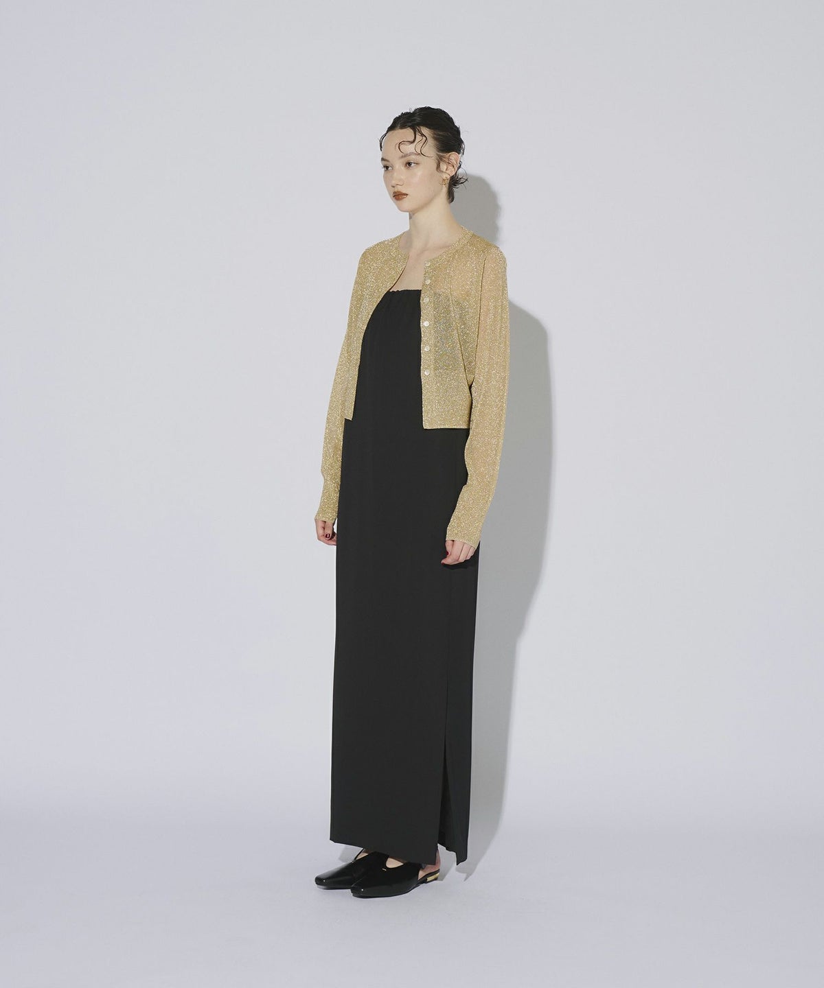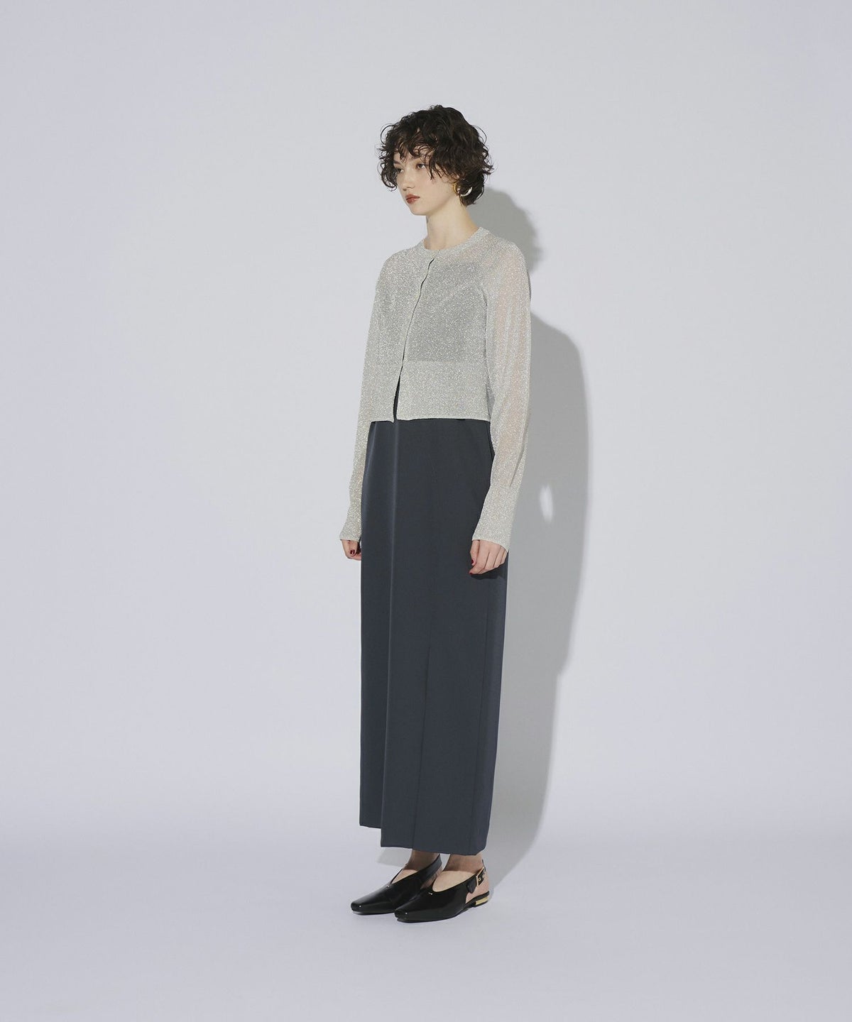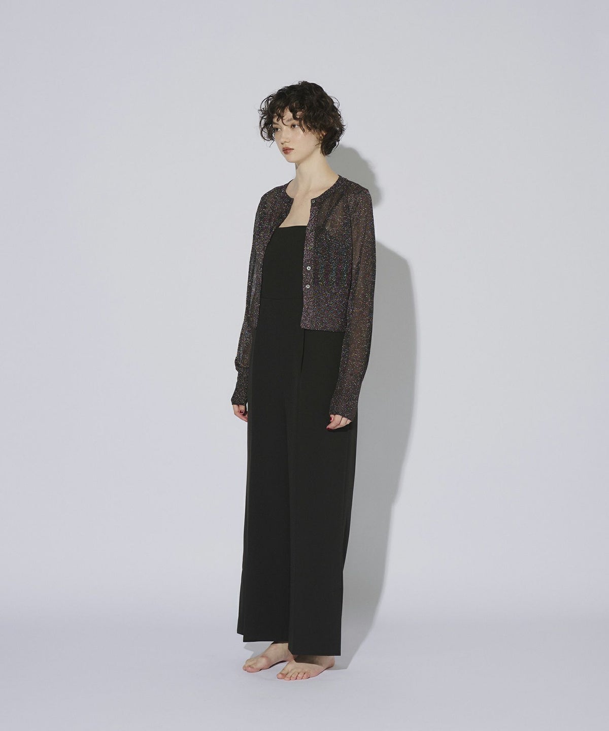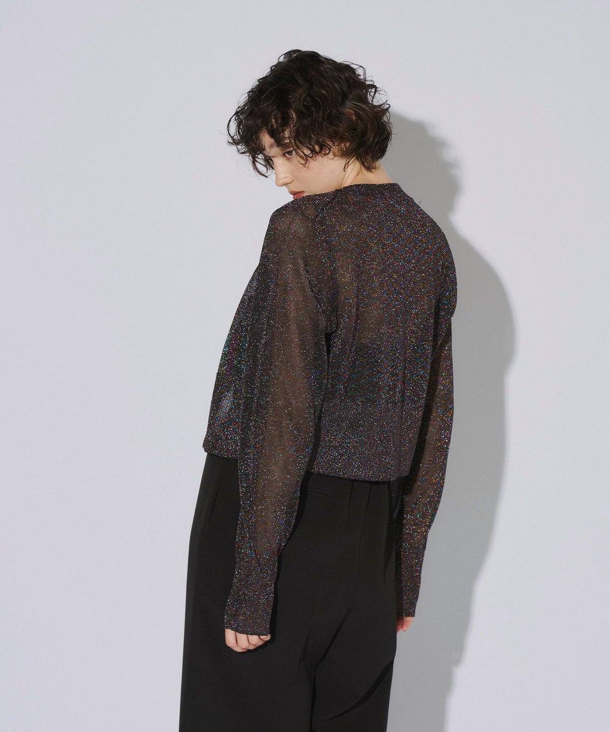 繊細な透け感のある糸にラメ糸を編み込んだ、キラキラが目を惹くニットカーディガン。