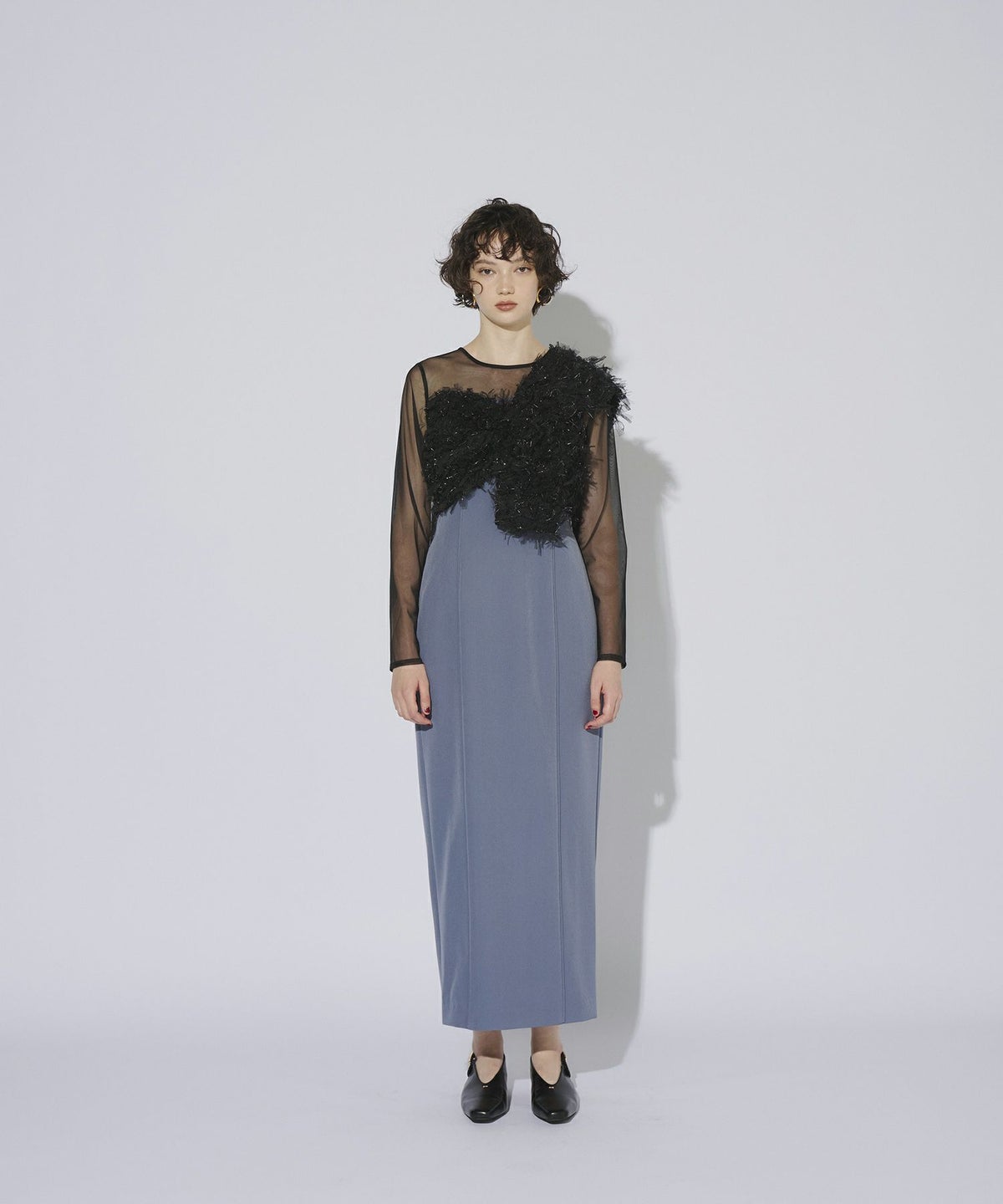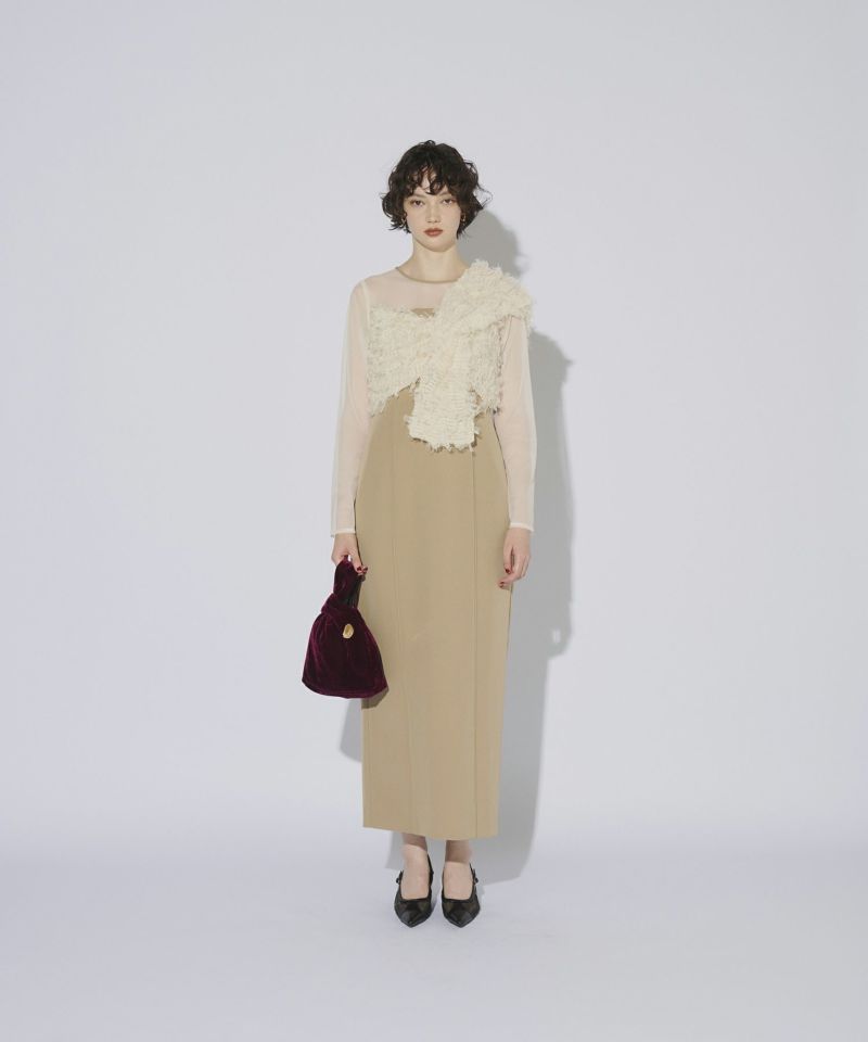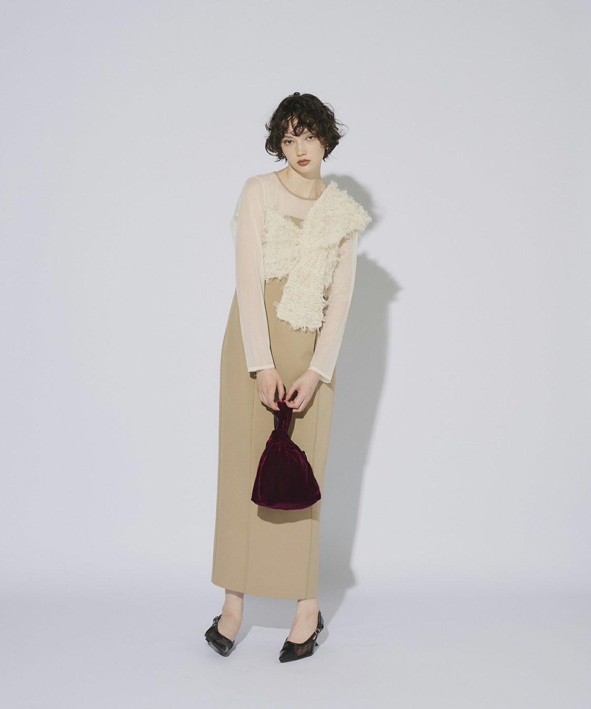 ノットデザインのトップにはラメ糸と光沢糸をMIXしたチュールフリンジ素材を使用。