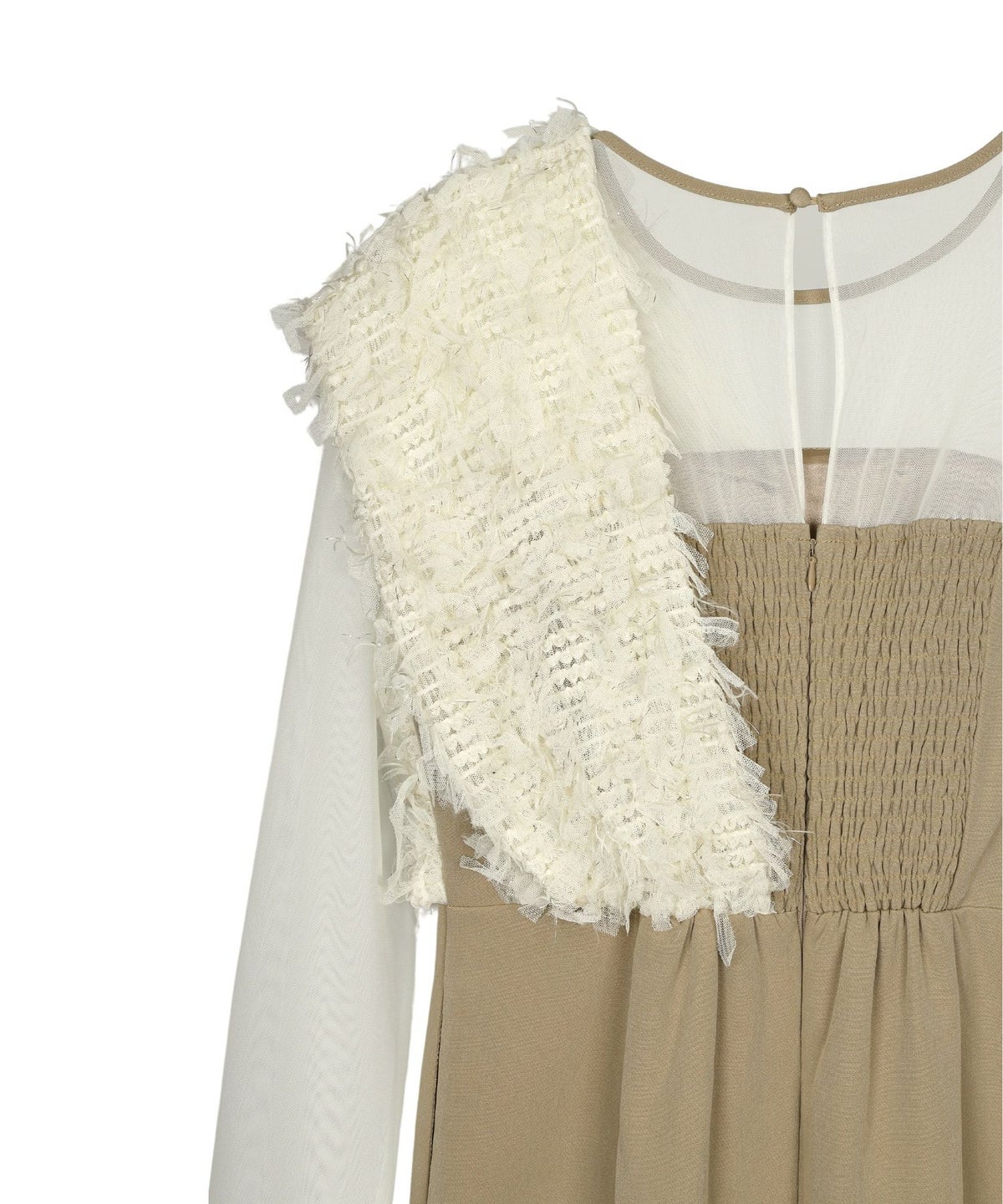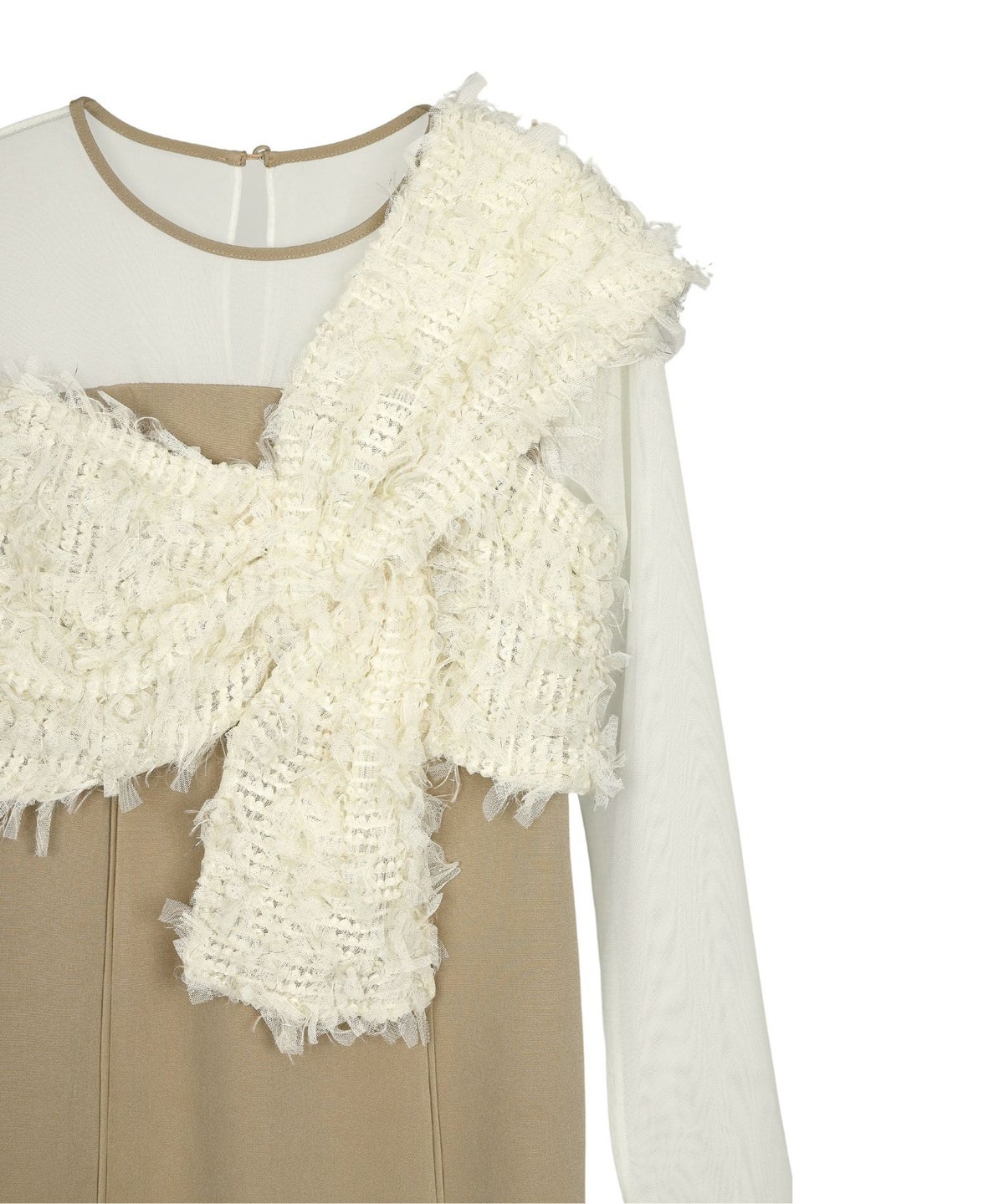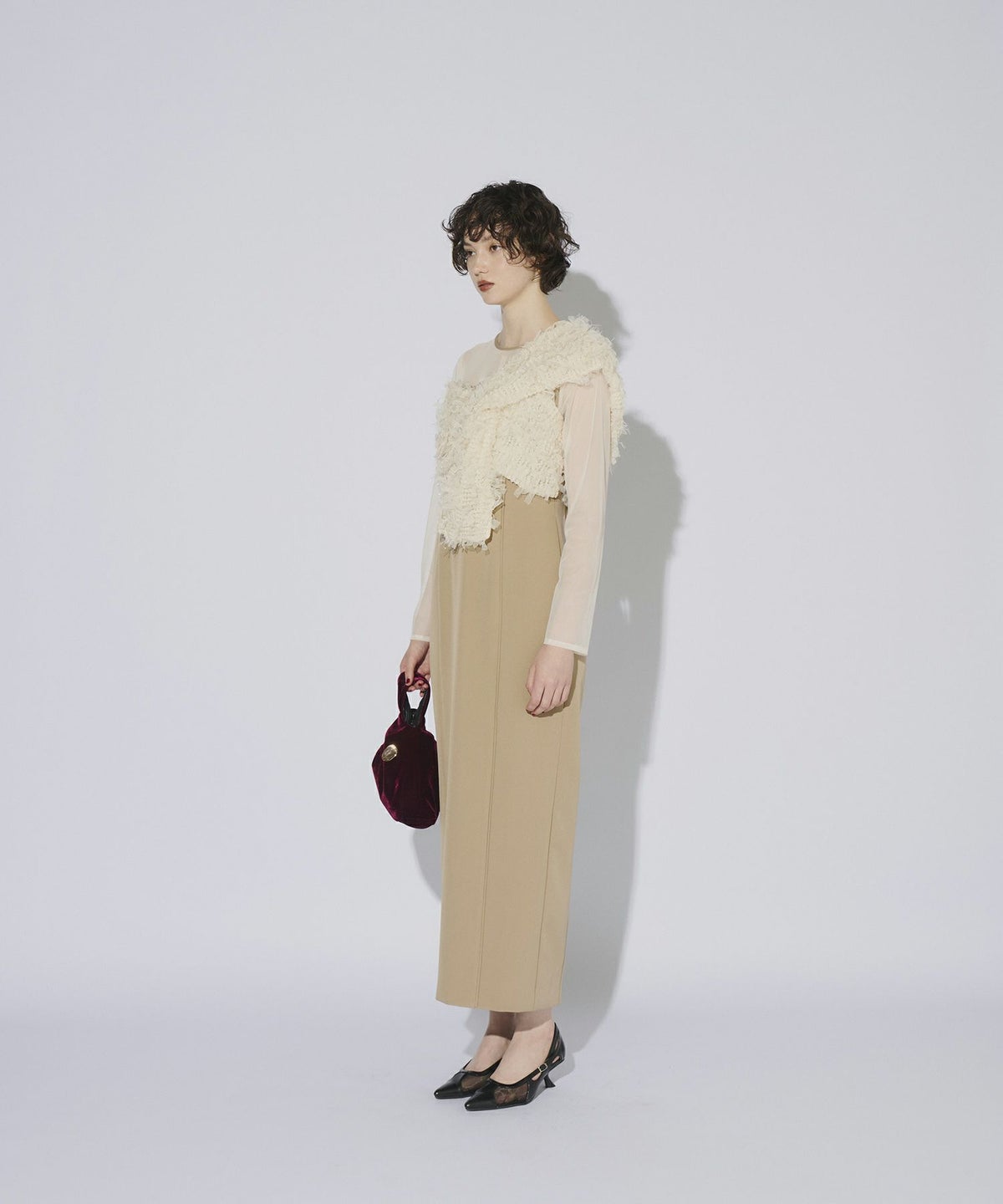 ノットデザインのトップにはラメ糸と光沢糸をMIXしたチュールフリンジ素材を使用。