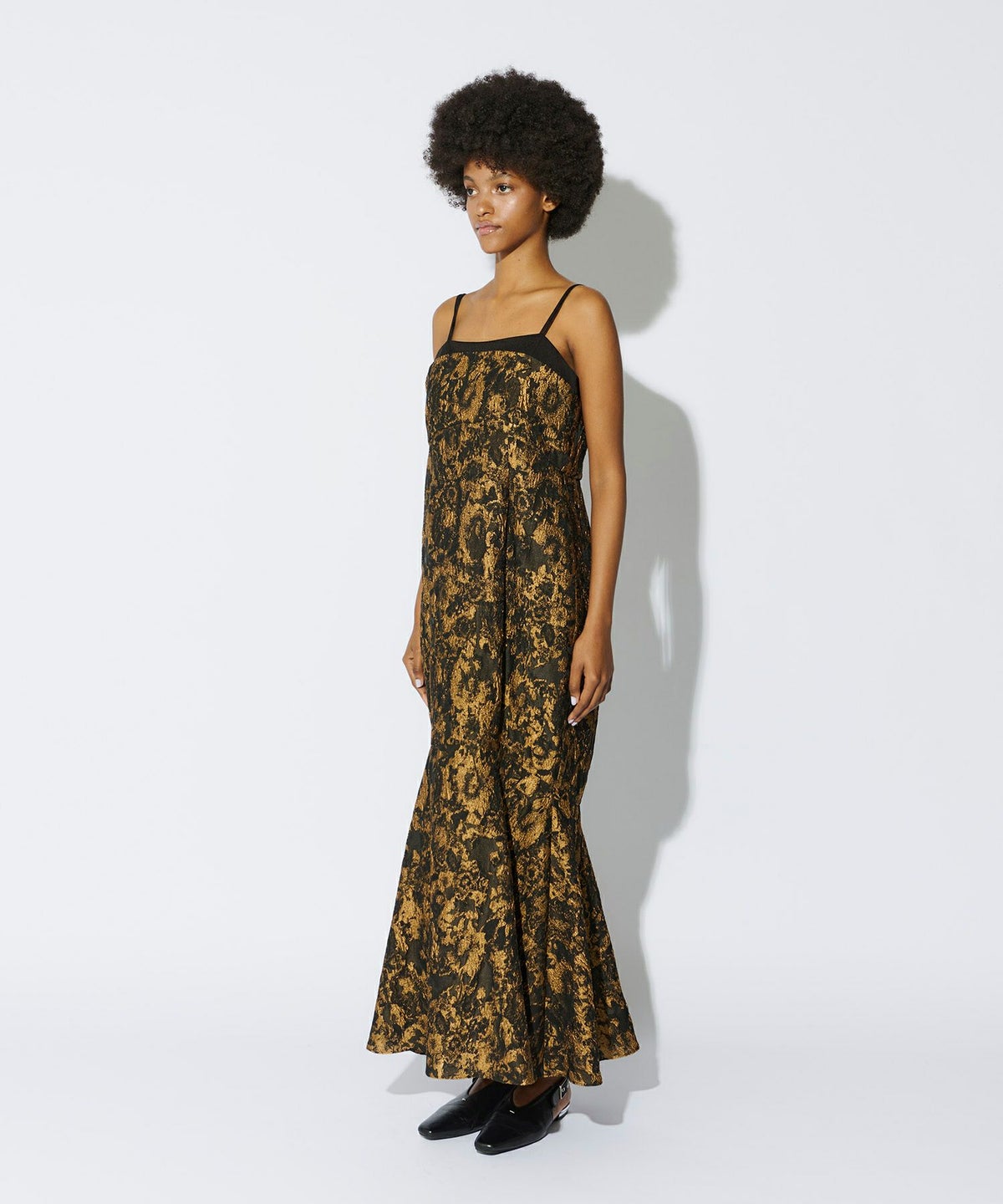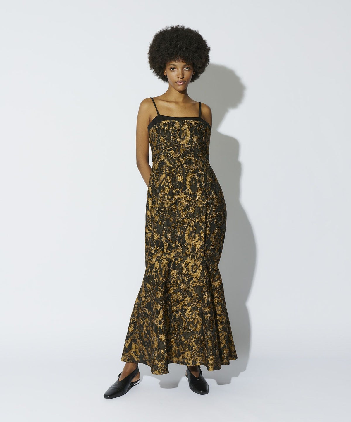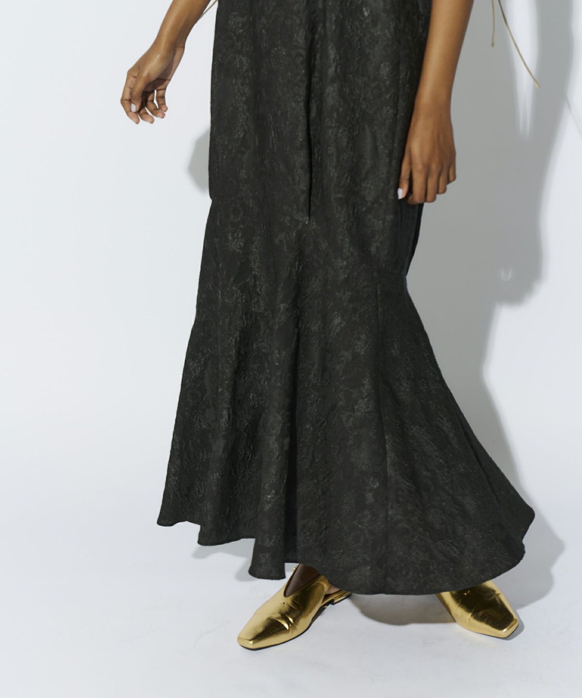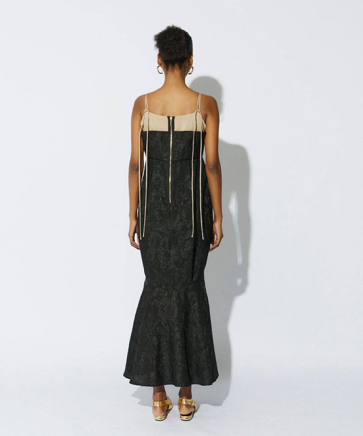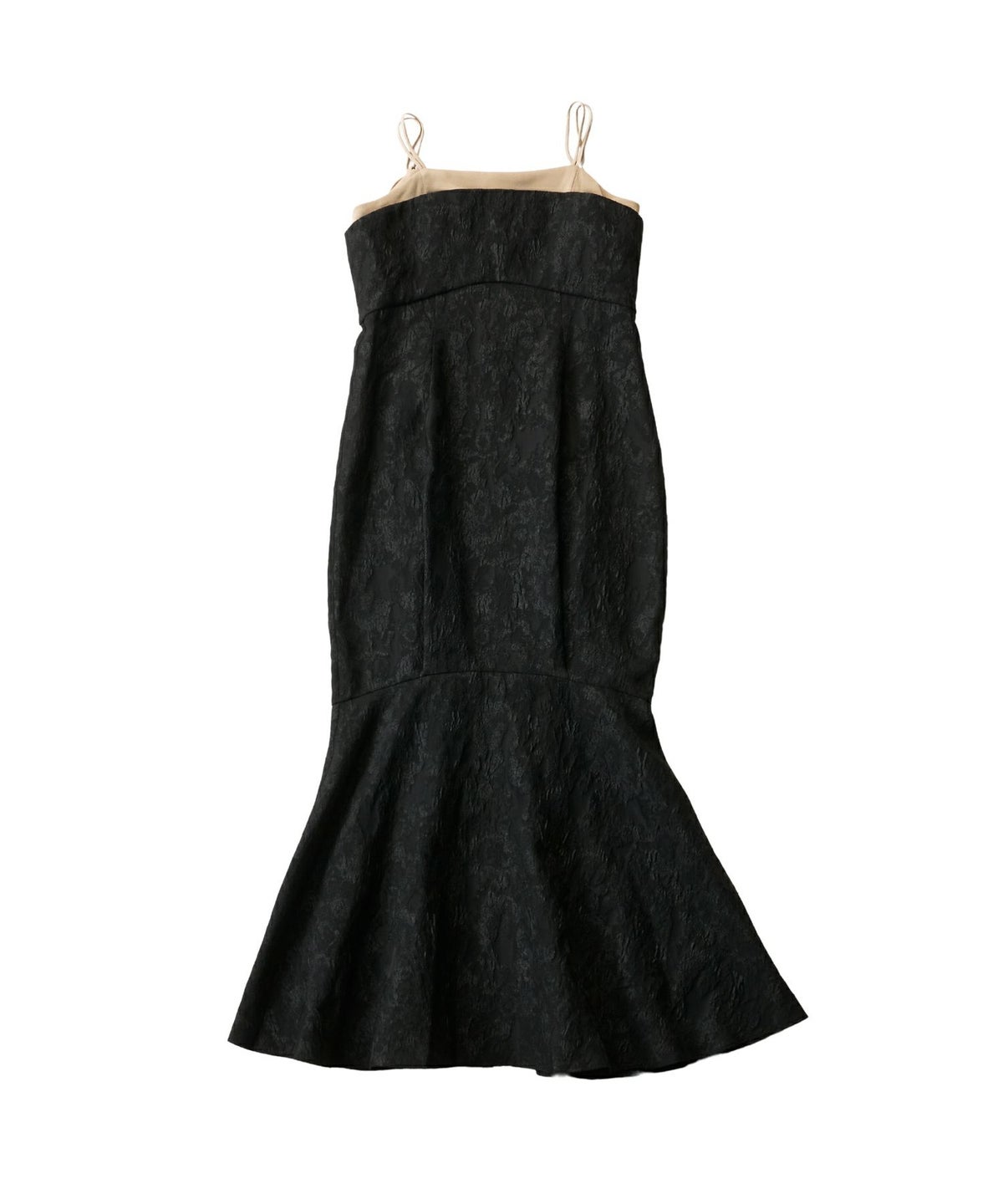 光沢糸を織り交ぜたジャカード素材が上品な華やかさを演出し、無地サテンのアクセントが洗練された印象をプラスする、ユニークなフォルムのマーメイドドレス。