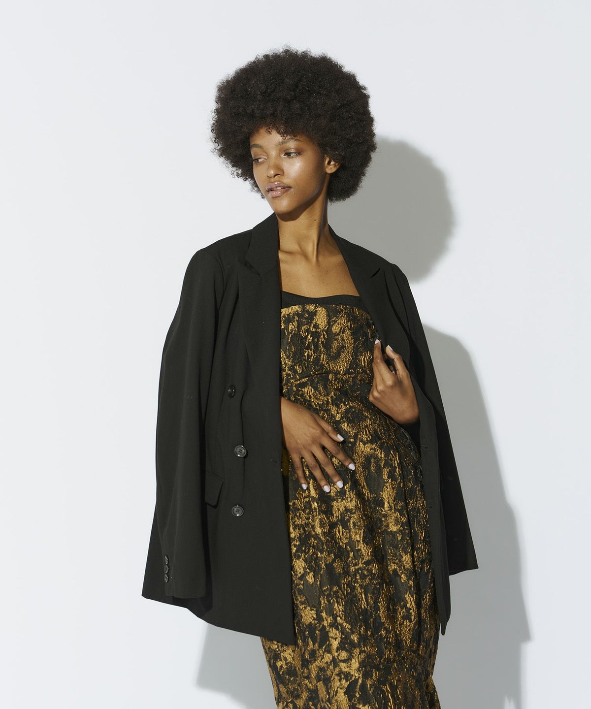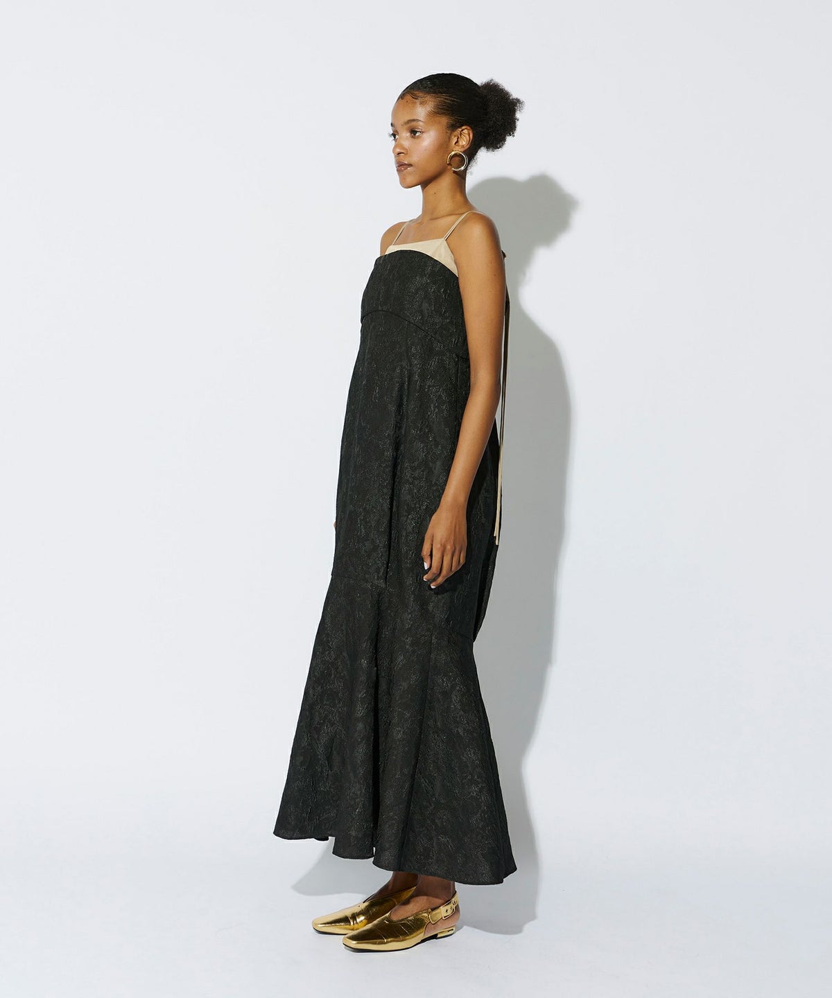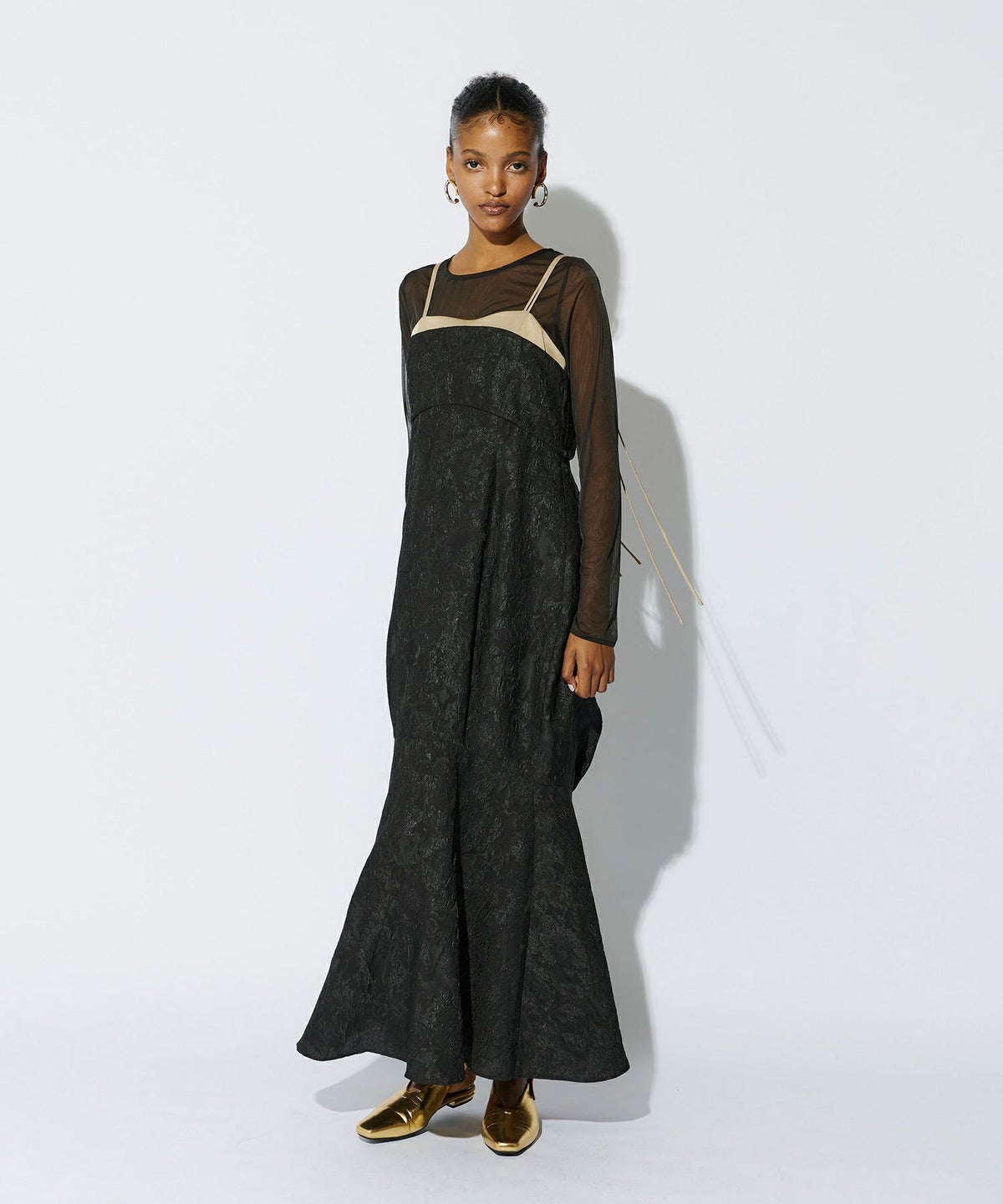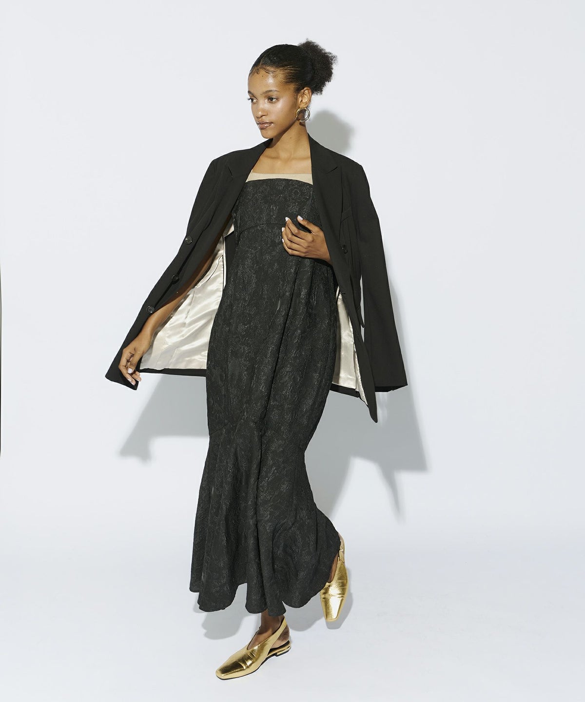 軽くハリのある生地を使用し、構築的なデザインに仕立てることで、体を包み込むようなシルエットの中にもくびれをしっかりと強調し、モードすぎずスタイリッシュなバランスを叶えました。