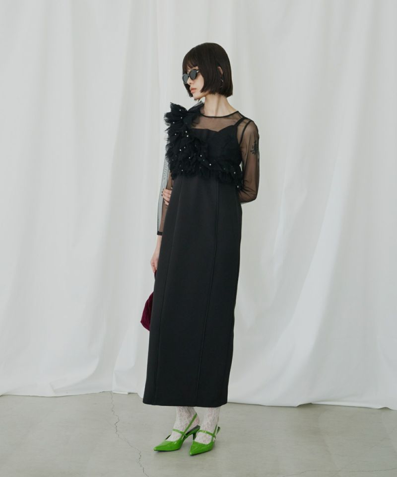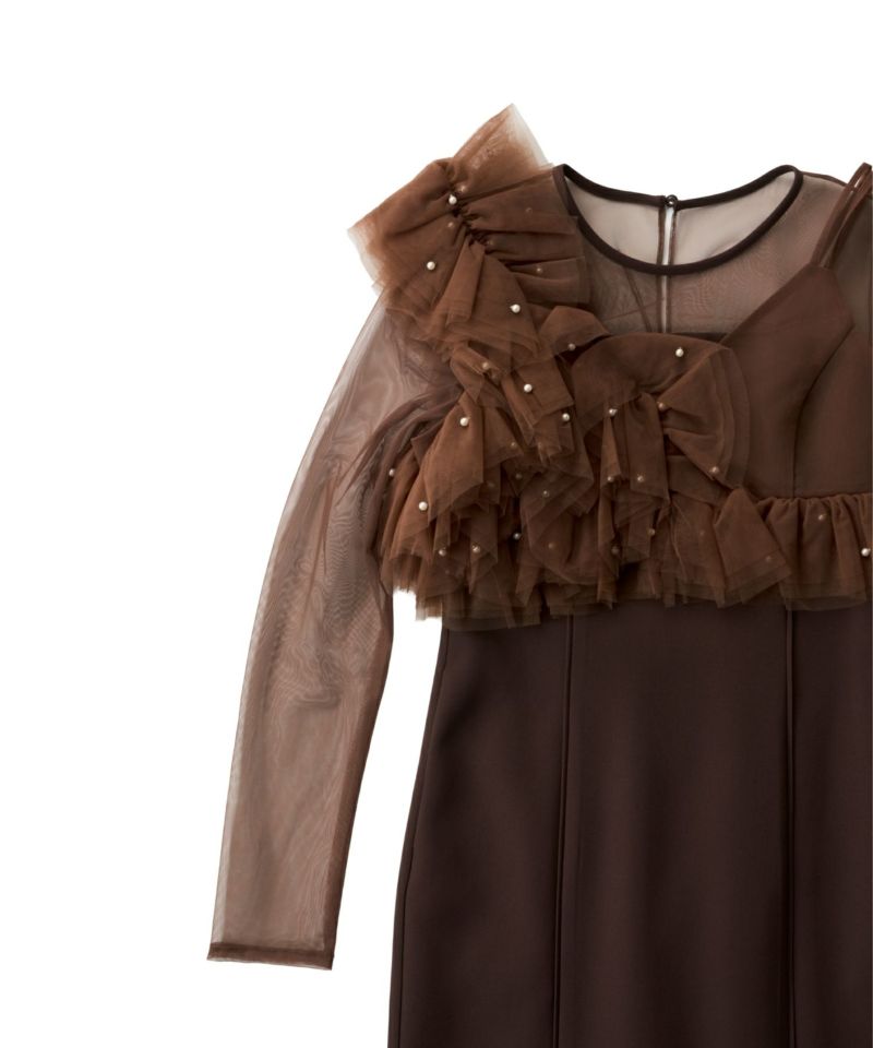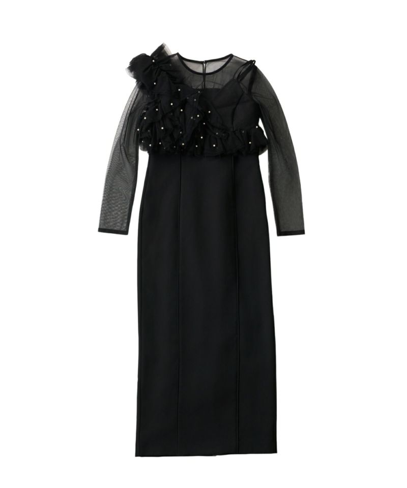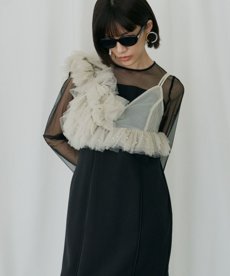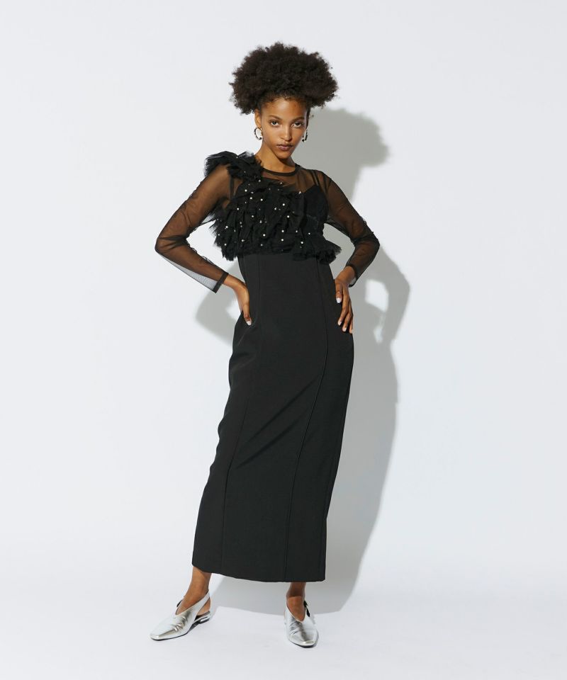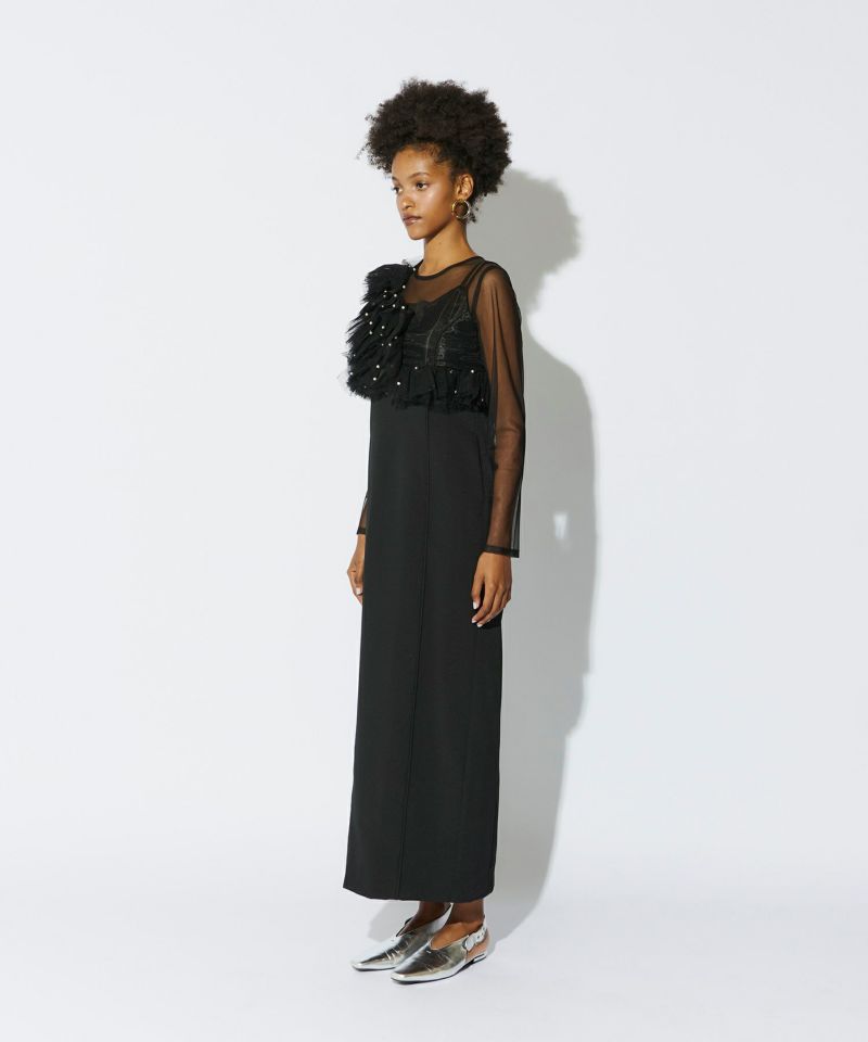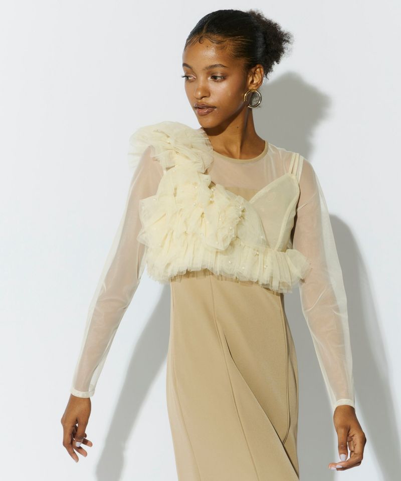 ビスチェにはランダムに散りばめたパールが目を惹くチュール生地を採用。