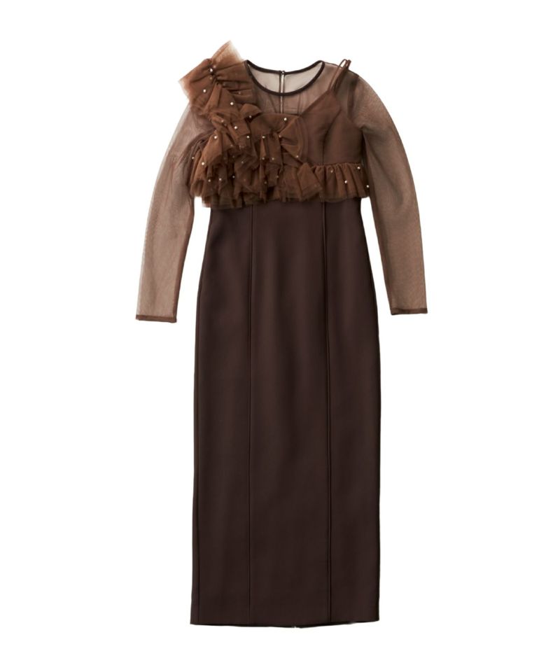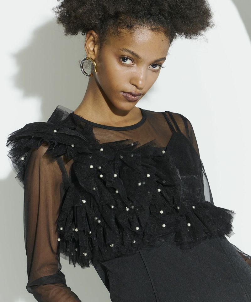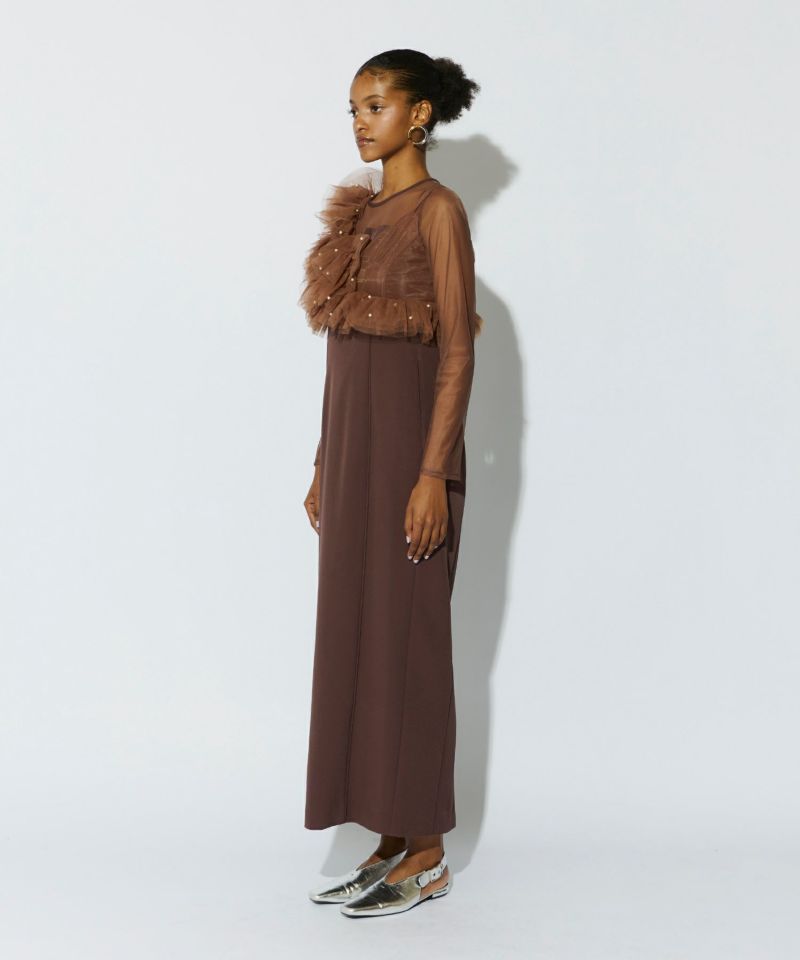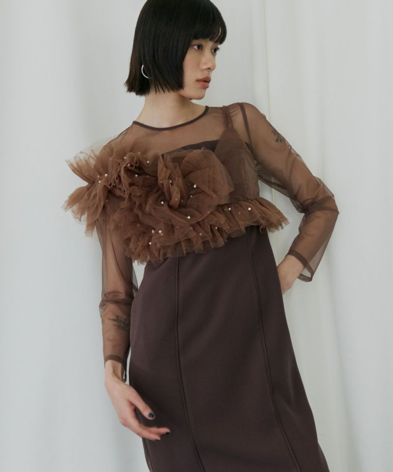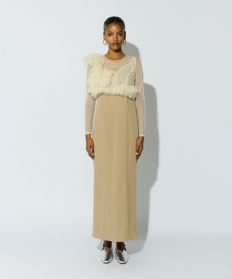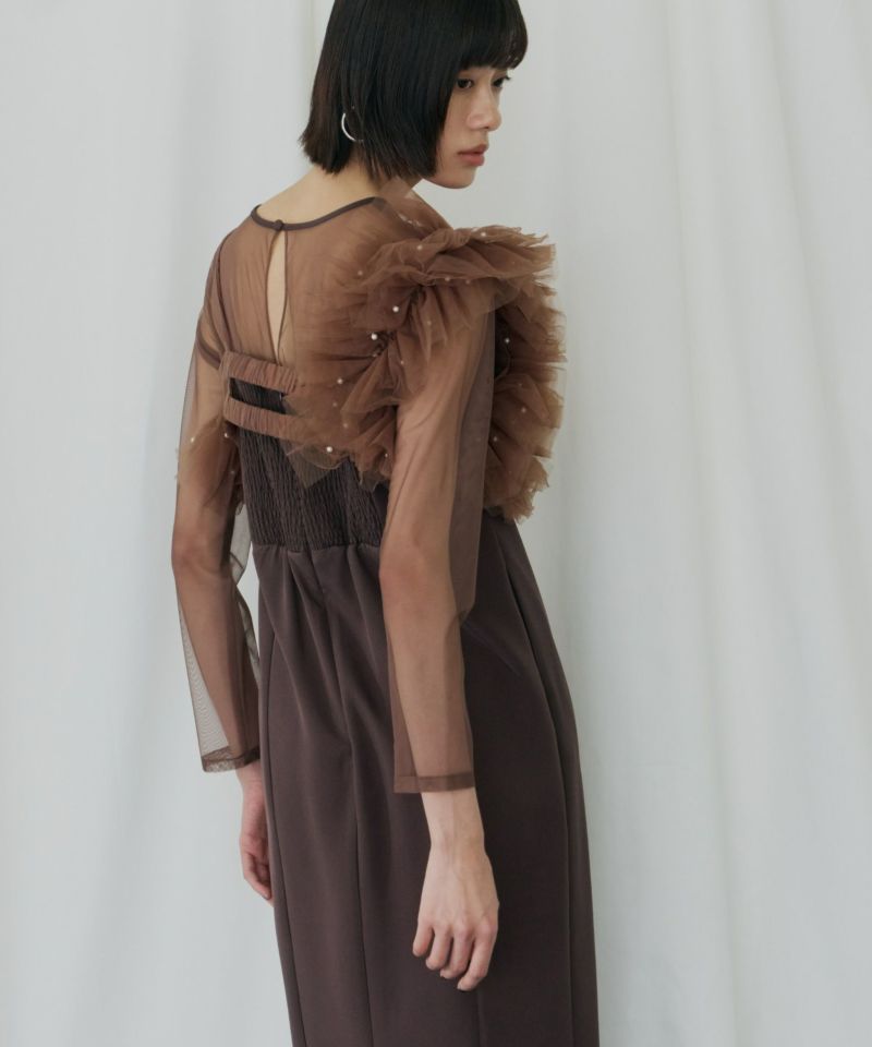 ビスチェにはランダムに散りばめたパールが目を惹くチュール生地を採用。