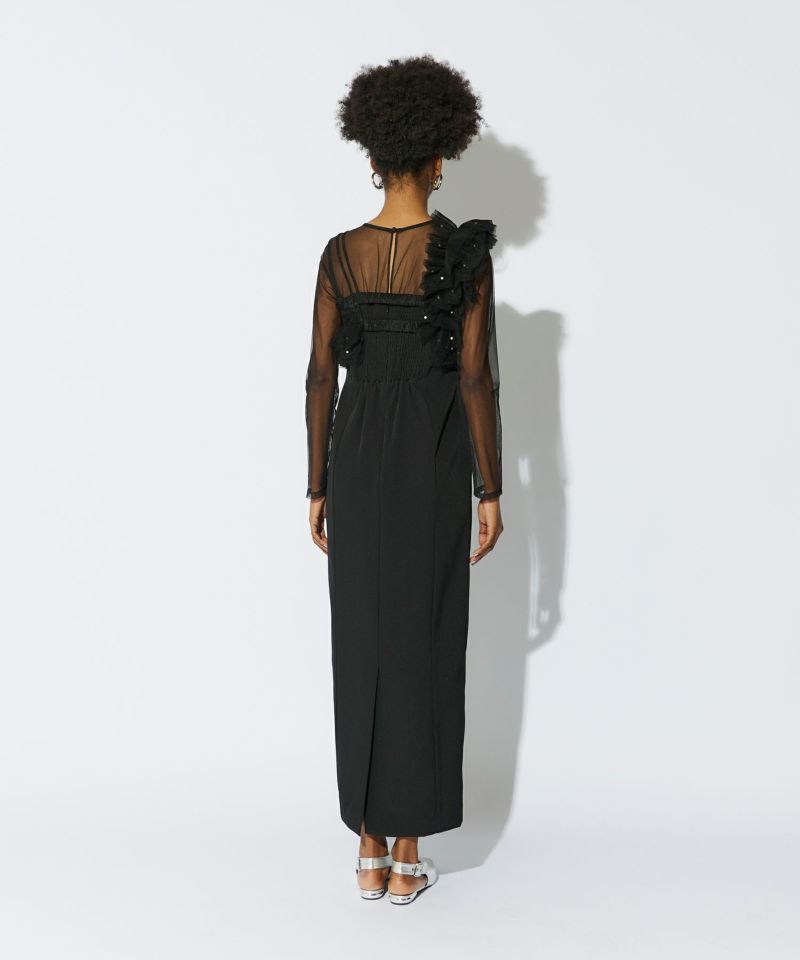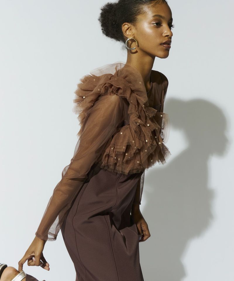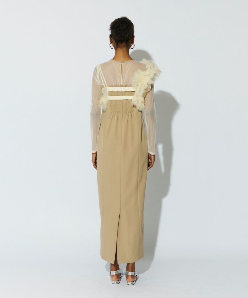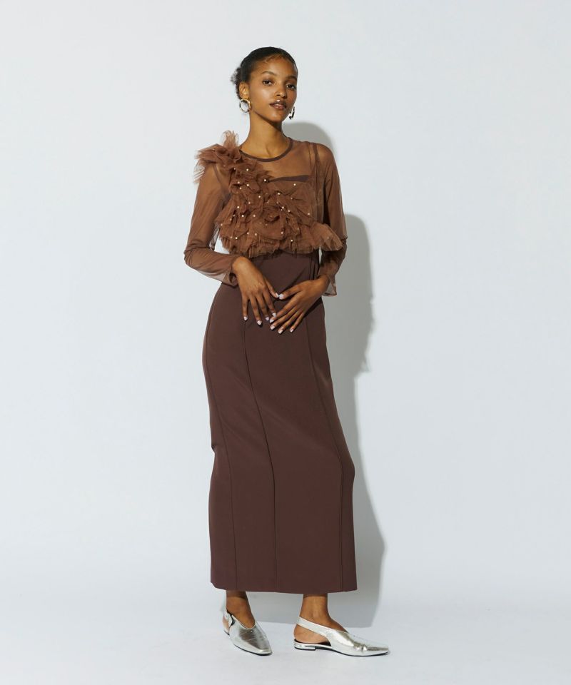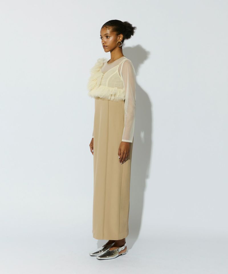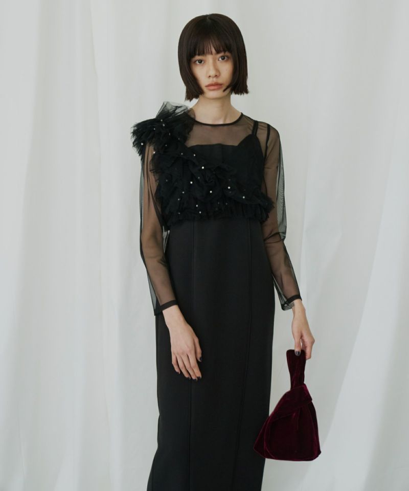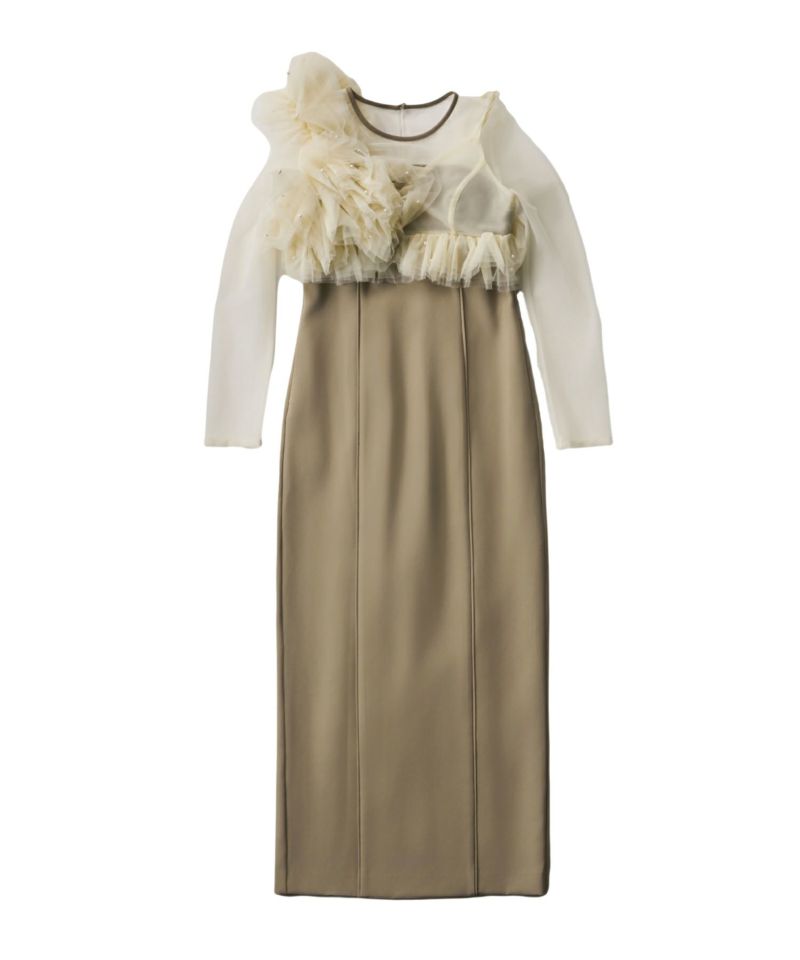 ビスチェにはランダムに散りばめたパールが目を惹くチュール生地を採用。