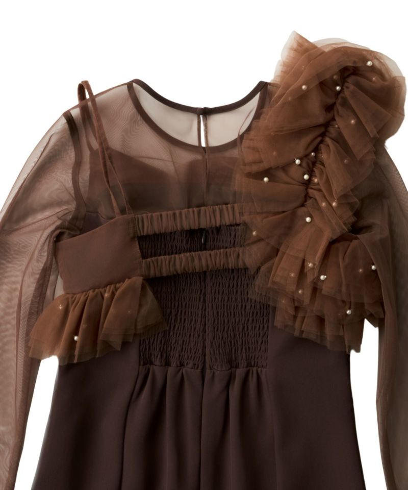 ボリュームフリルチュールと全面にパールを施し“派手すぎず、目を惹くバランス”にこだわった1着。
