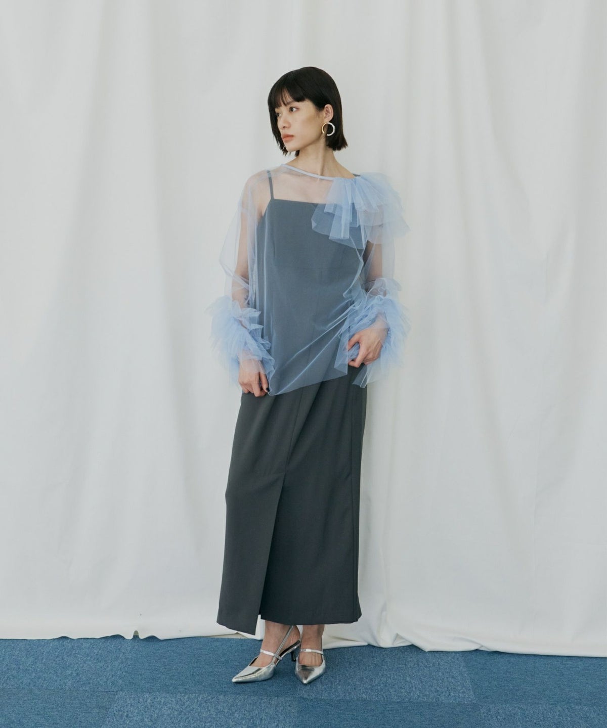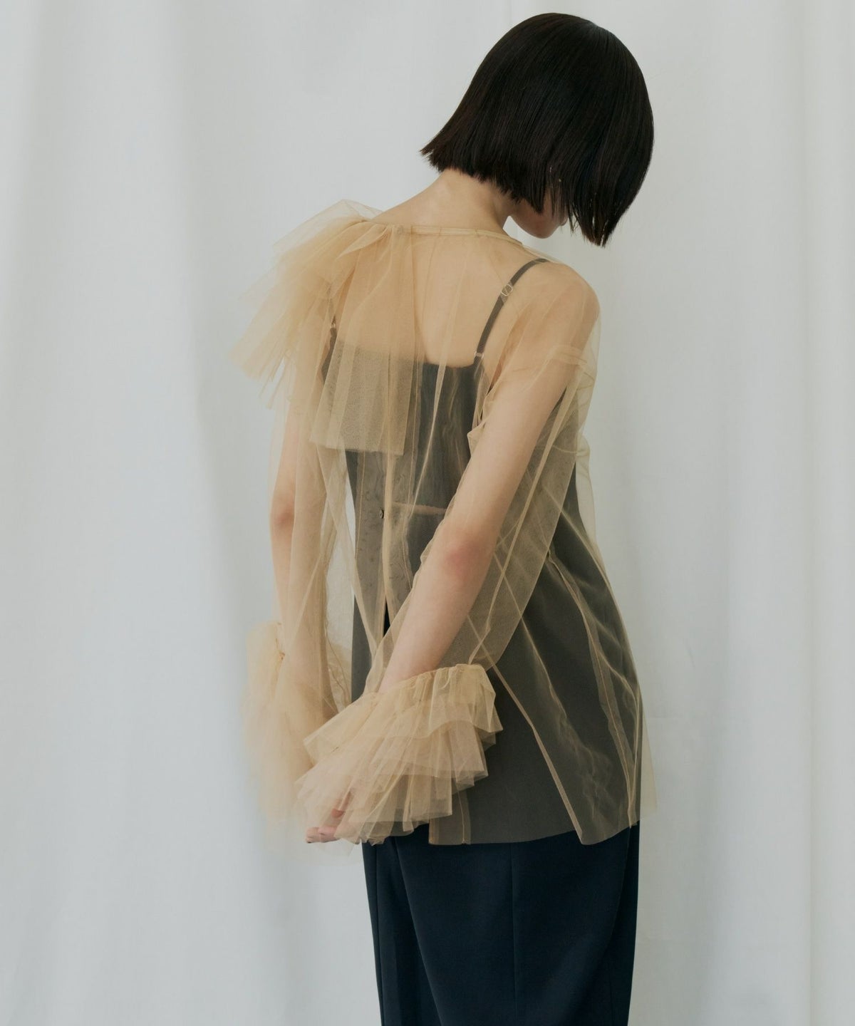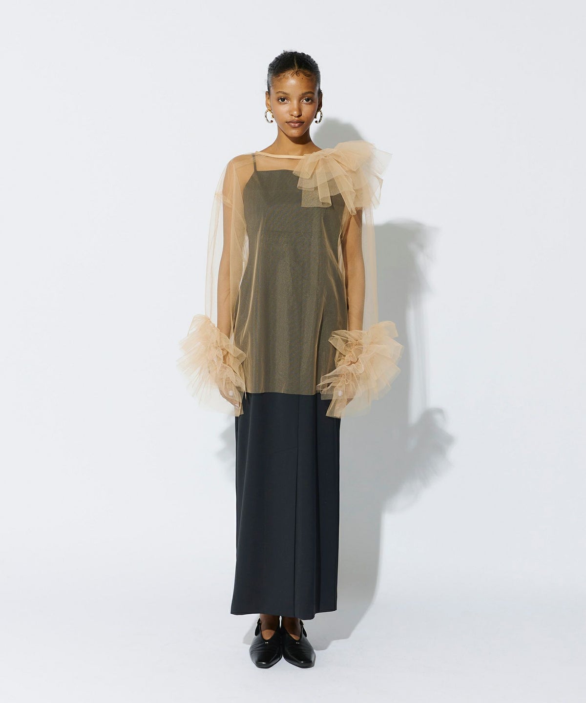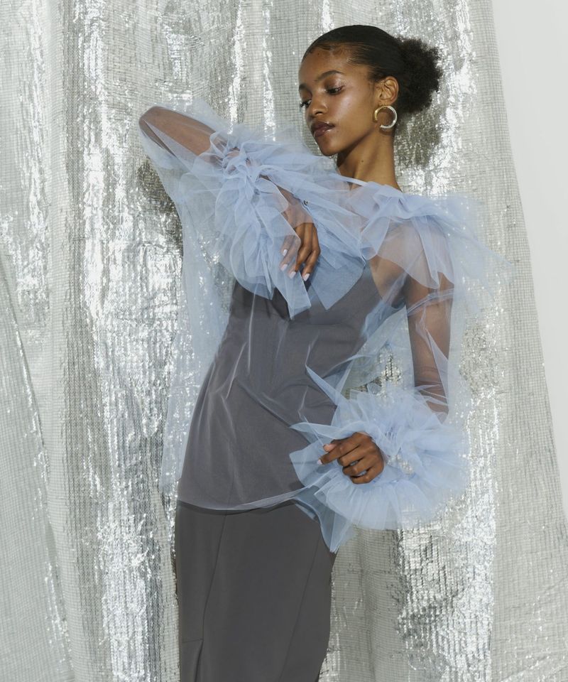 適度なハリ感のあるチュールが、空気を含むようにふんわりと広がり、ボリュームを出しながらも軽やかな印象を演出します。