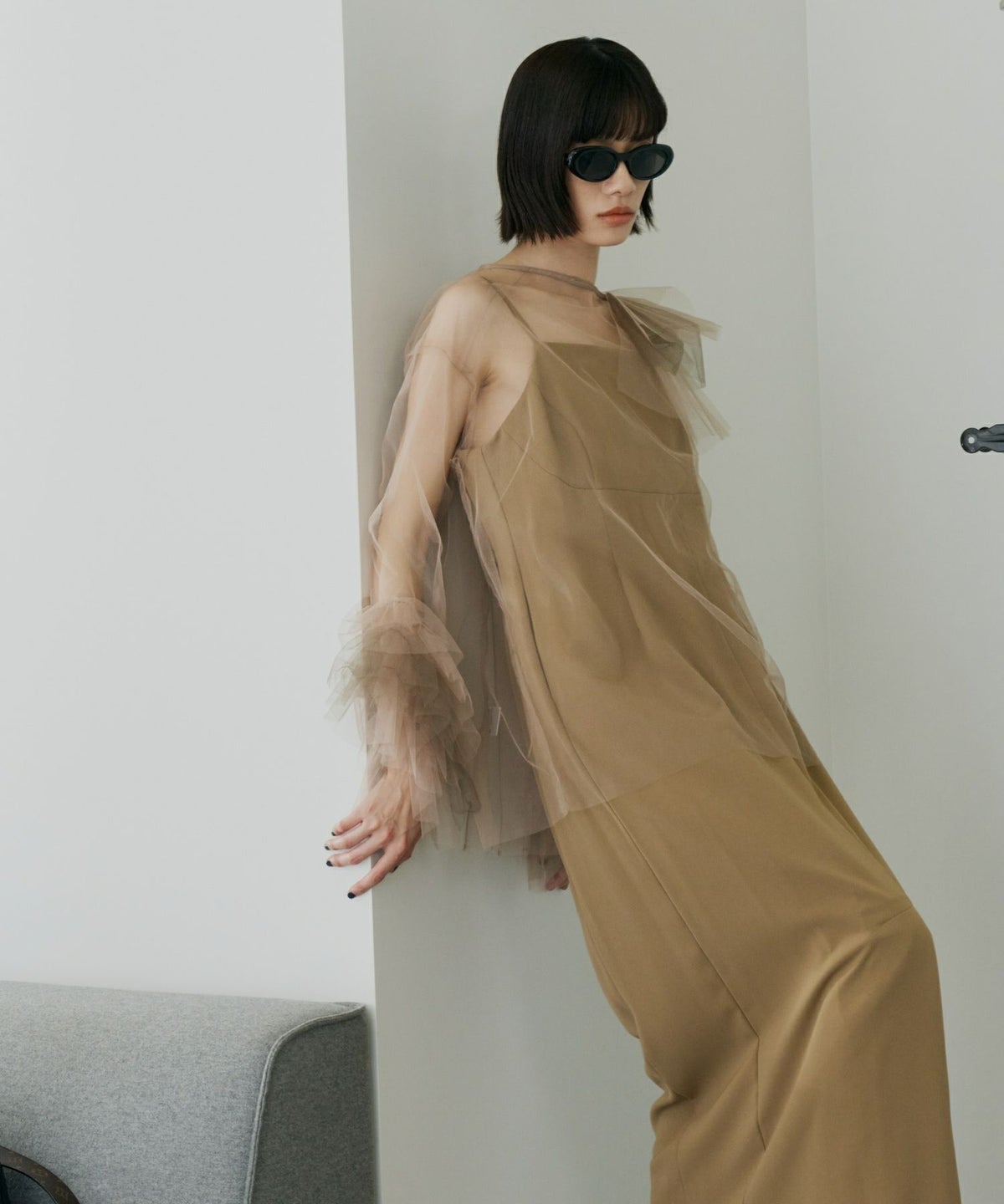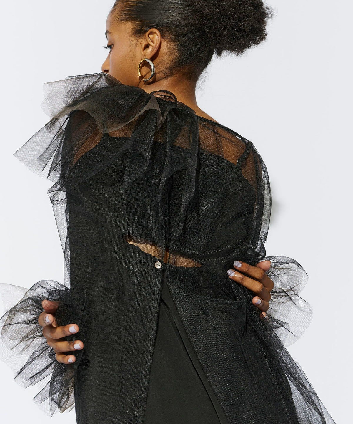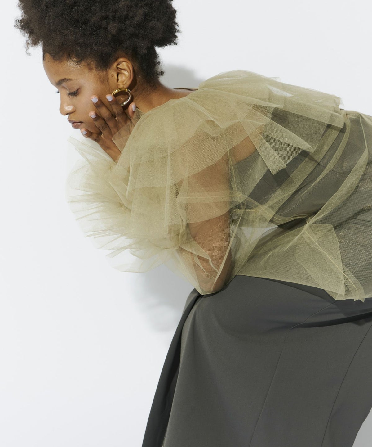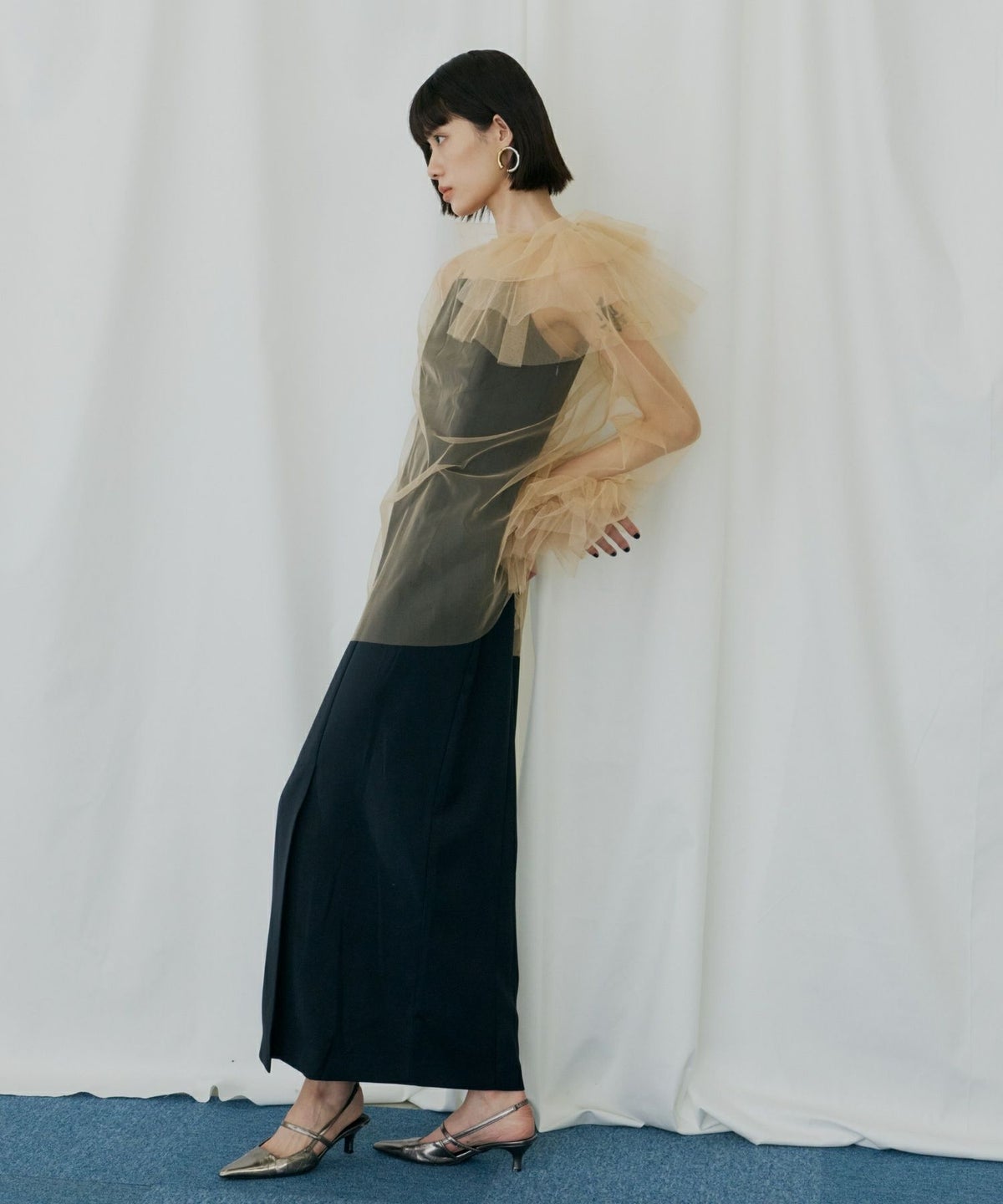 適度なハリ感のあるチュールが、空気を含むようにふんわりと広がり、ボリュームを出しながらも軽やかな印象を演出します。