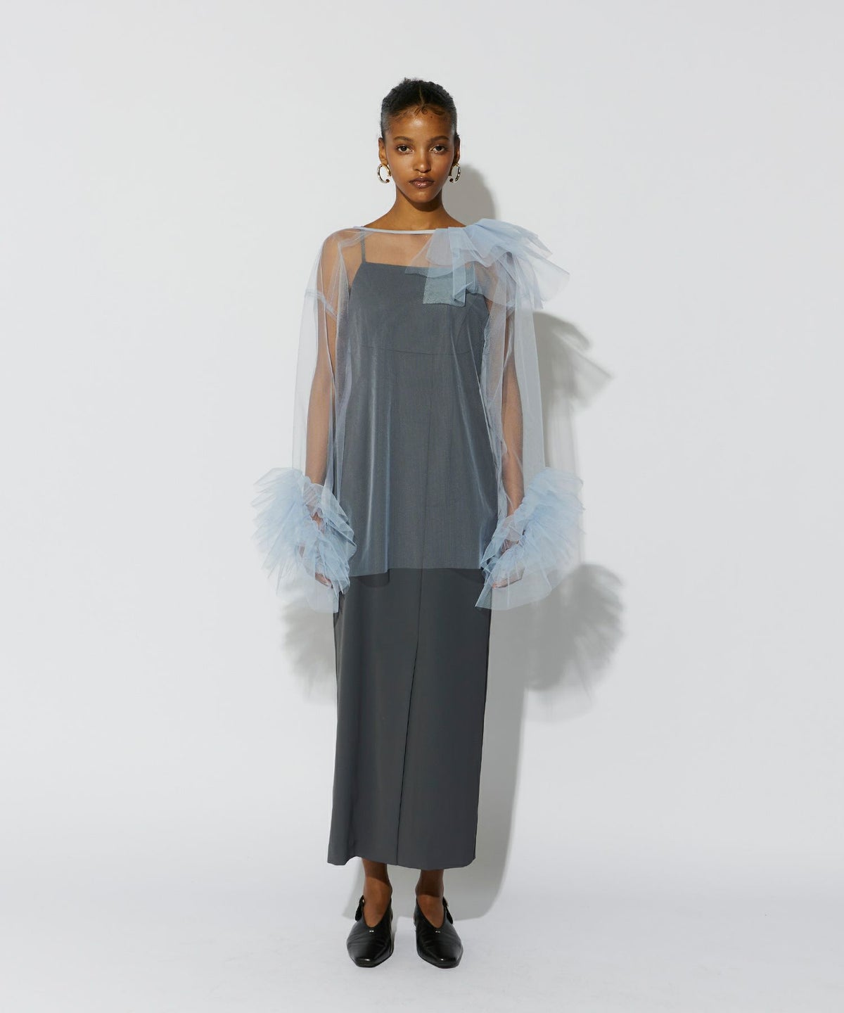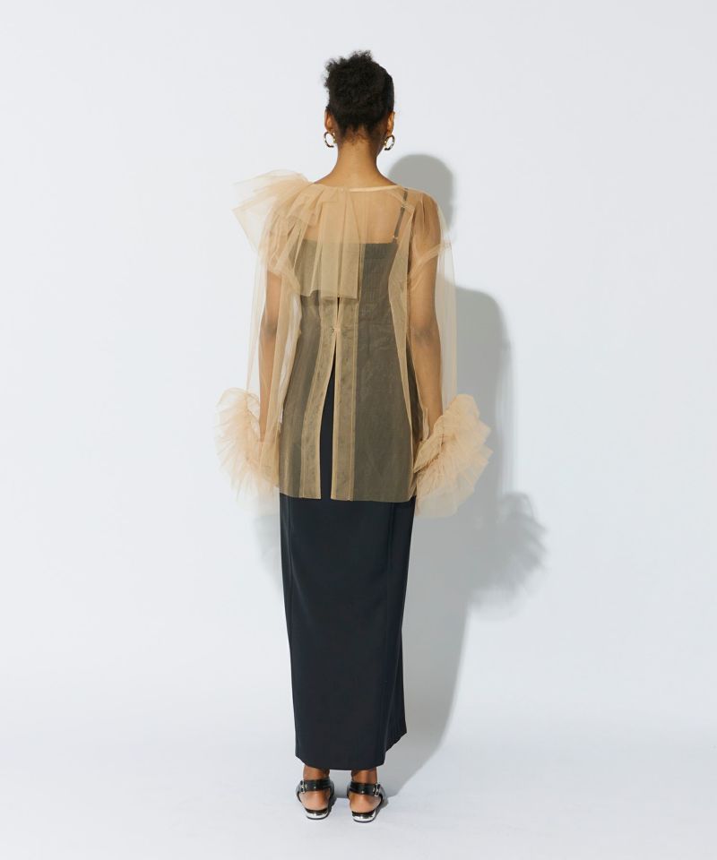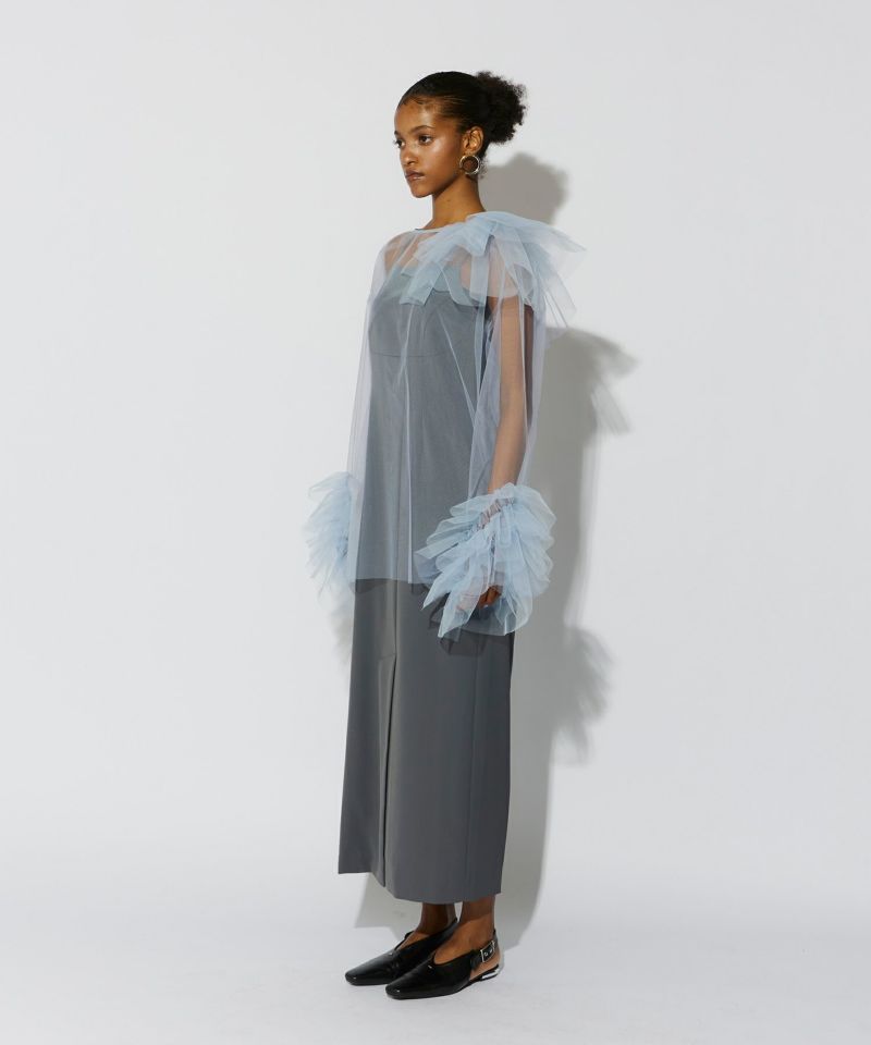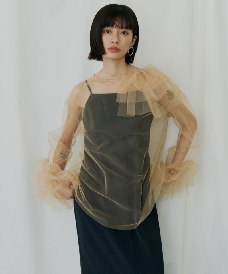 立体感とエアリーさを絶妙に両立させた、チュールフリルトップスとキャミワンピースのセットアイテム。