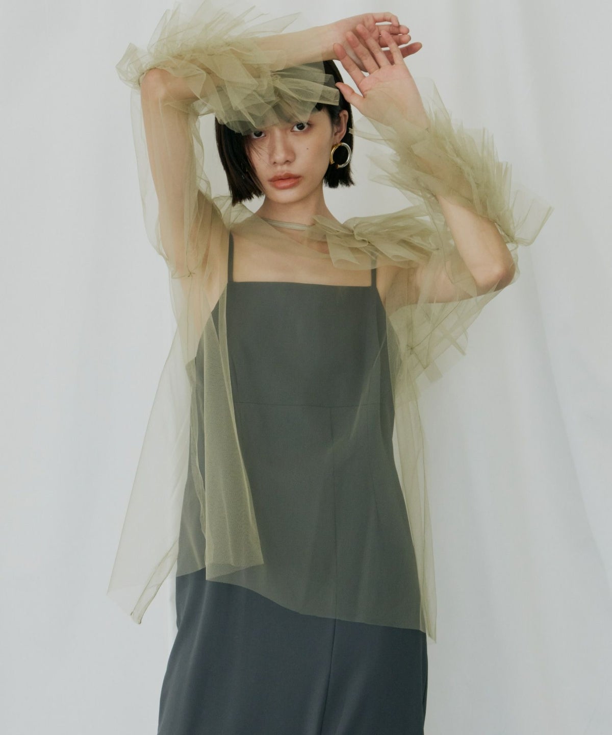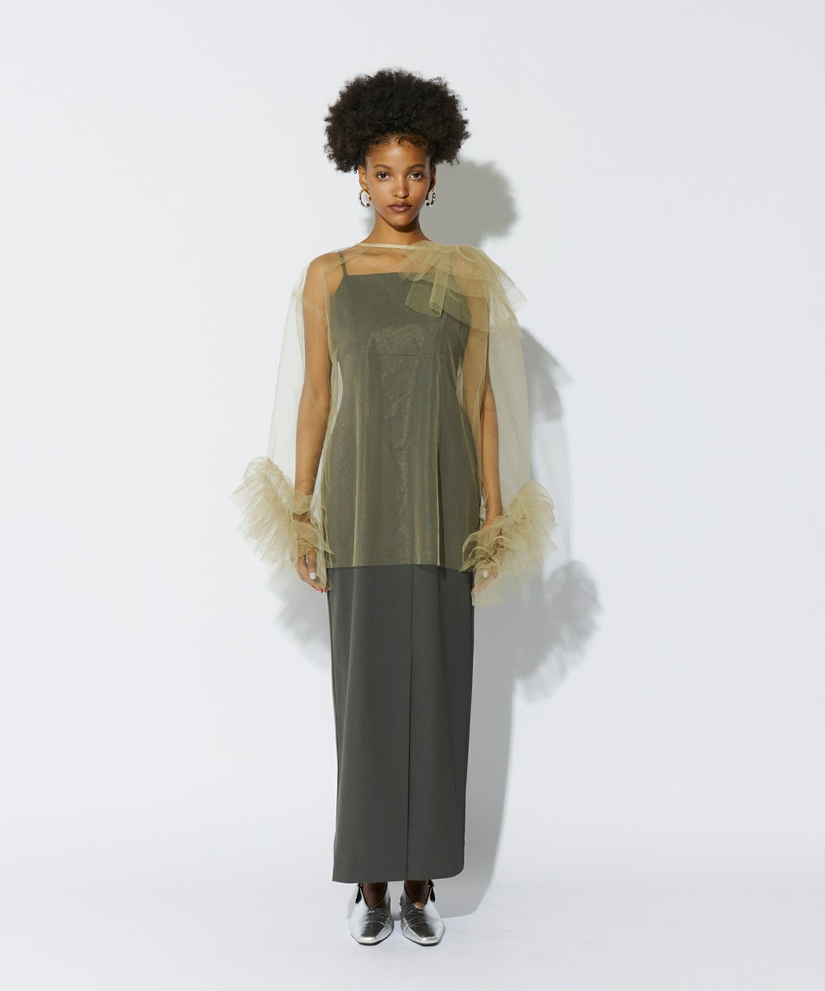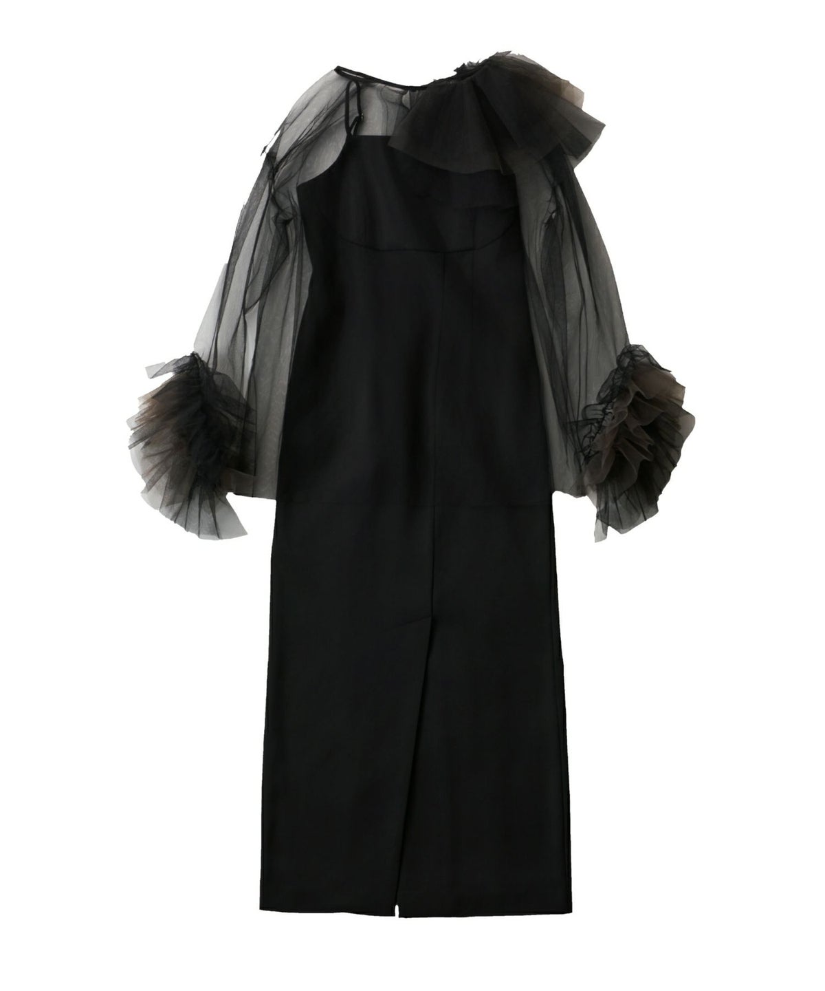 立体感とエアリーさを絶妙に両立させた、チュールフリルトップスとキャミワンピースのセットアイテム。