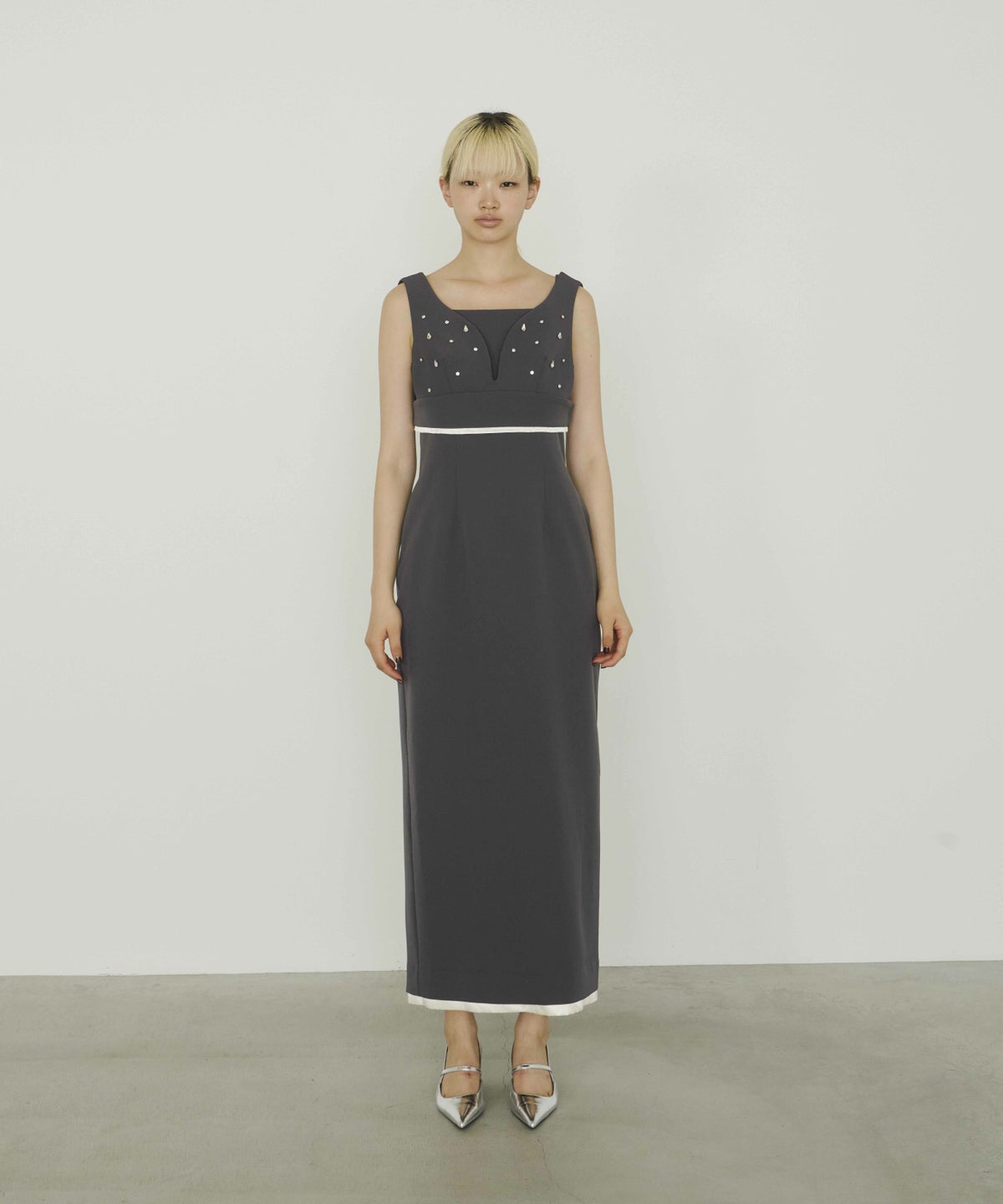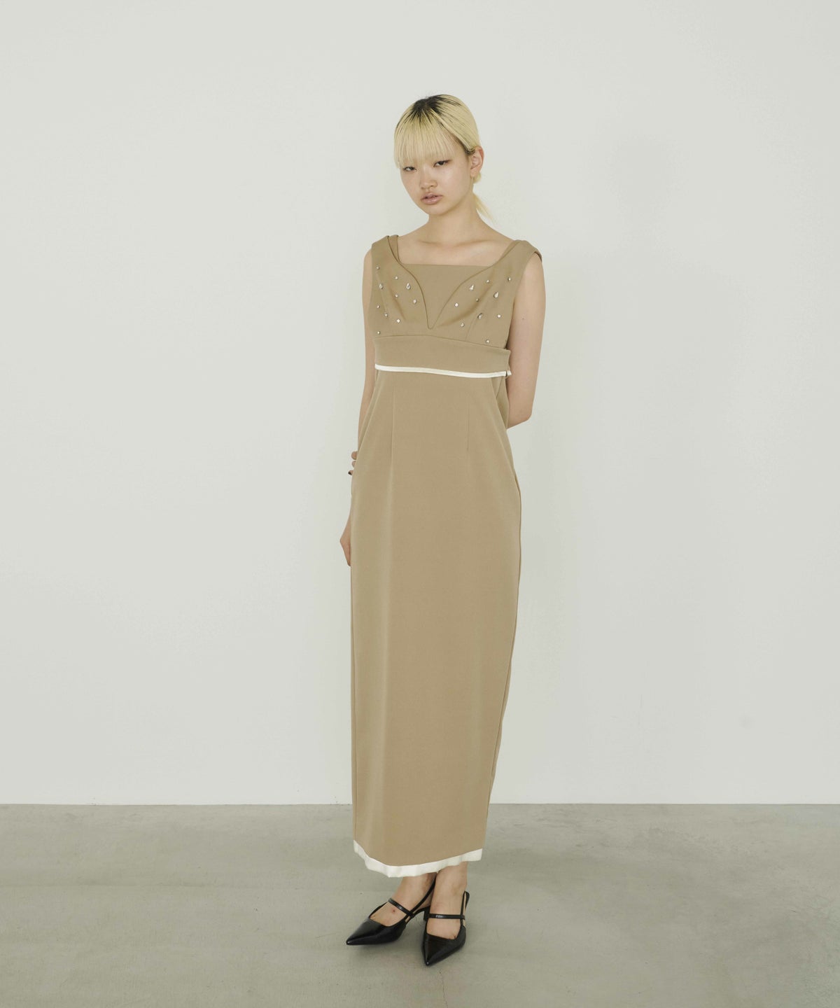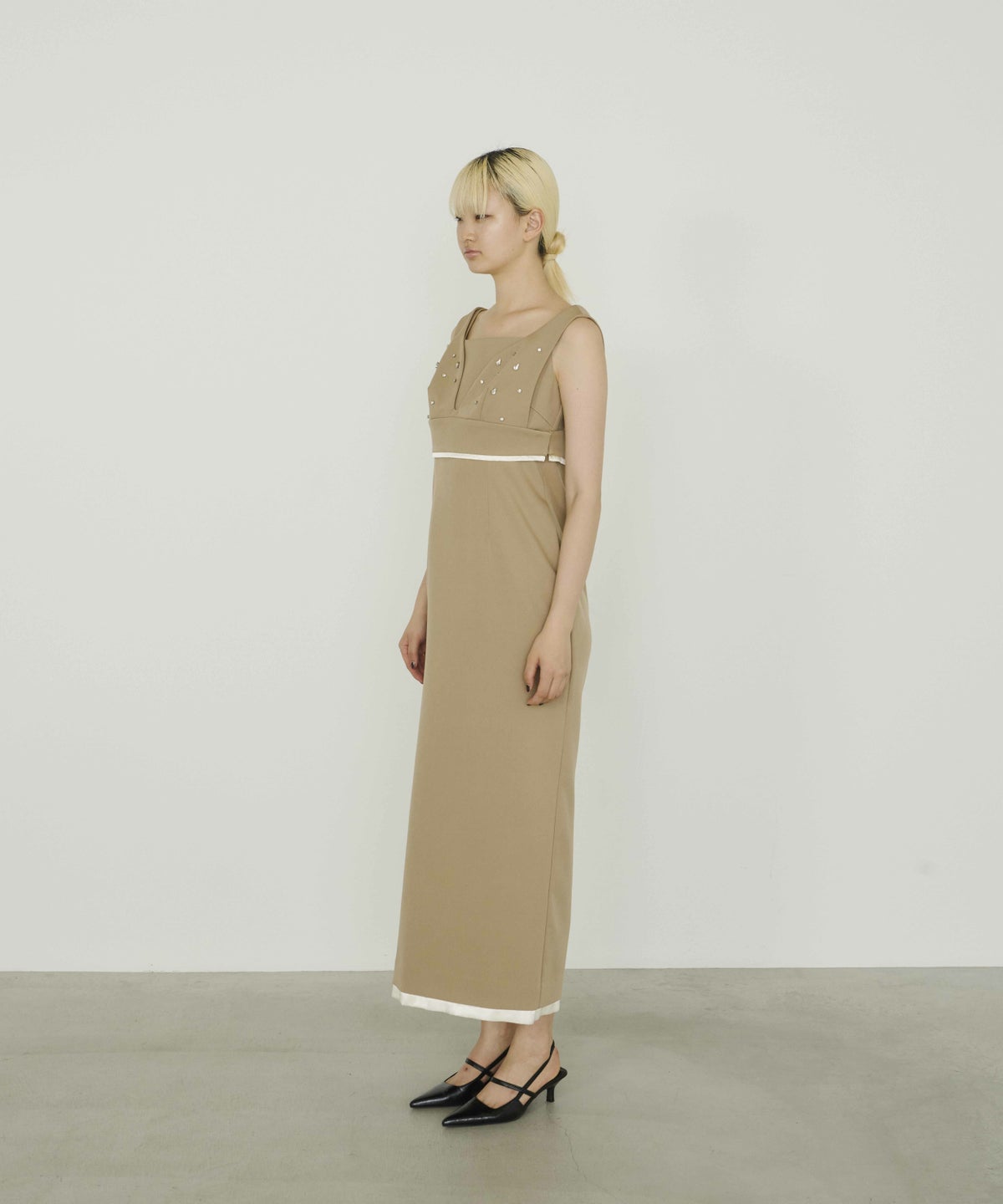 ビスチェ・ワンピ―スともに裾から覗くサテンの光沢が、ドレッシーで艶っぽいアクセントとして、全体の雰囲気を引き上げる。