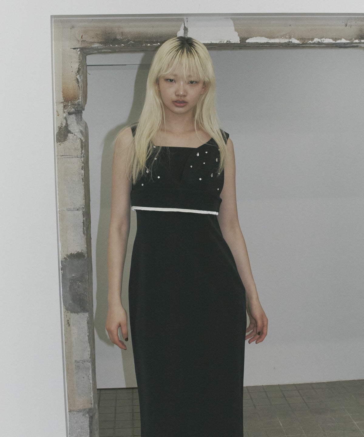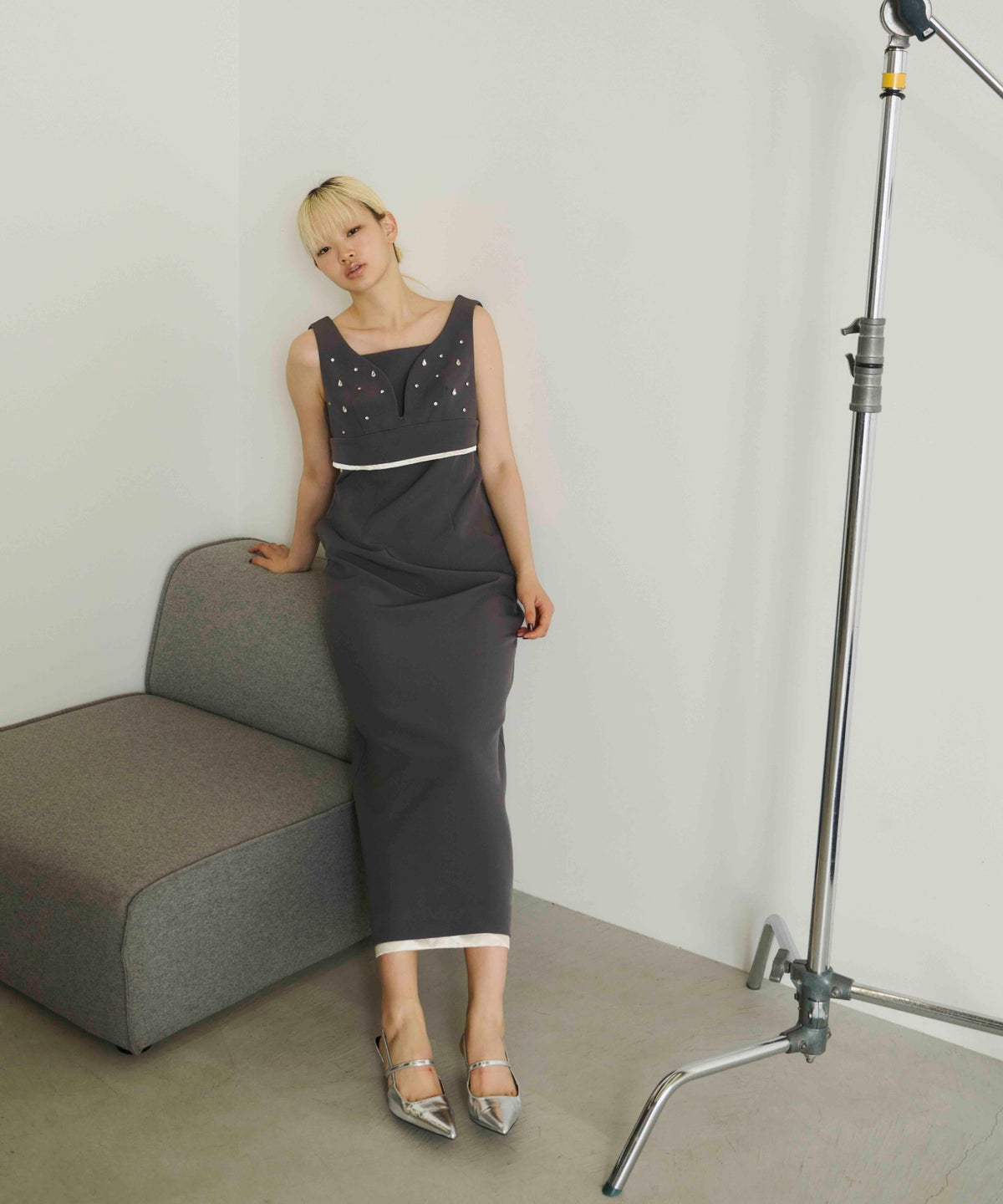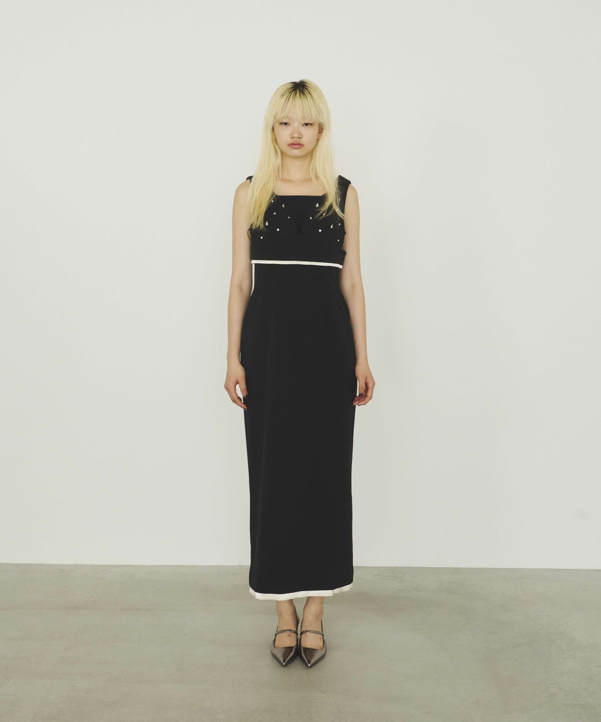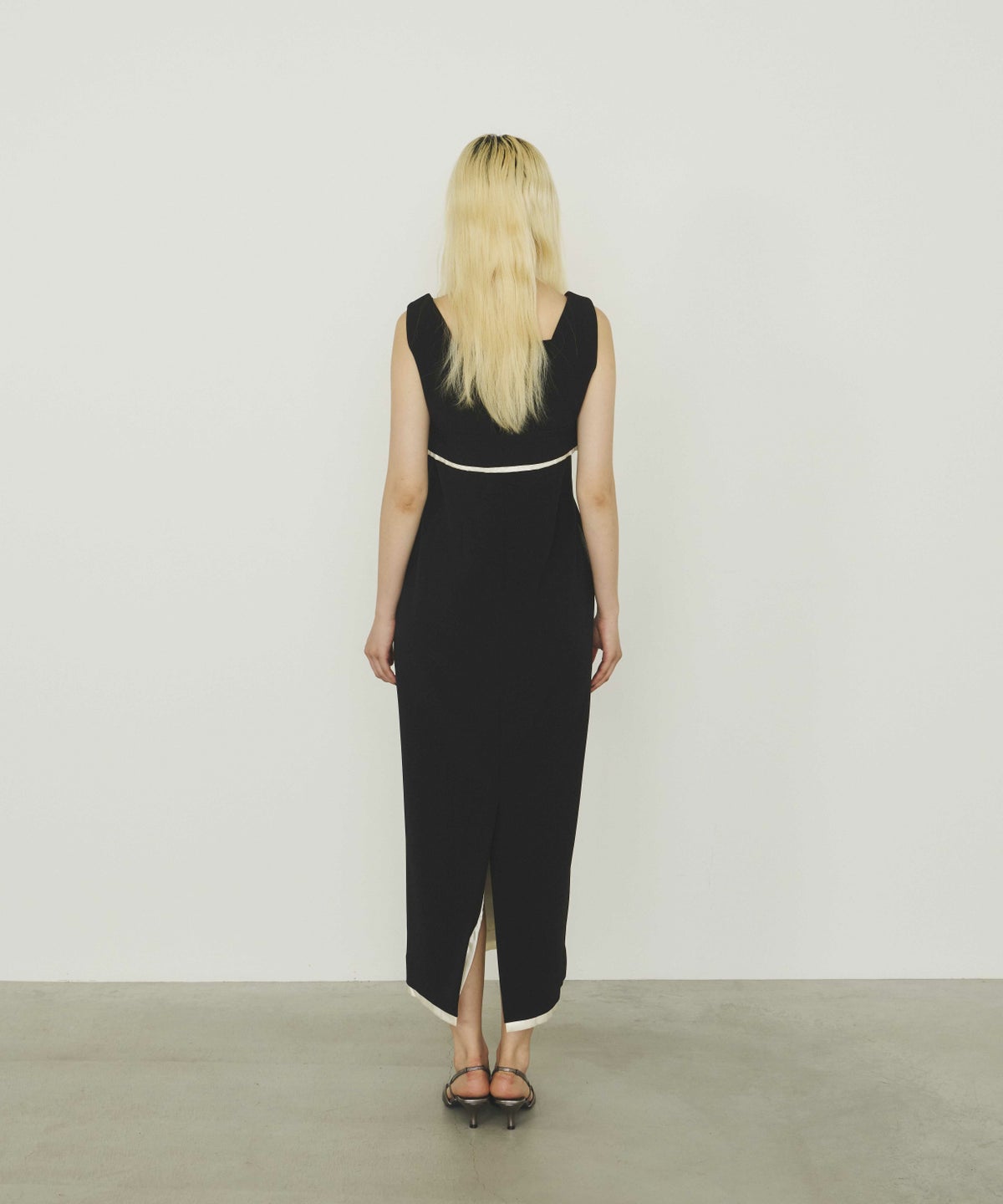 ビスチェ・ワンピ―スともに裾から覗くサテンの光沢が、ドレッシーで艶っぽいアクセントとして、全体の雰囲気を引き上げる。