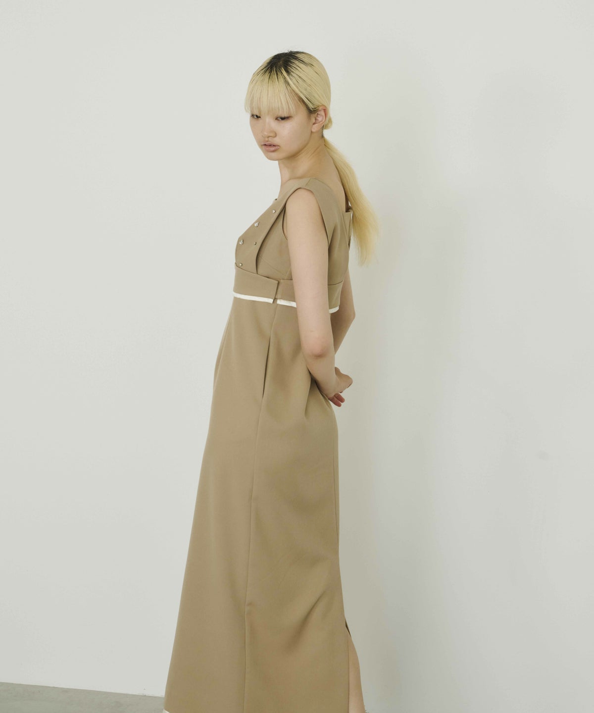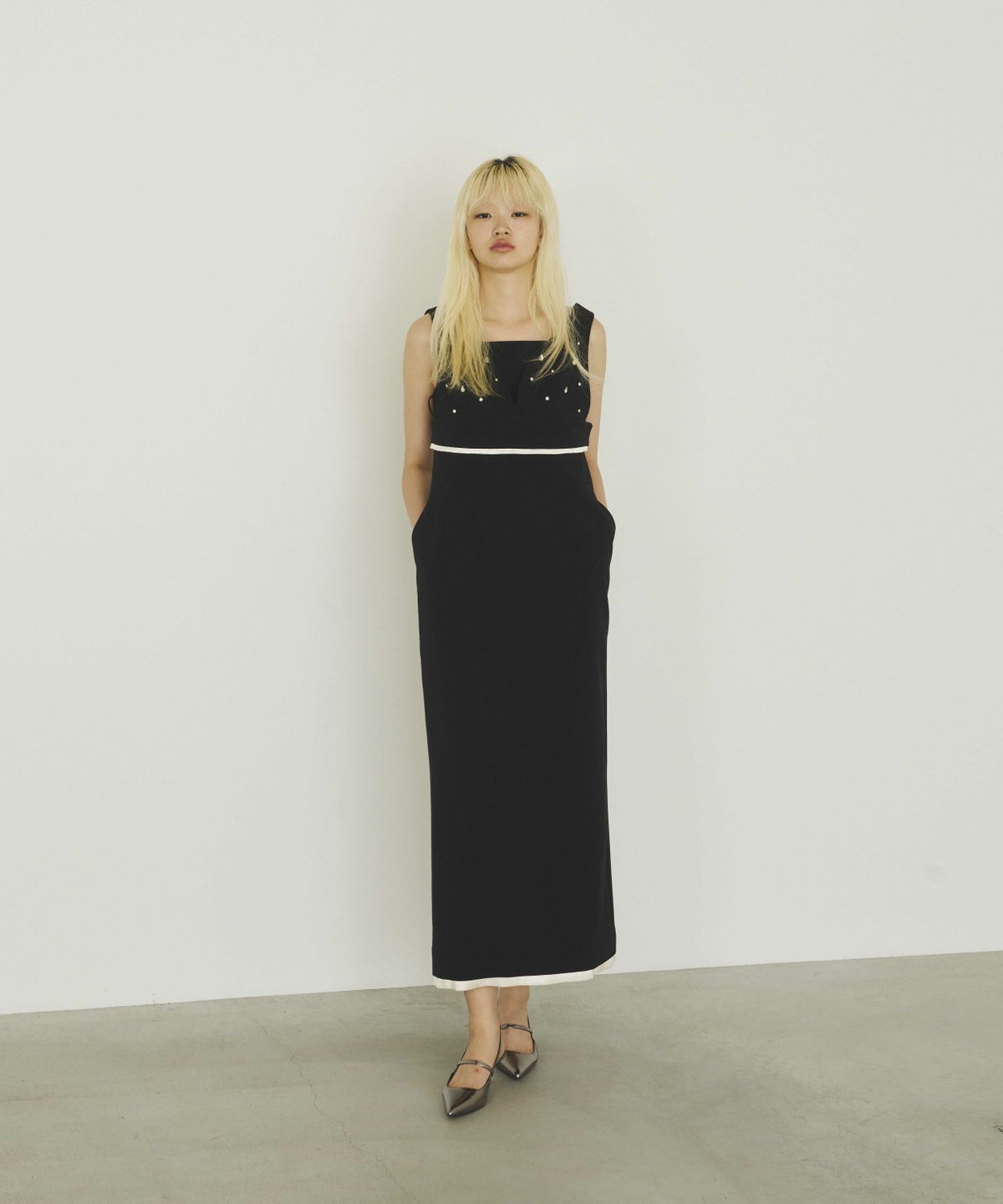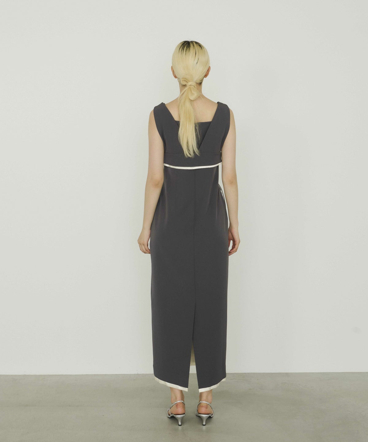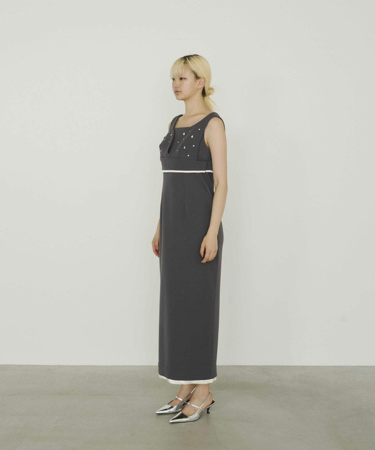 華奢なスクエアネックと、緩やかに体に沿うシルエットで女っぽさを纏う。