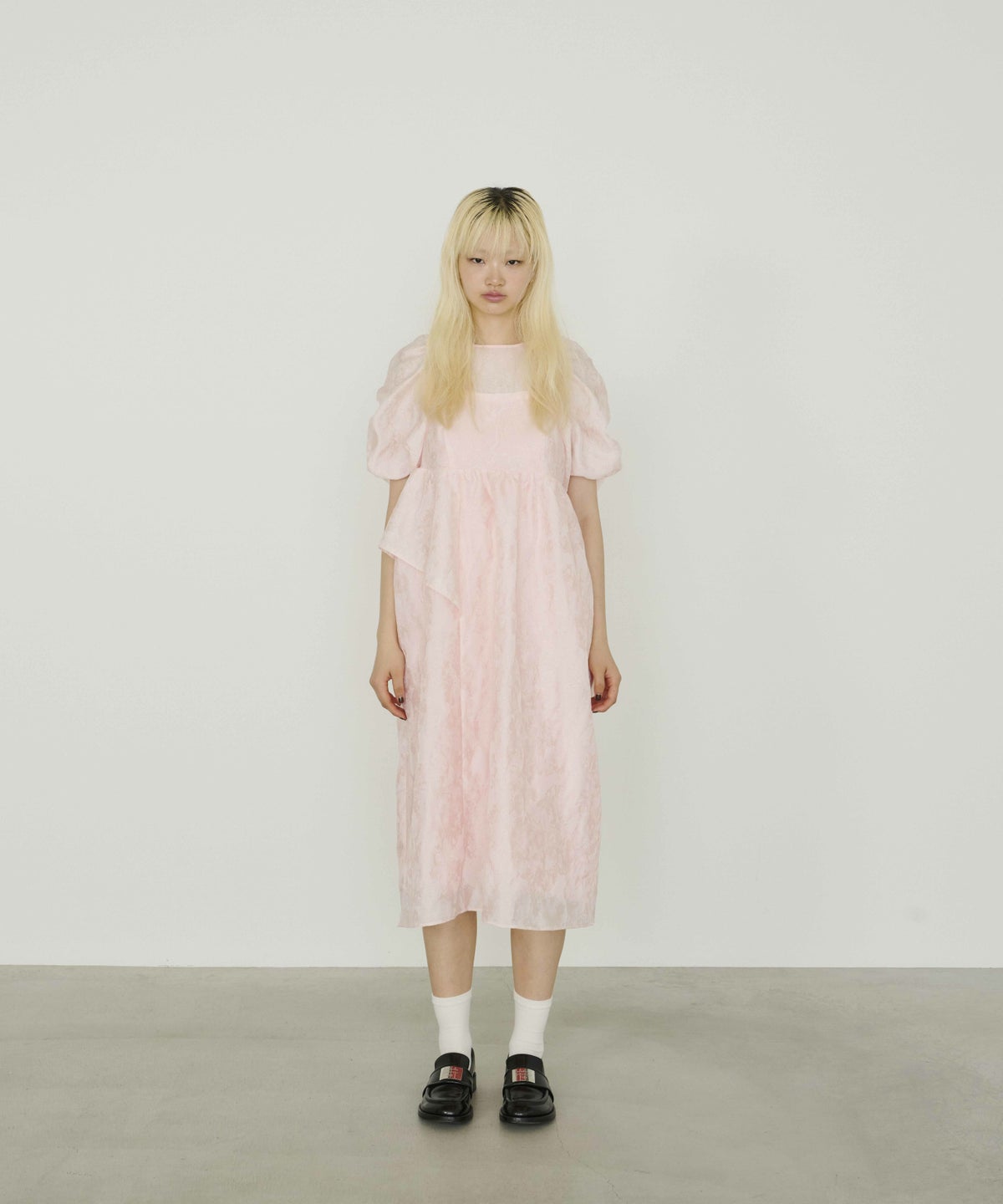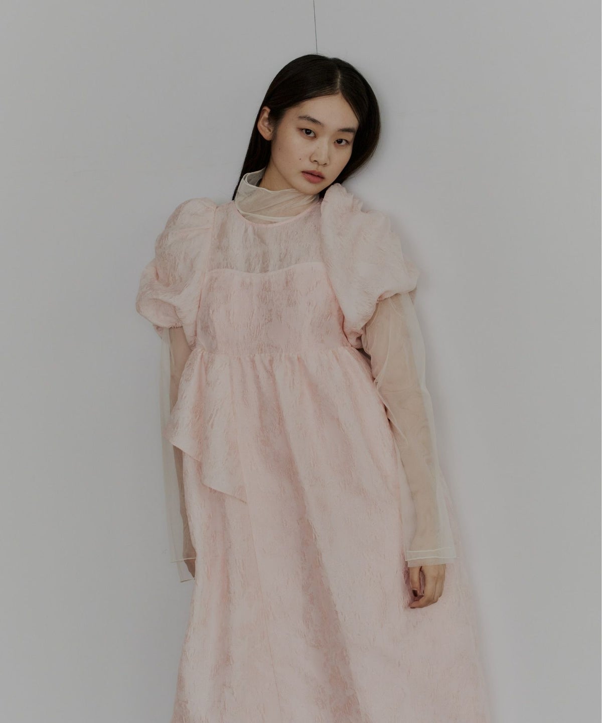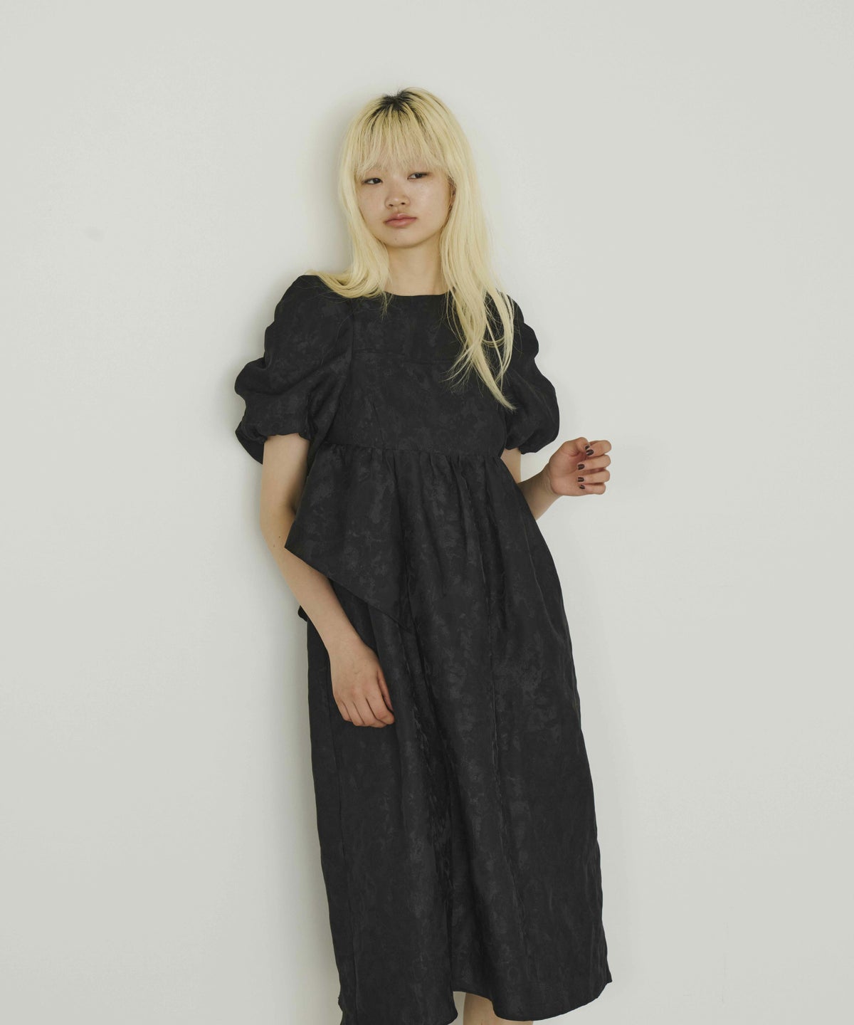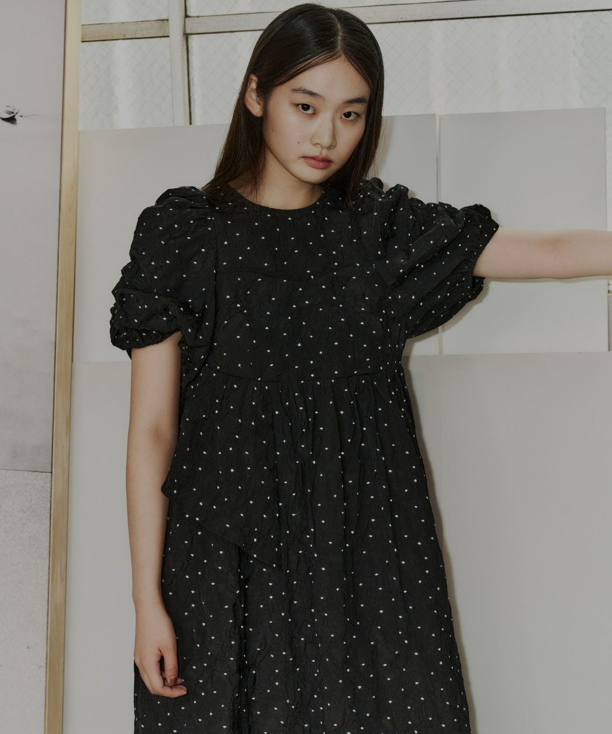 ギャザーをたっぷり寄せてつくったパフスリーブや、アシンメトリーなフリルがキャッチー。