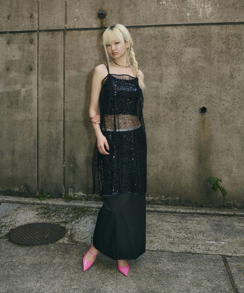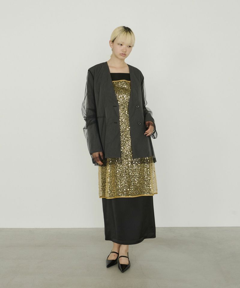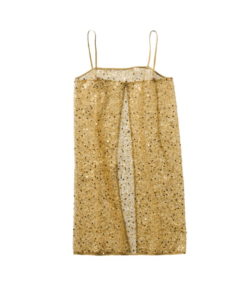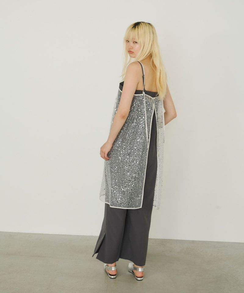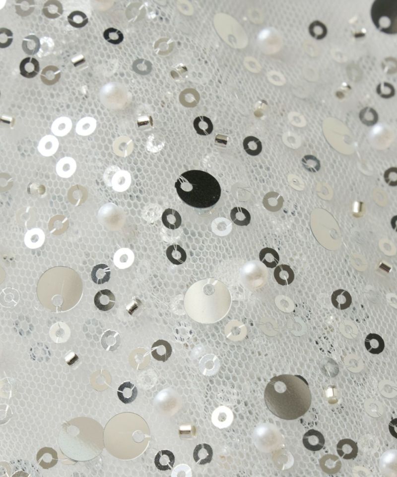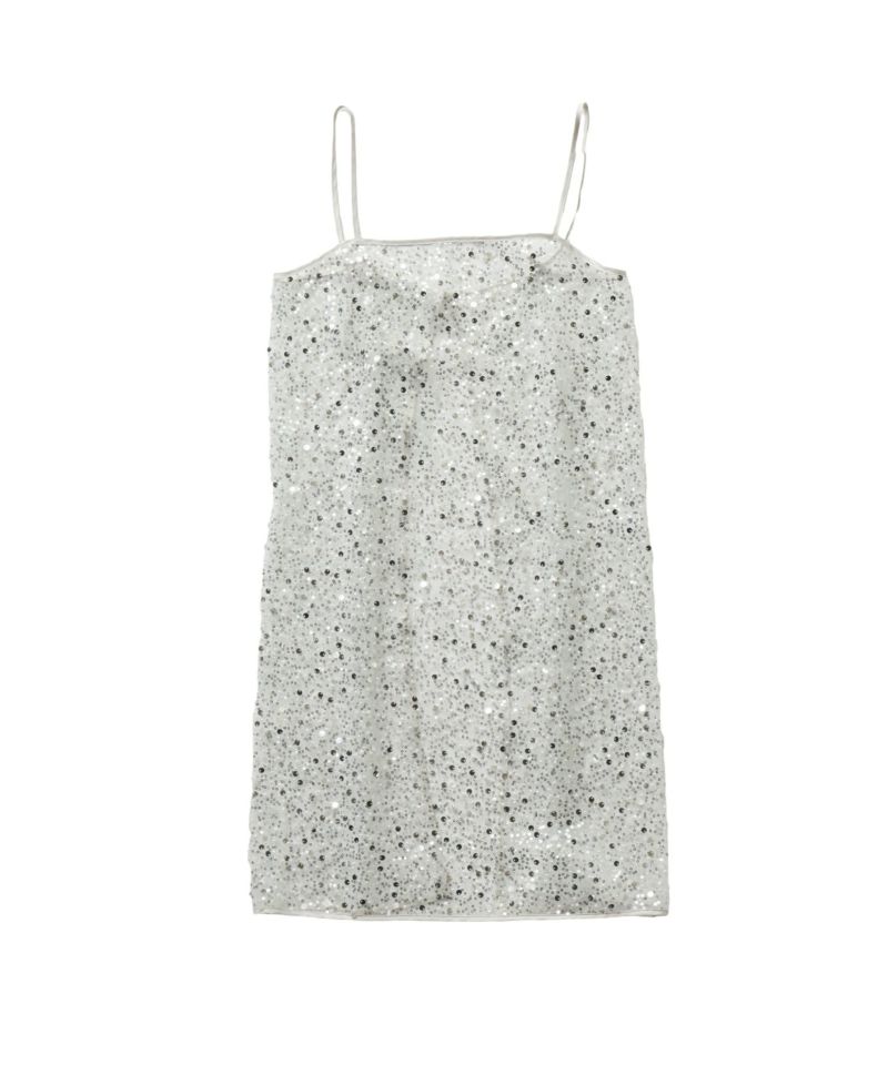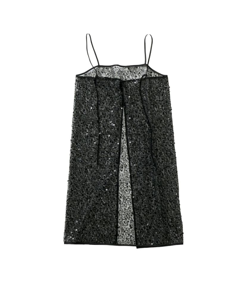 メタリックのスパンコールとパールビーズをランダムに刺繍した、繊細なチュール素材を使用したキャミドレス。