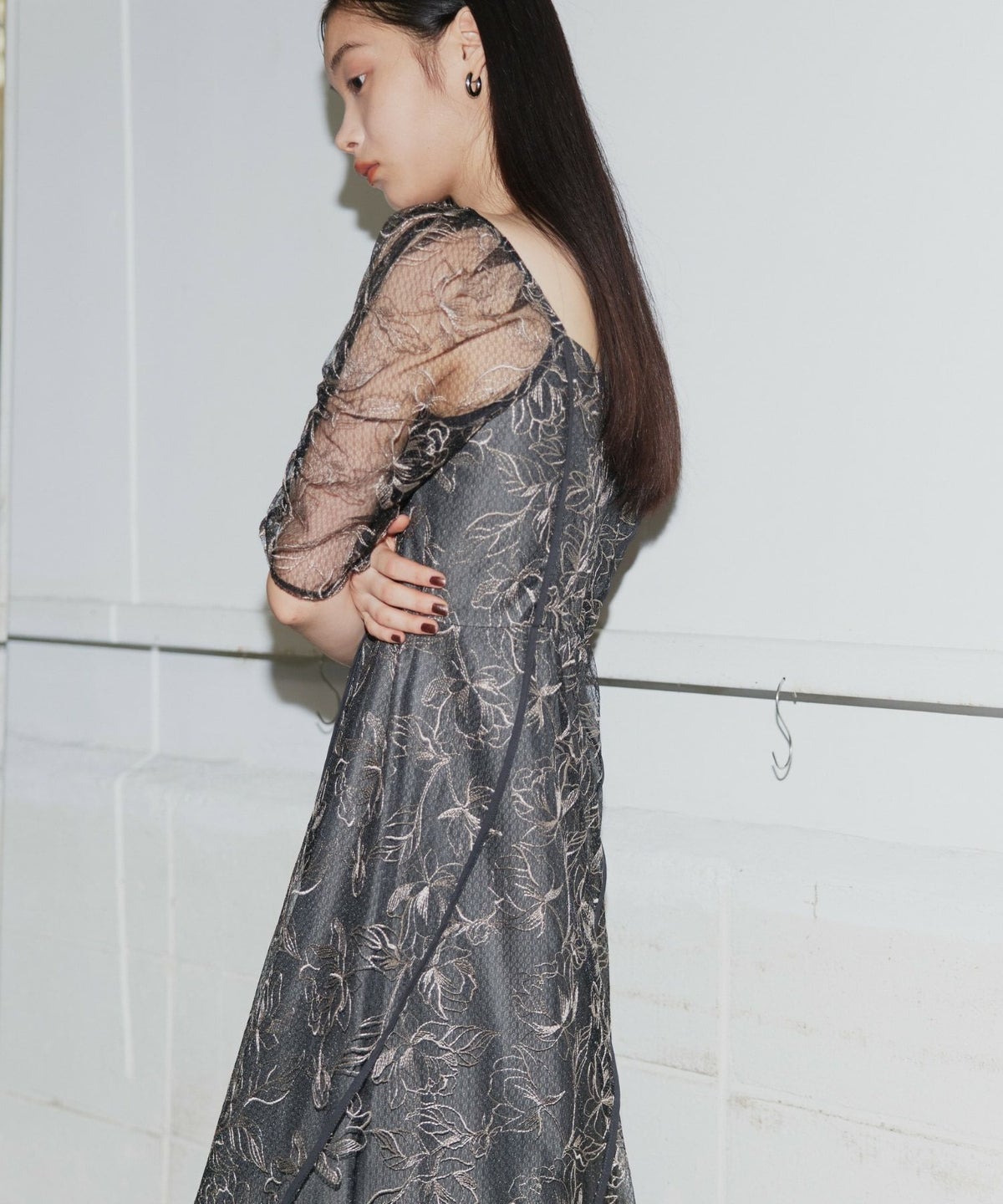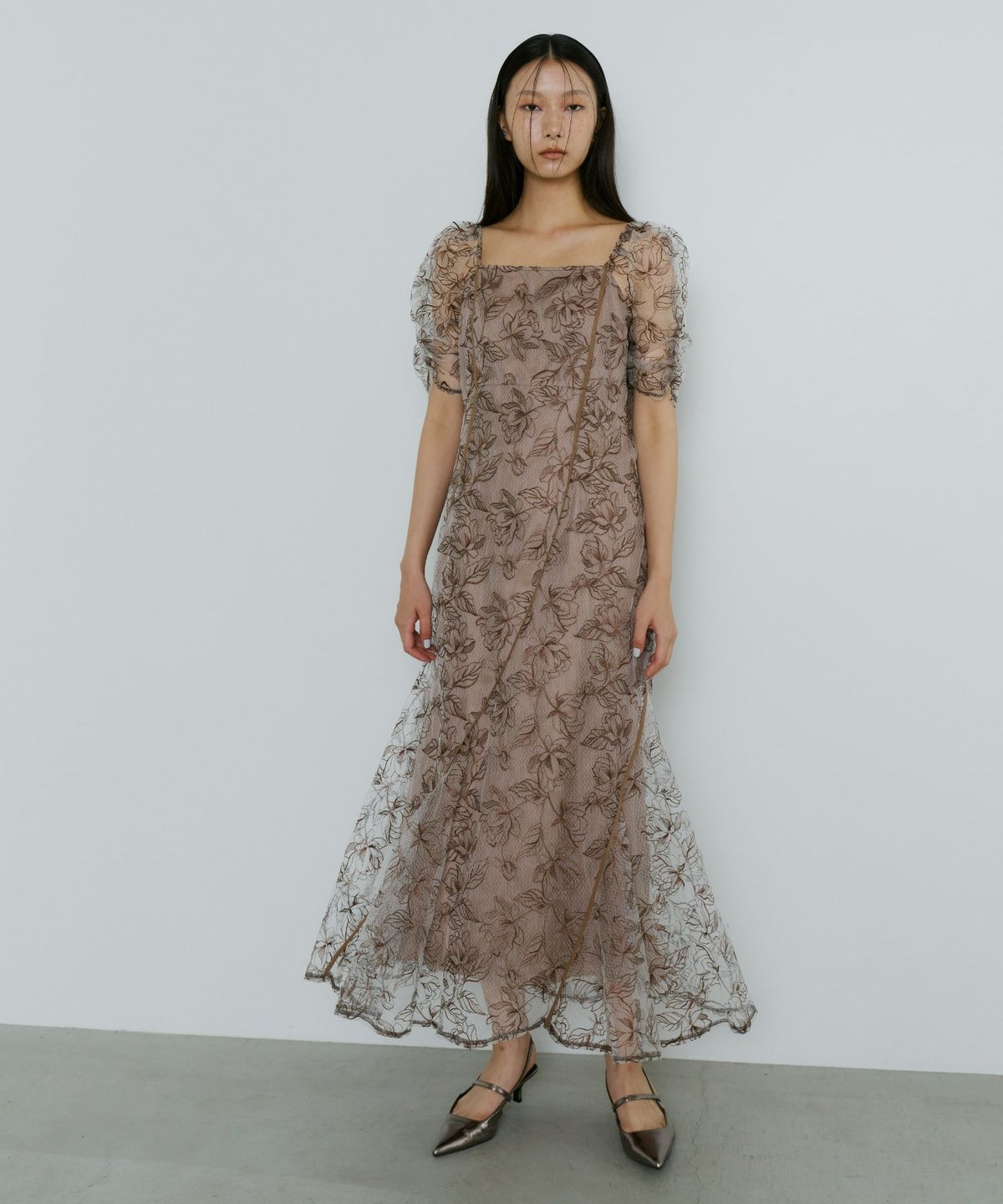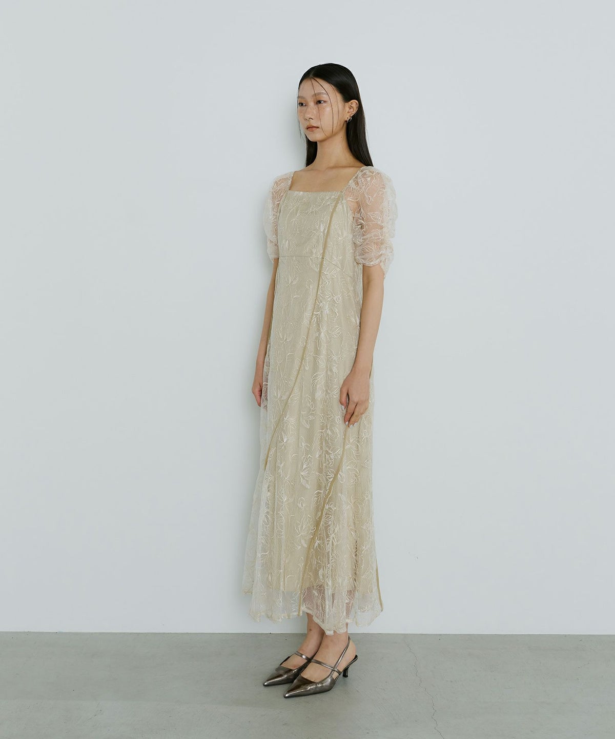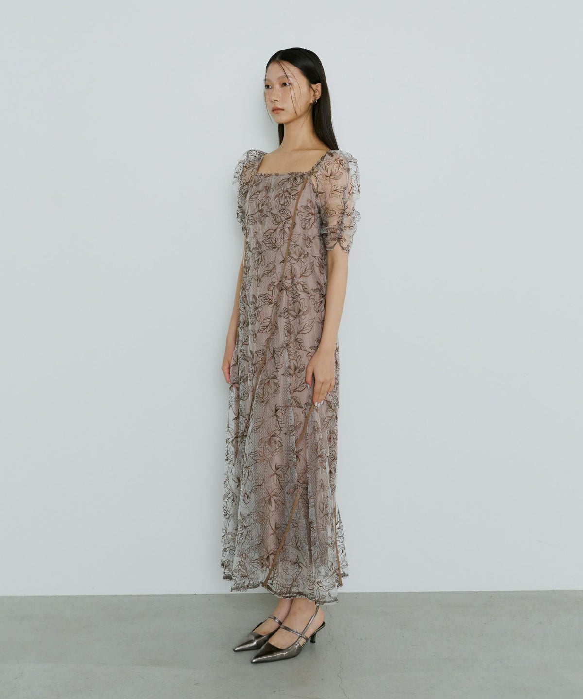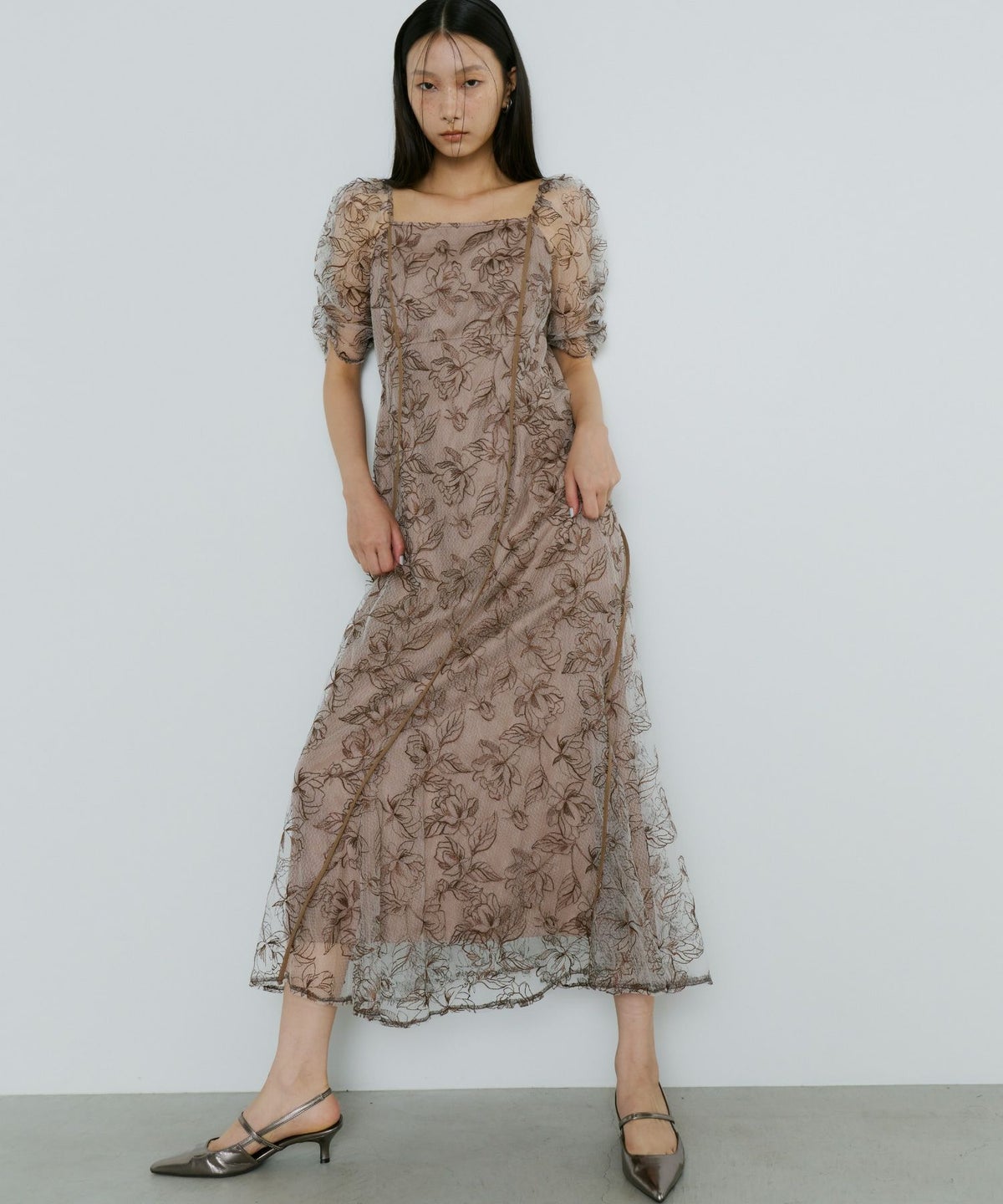 線画調の繊細なフラワー刺繍と軽やかな素材感で