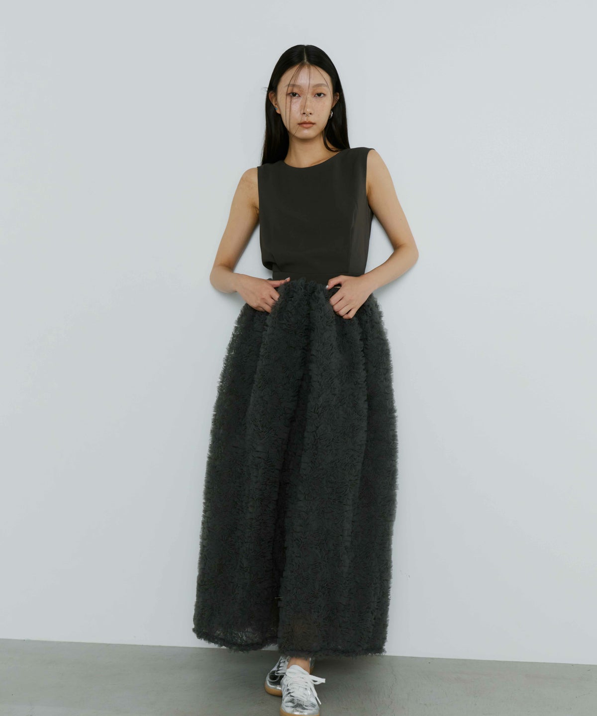 チュールをふんだんにあしらった、ボリュームたっぷりのmocomocoスカートが目を惹くセットアップ。