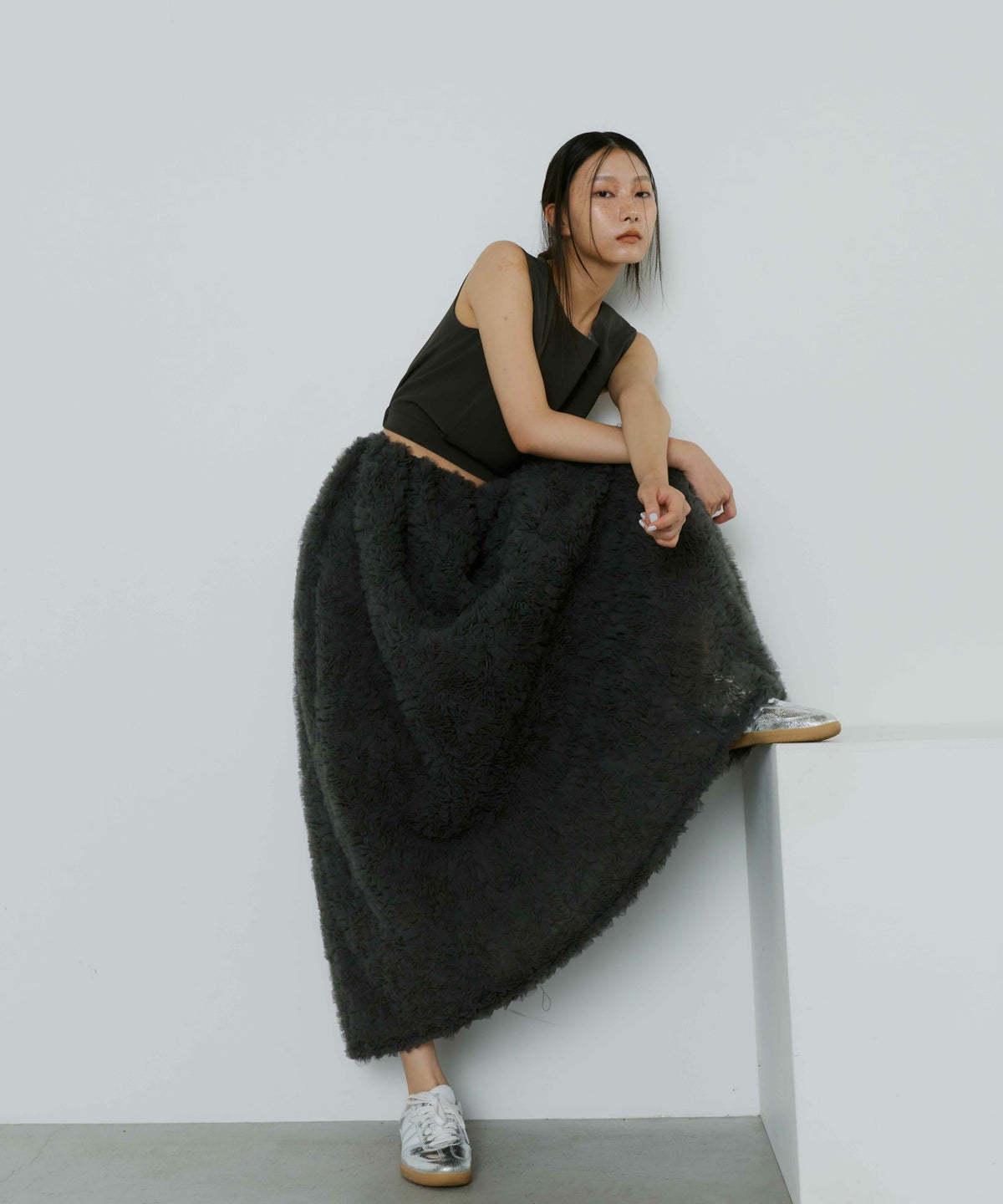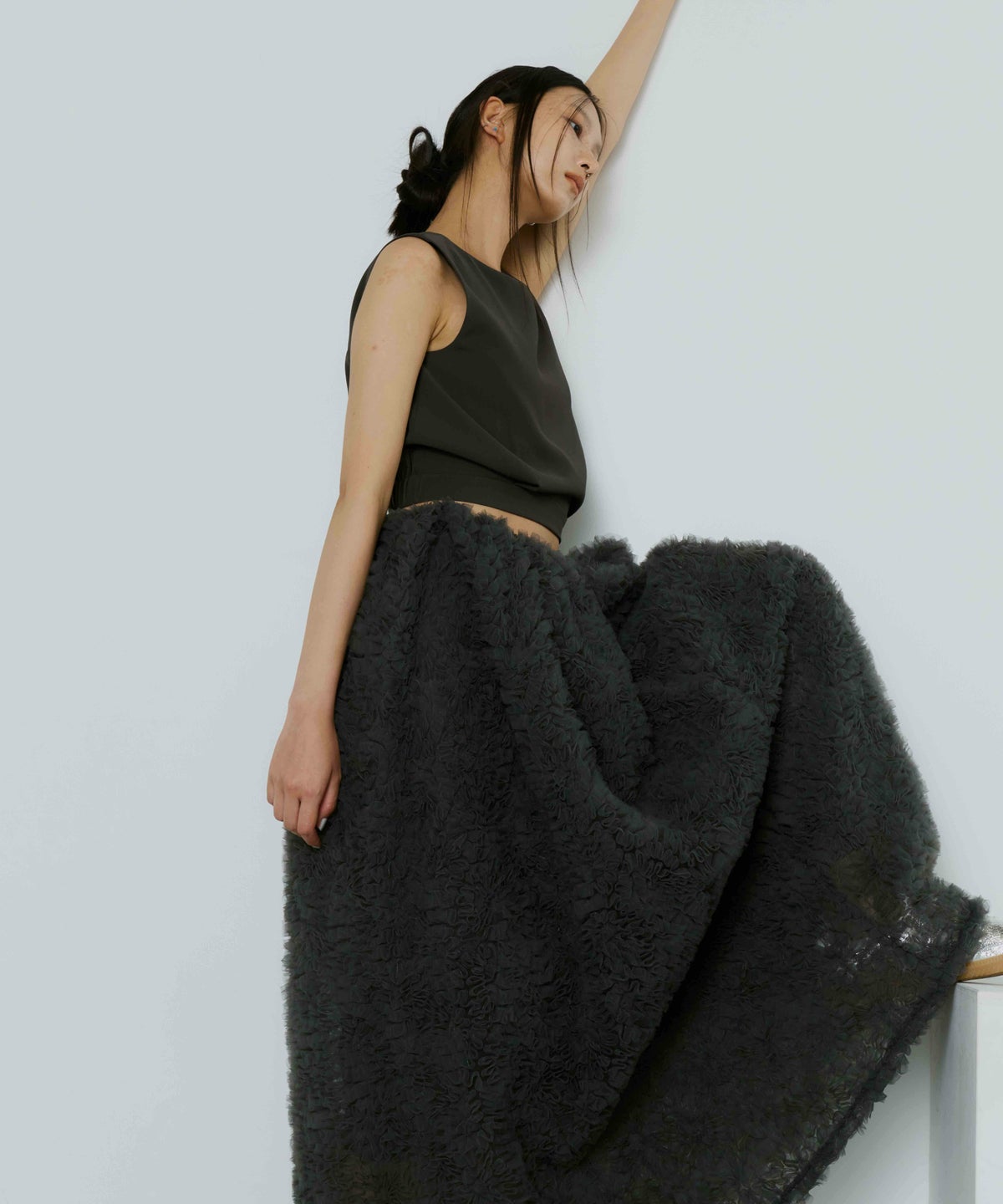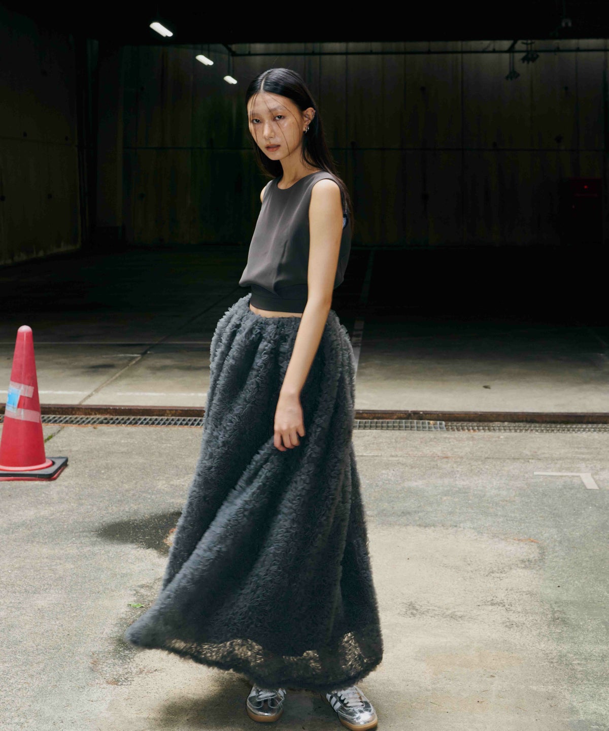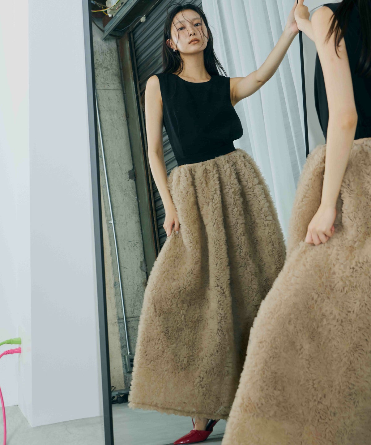 スカートがひき立つよう、トップスはセミマット・少し落ち感のある素材でバランス設計。