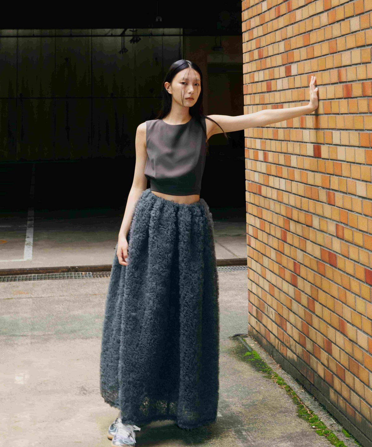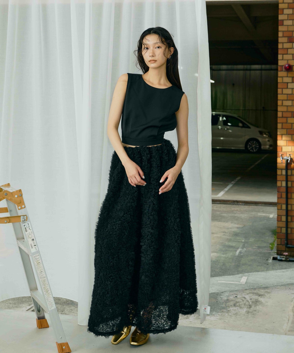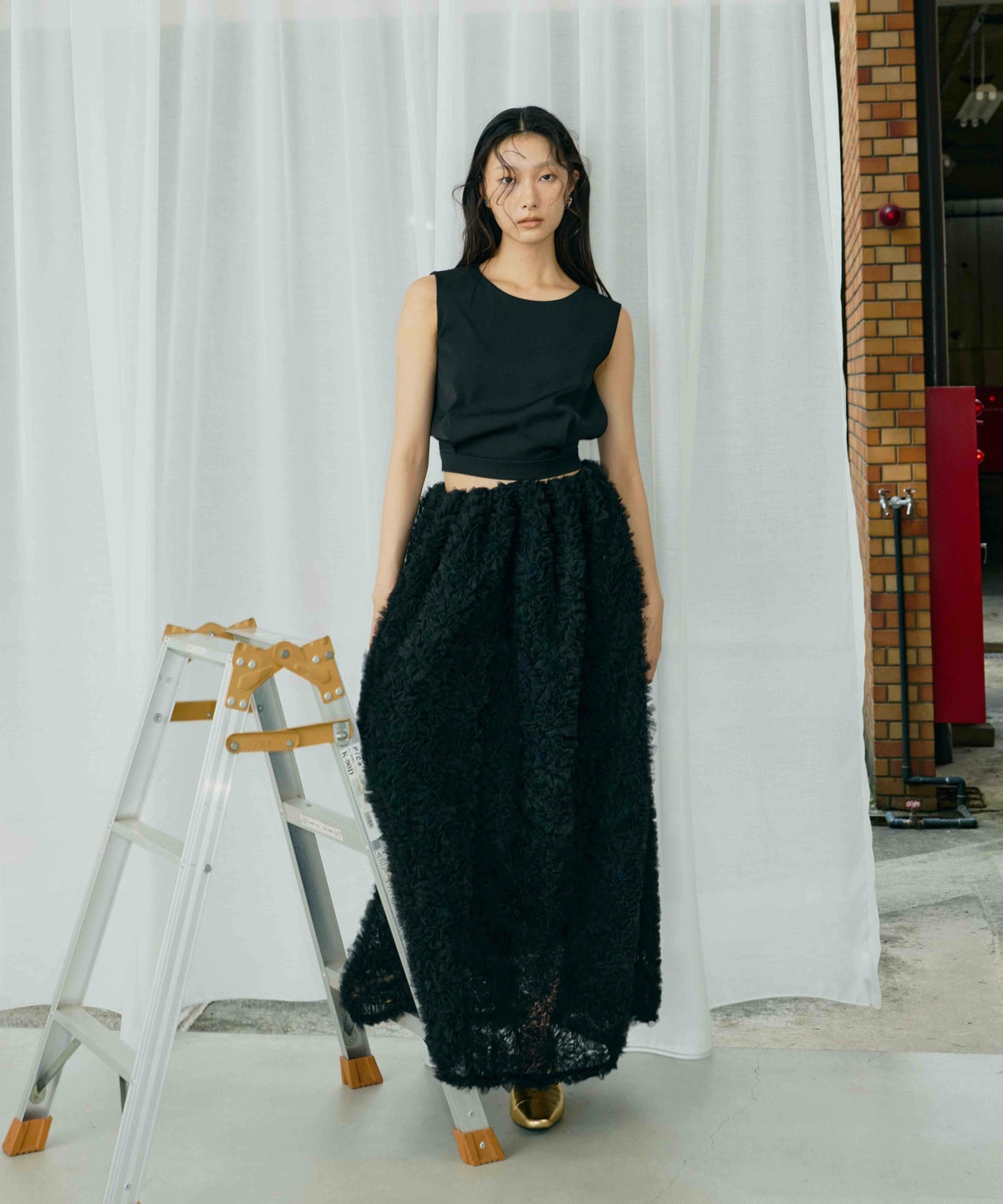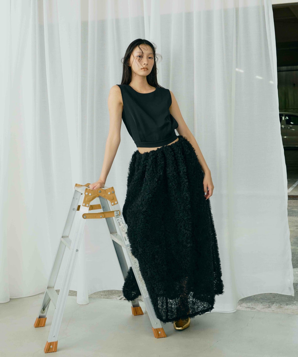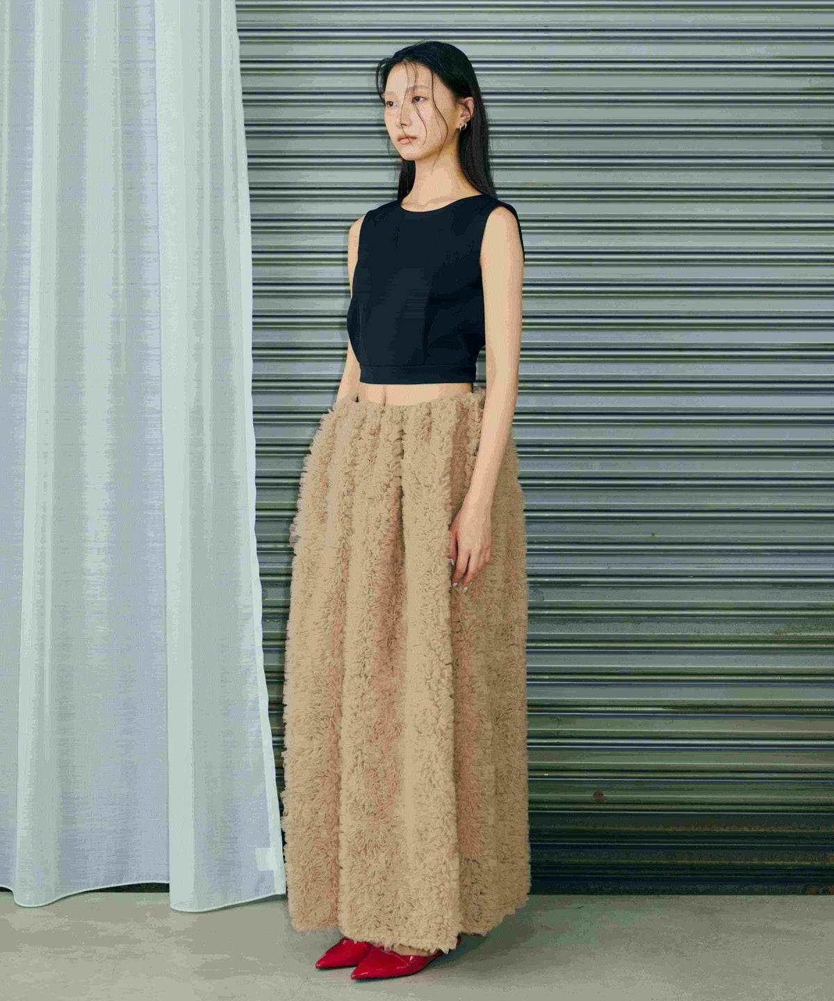 スカートがひき立つよう、トップスはセミマット・少し落ち感のある素材でバランス設計。
