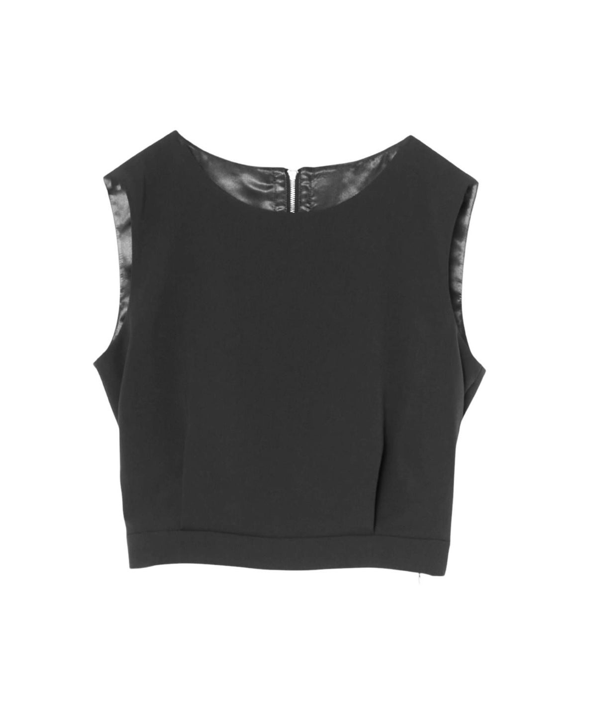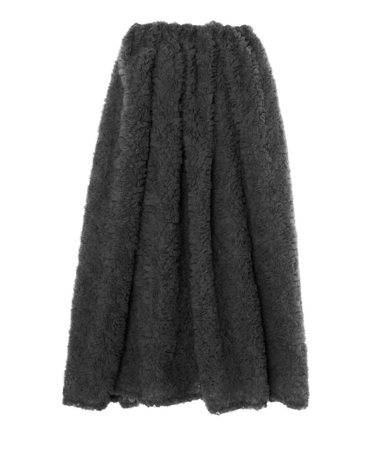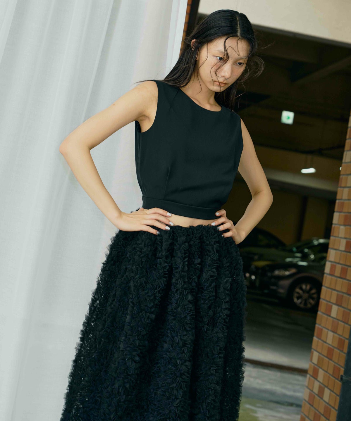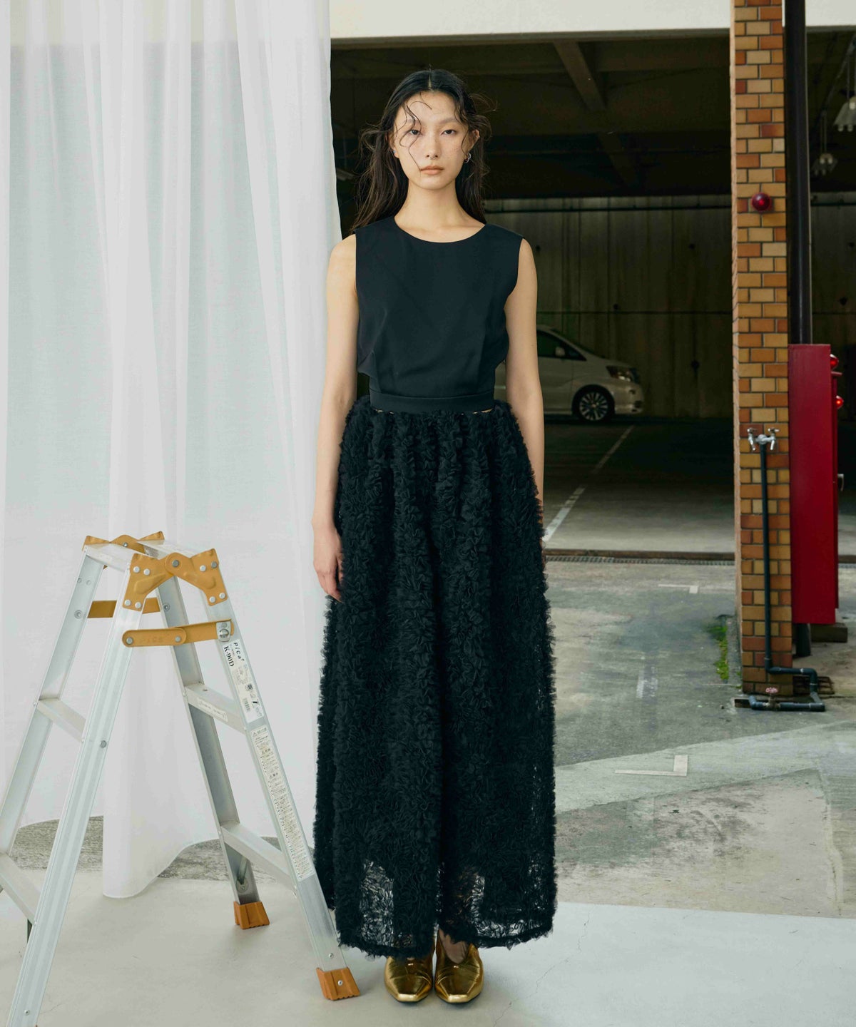 スカートがひき立つよう、トップスはセミマット・少し落ち感のある素材でバランス設計。