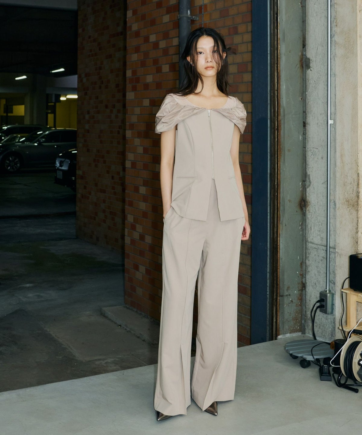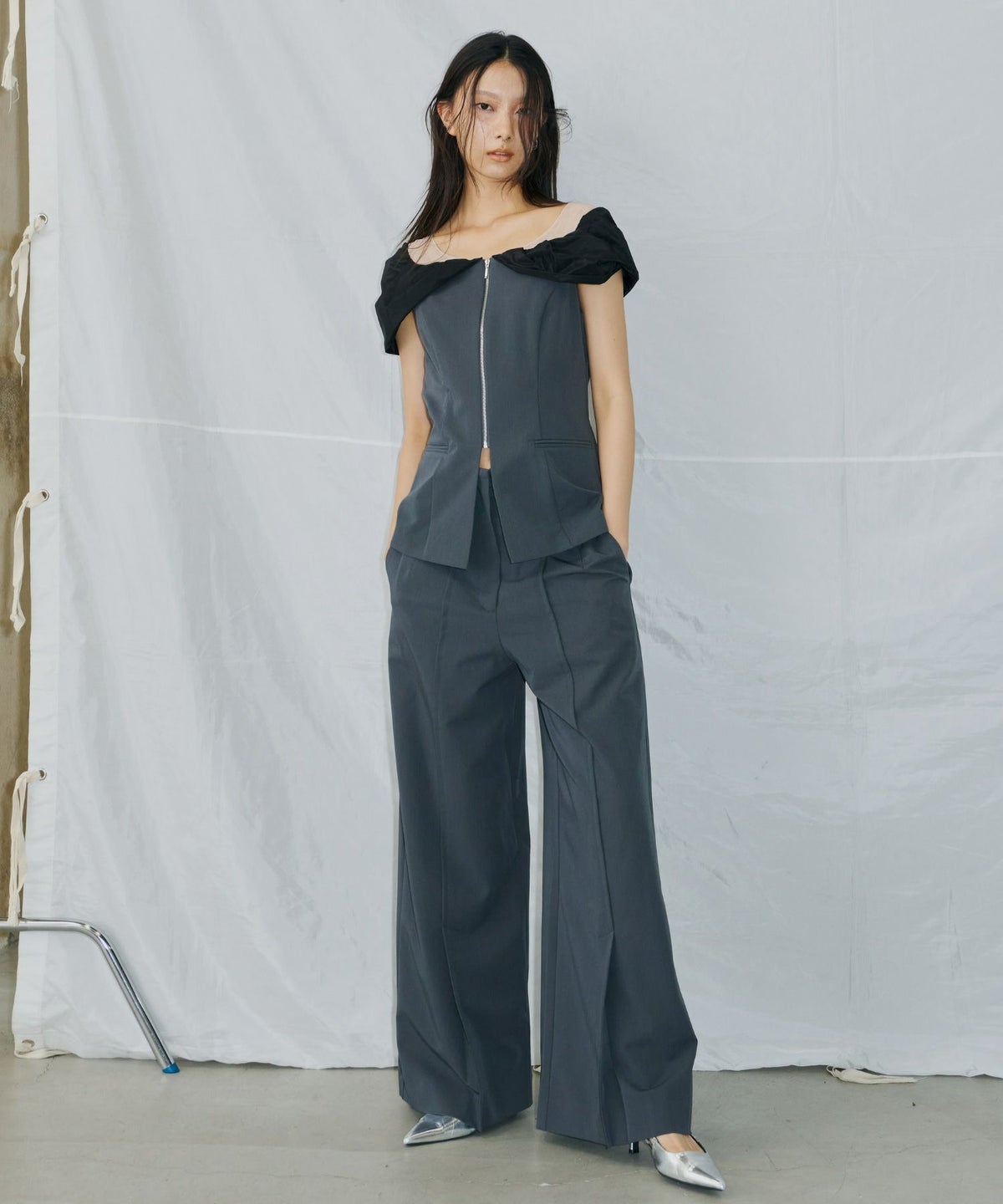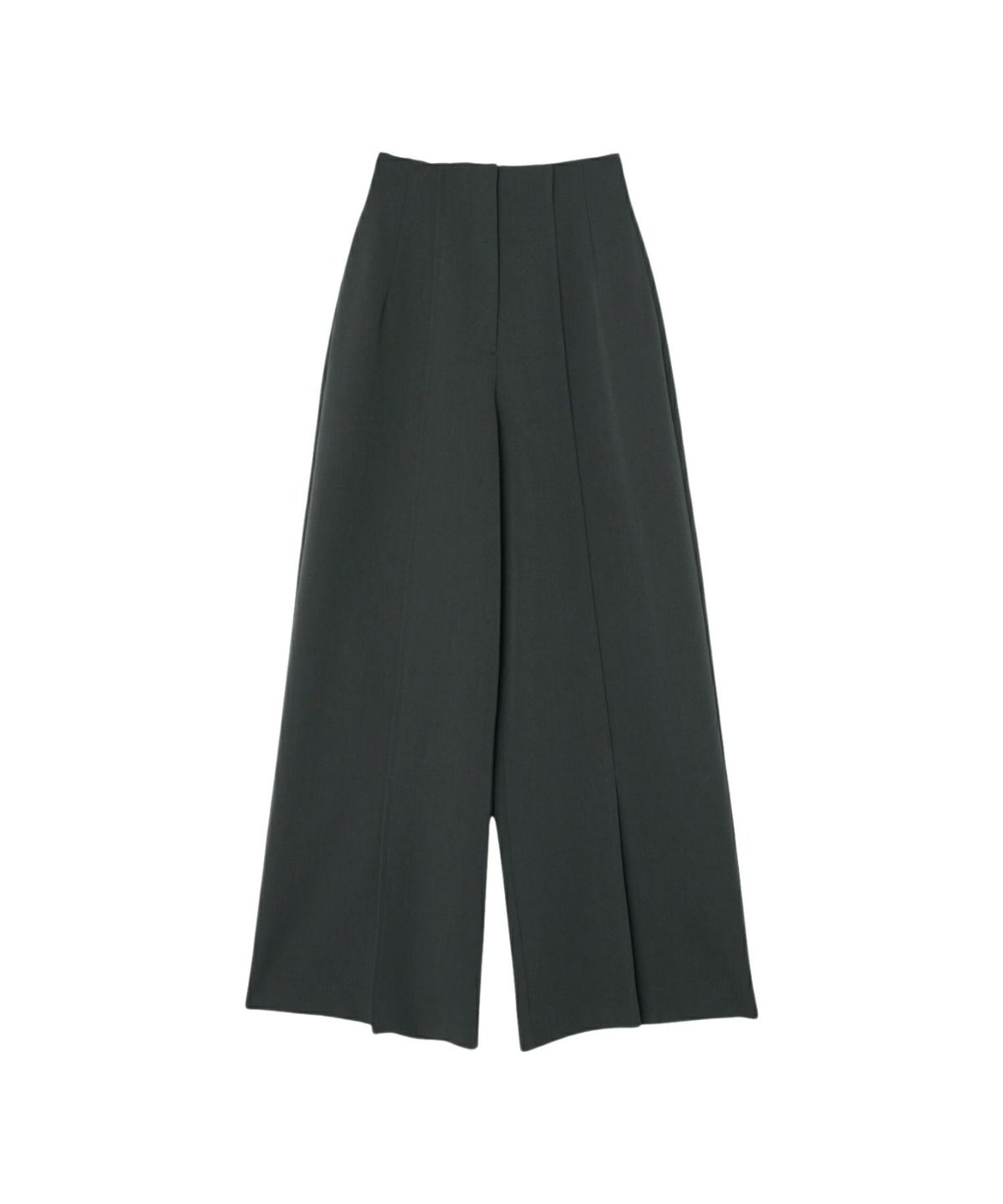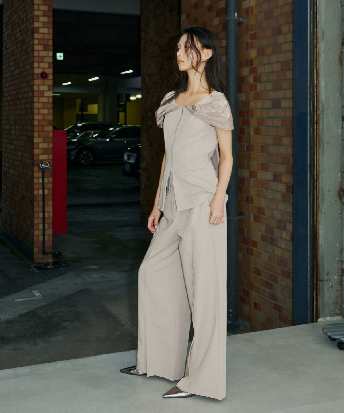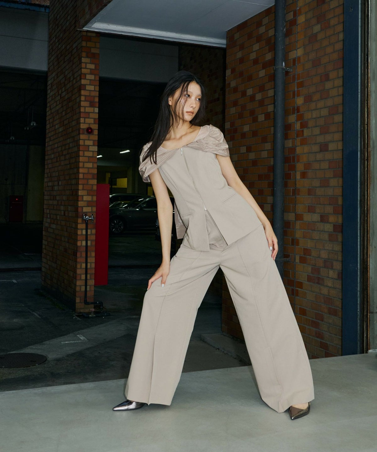 パンツはハイウエスト×ワイドシルエットで構築的に仕上げ、深めのセンタータックが縦のラインを強調。