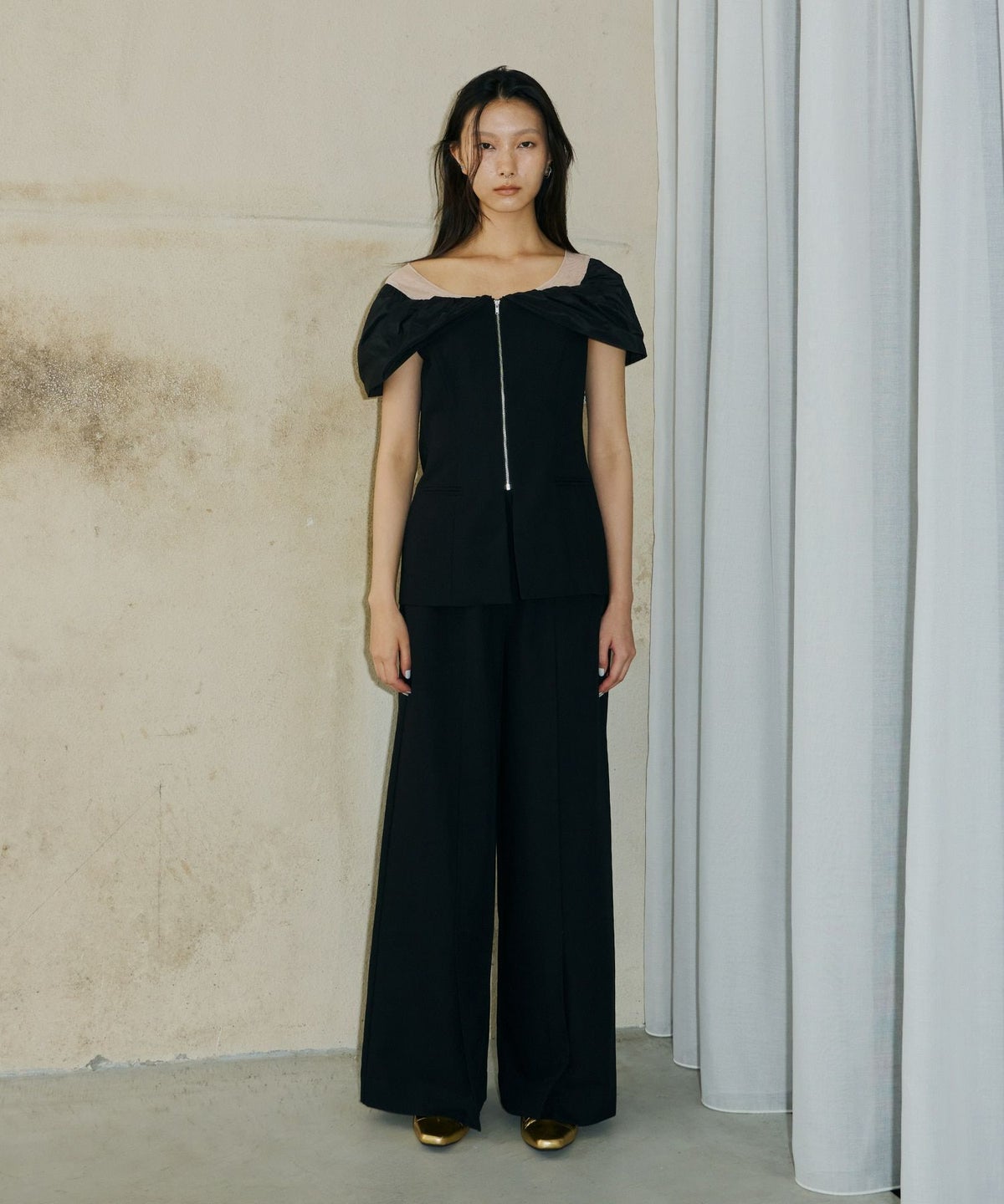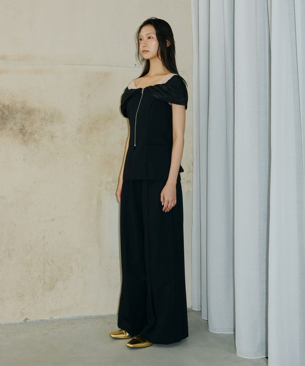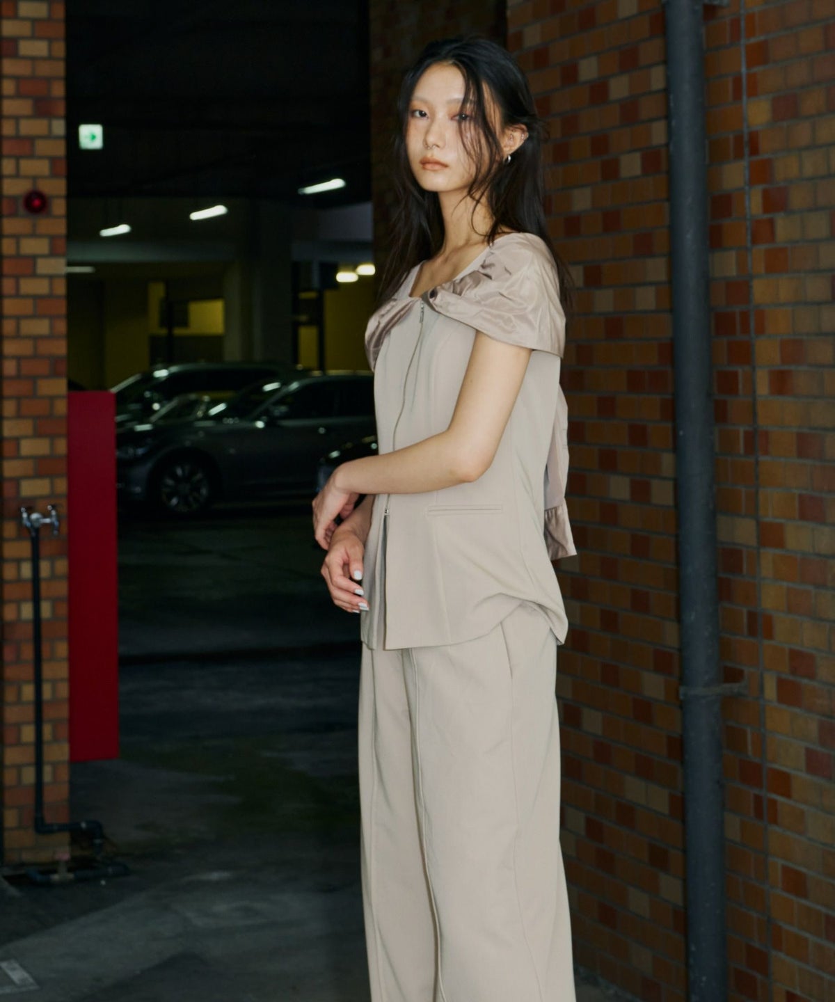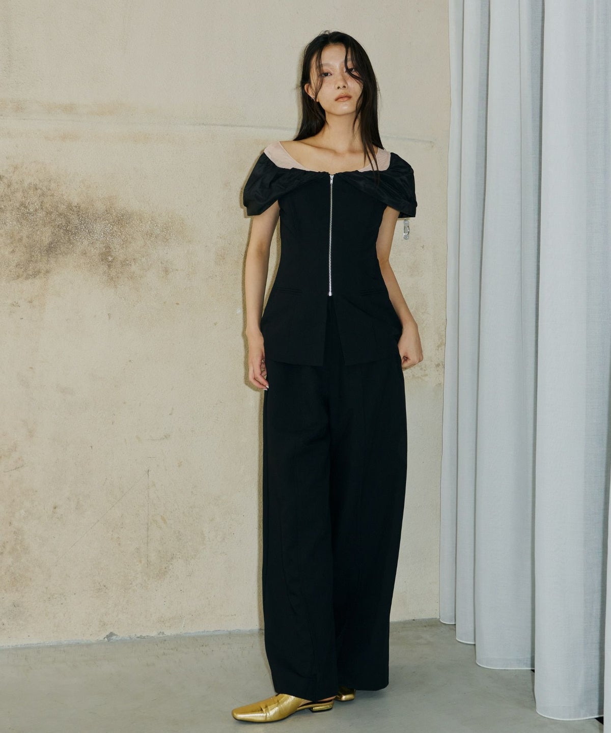 パンツはハイウエスト×ワイドシルエットで構築的に仕上げ、深めのセンタータックが縦のラインを強調。