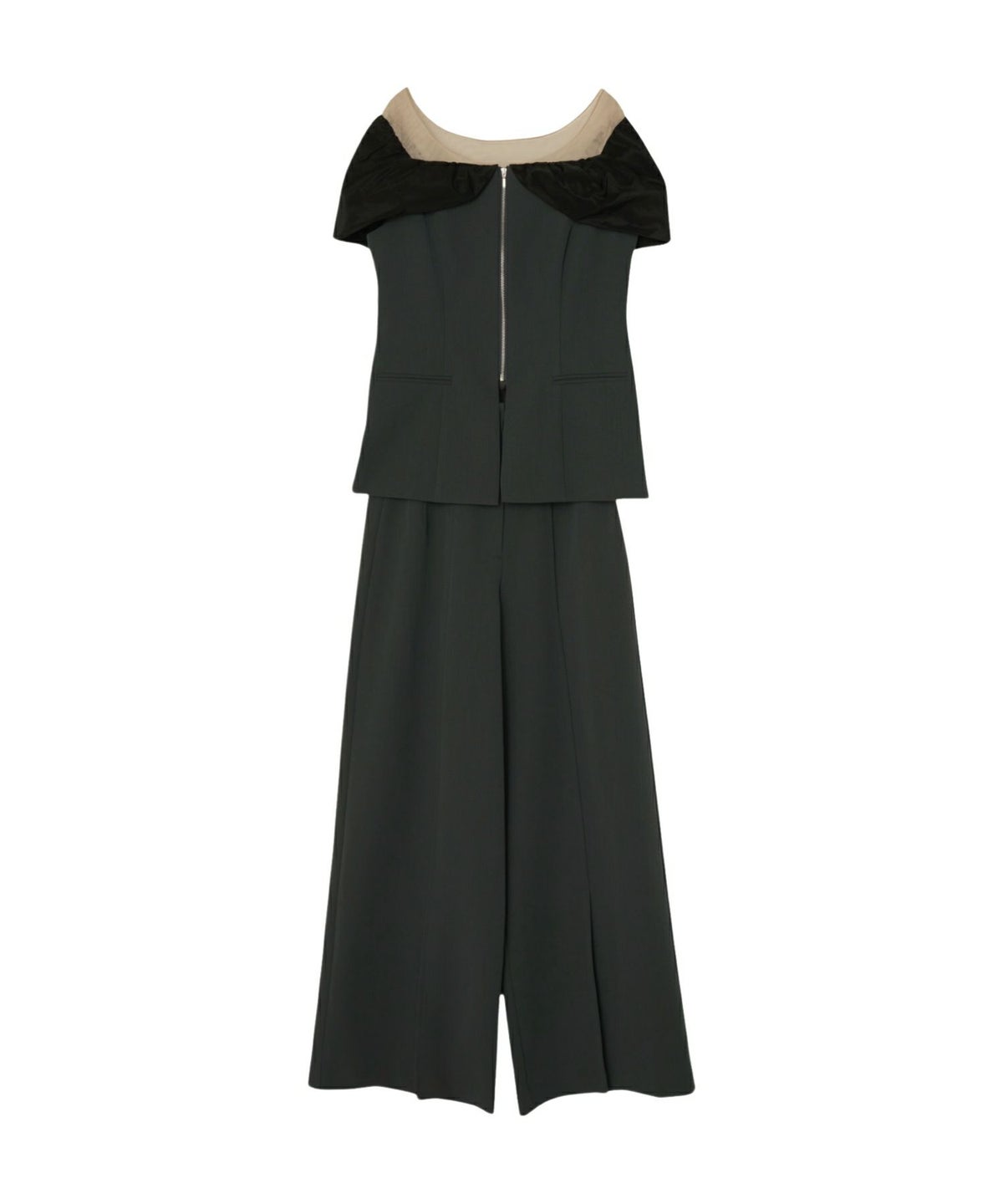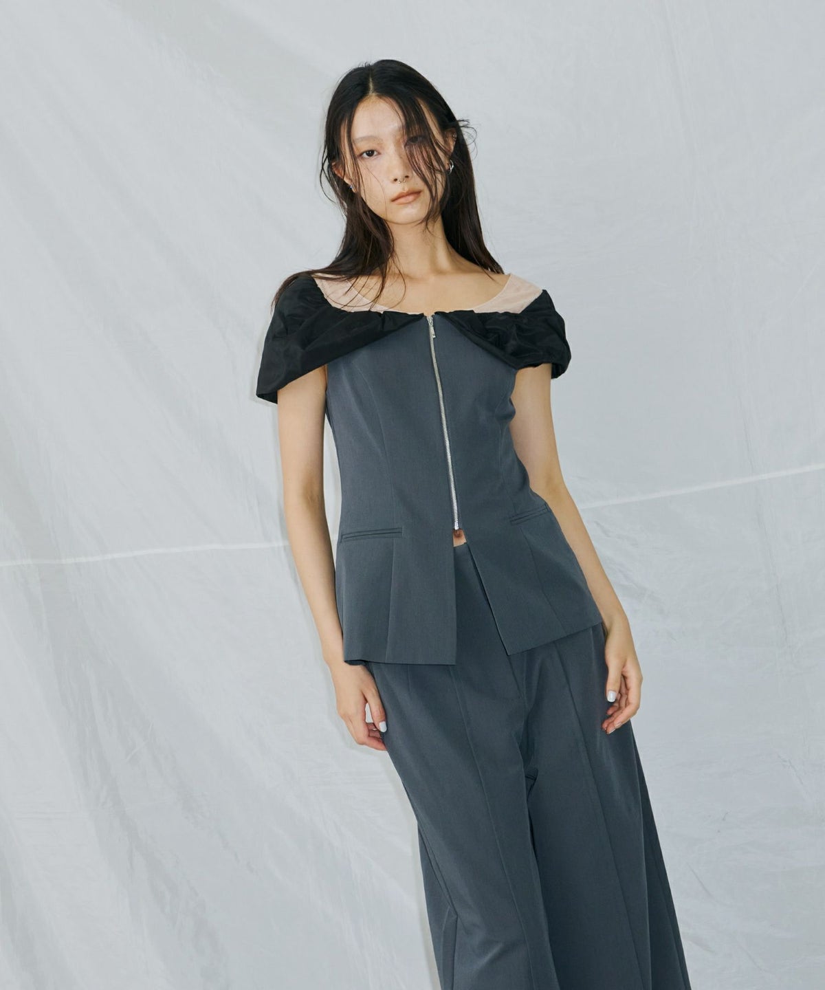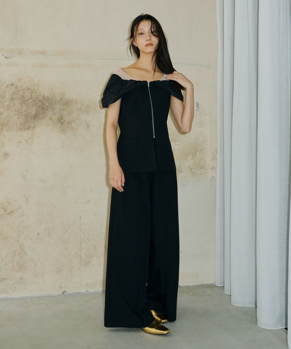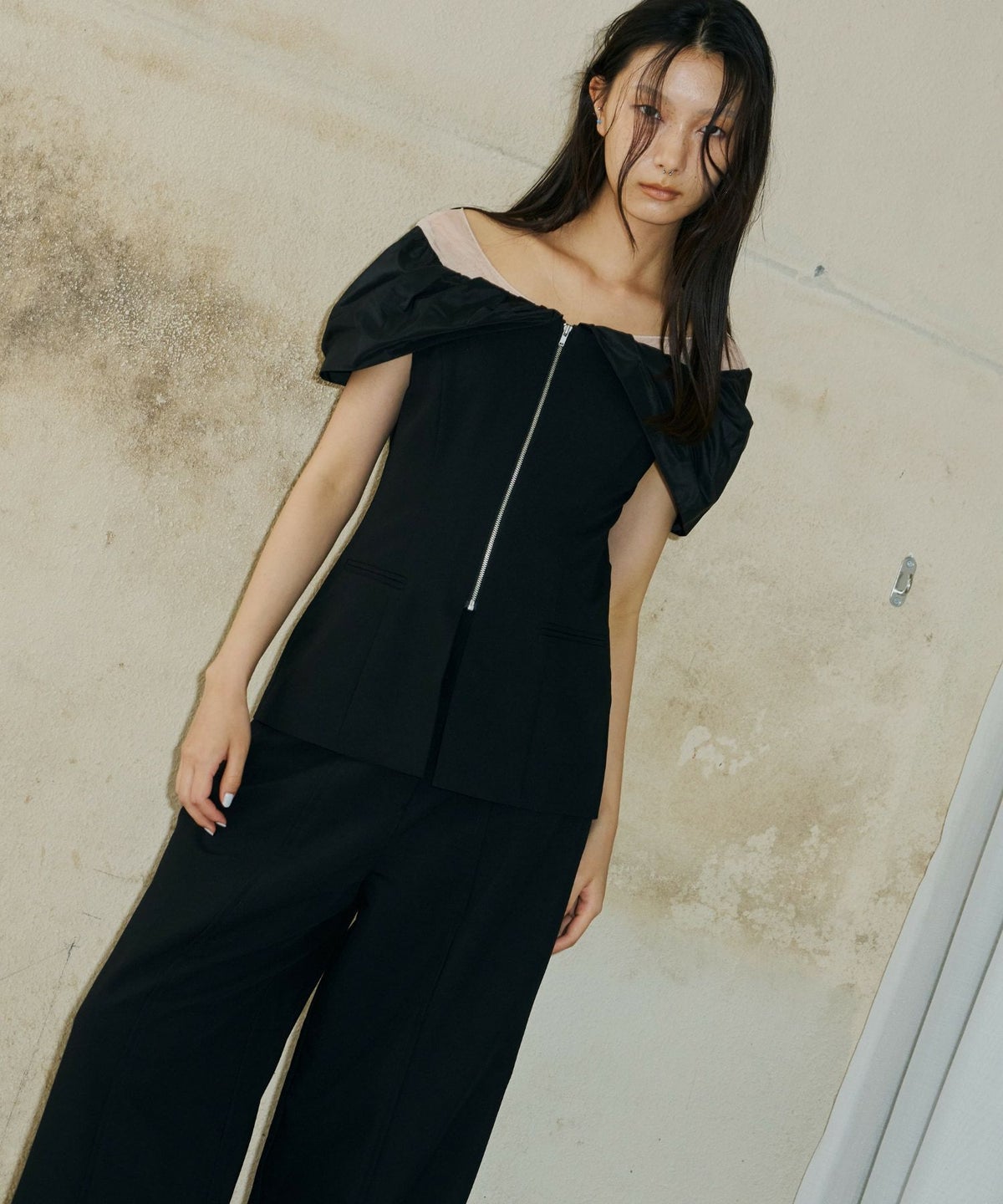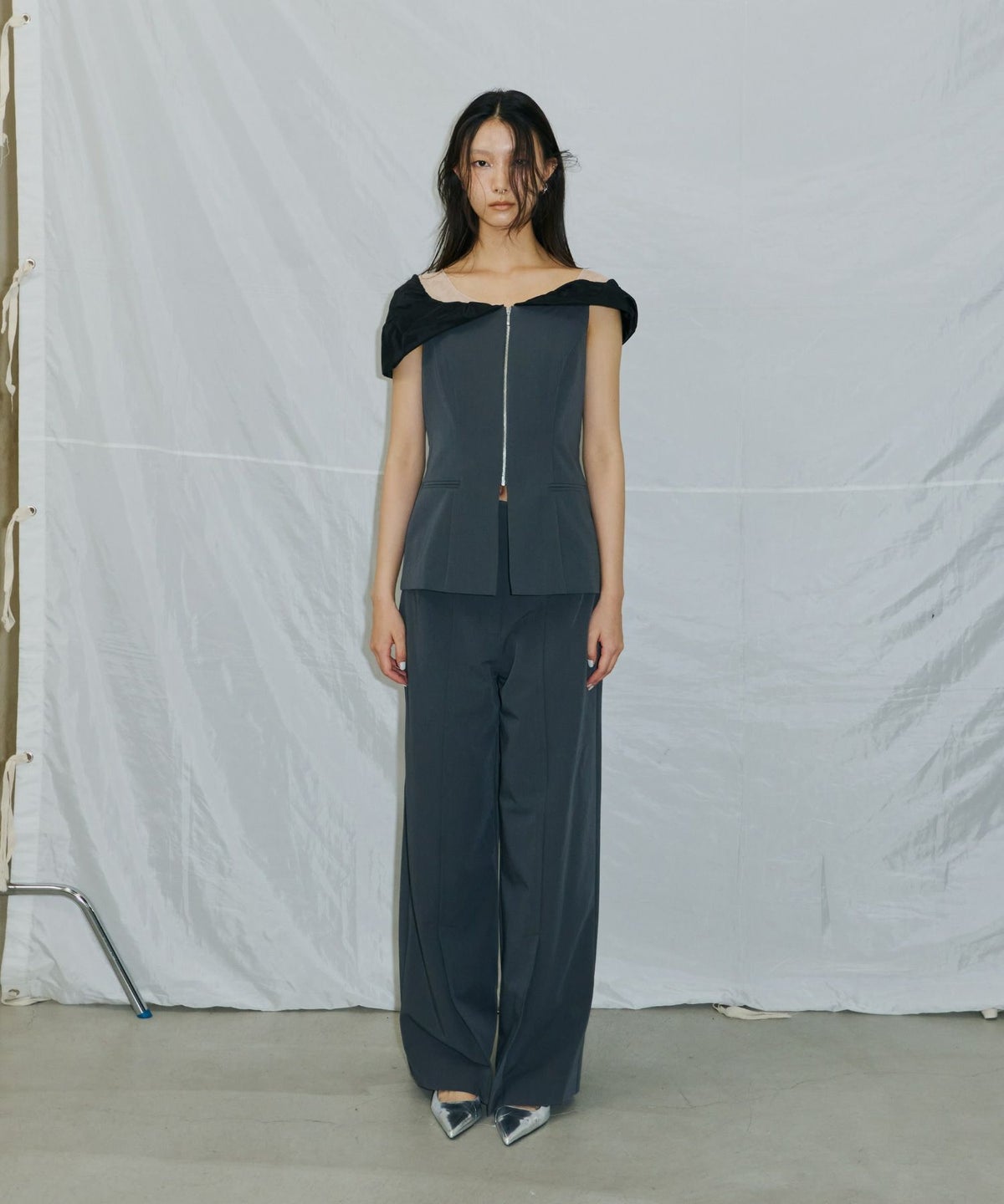 パンツはハイウエスト×ワイドシルエットで構築的に仕上げ、深めのセンタータックが縦のラインを強調。