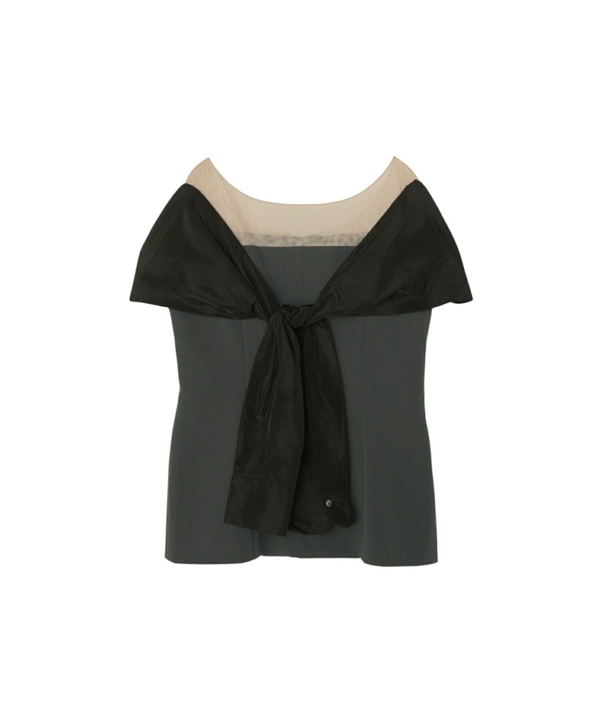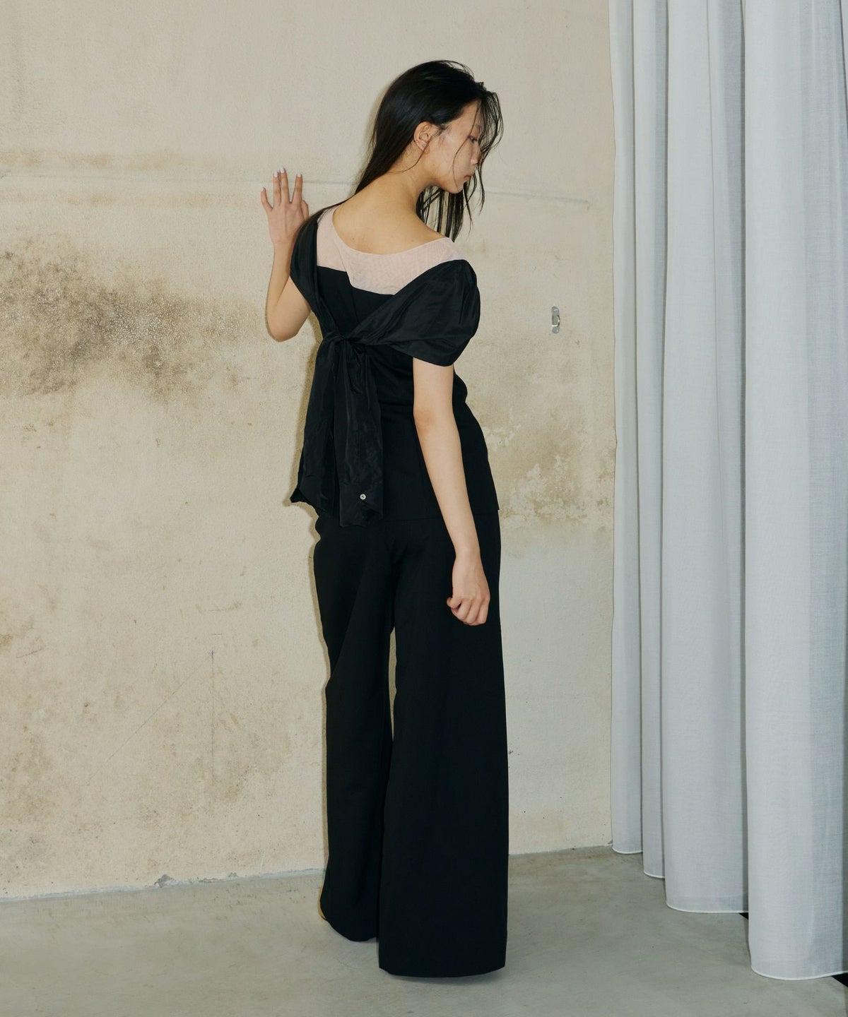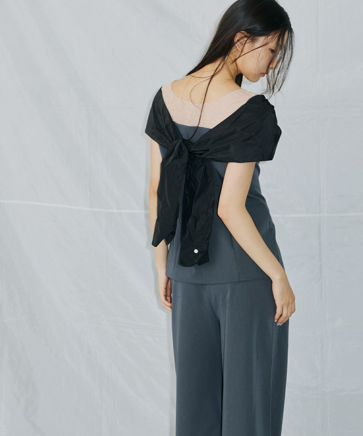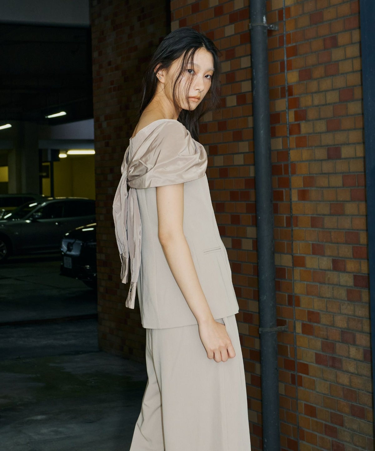 オフショル風のネックラインやバックスタイルのノットディテールが、シンプルなフォルムに立体的な表情をプラス。