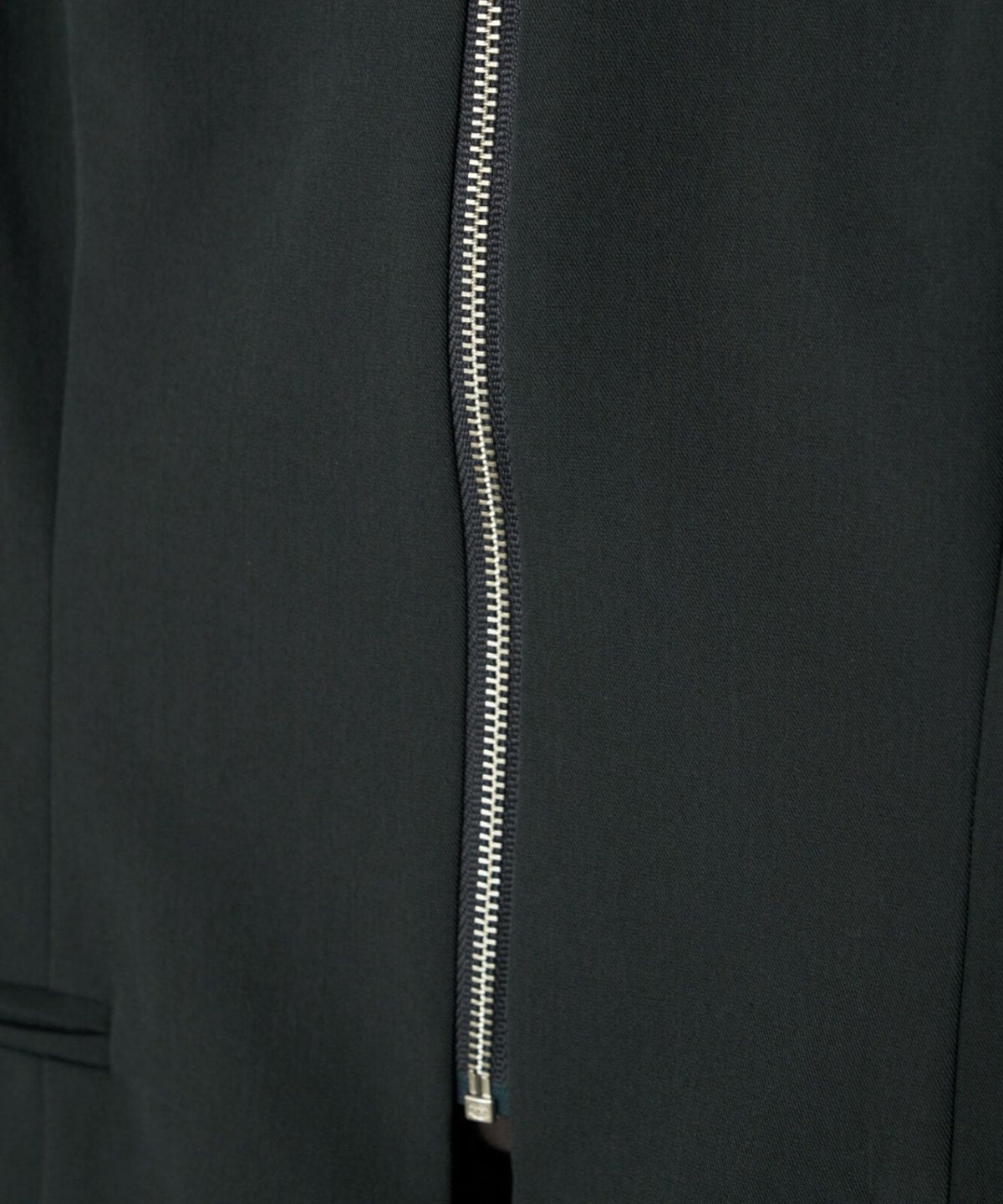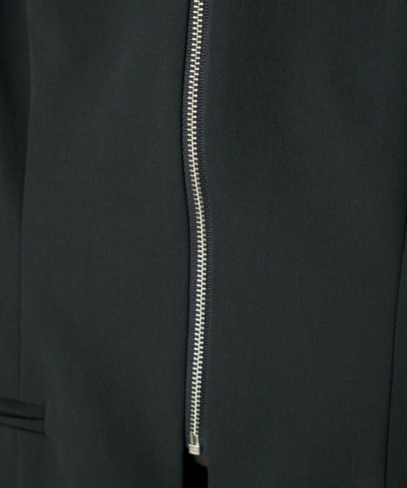 フロントのオープンファスナーやシャープな玉縁ポケットなど、細部まで研ぎ澄まされたディテールが都会的な雰囲気を際立たせます。