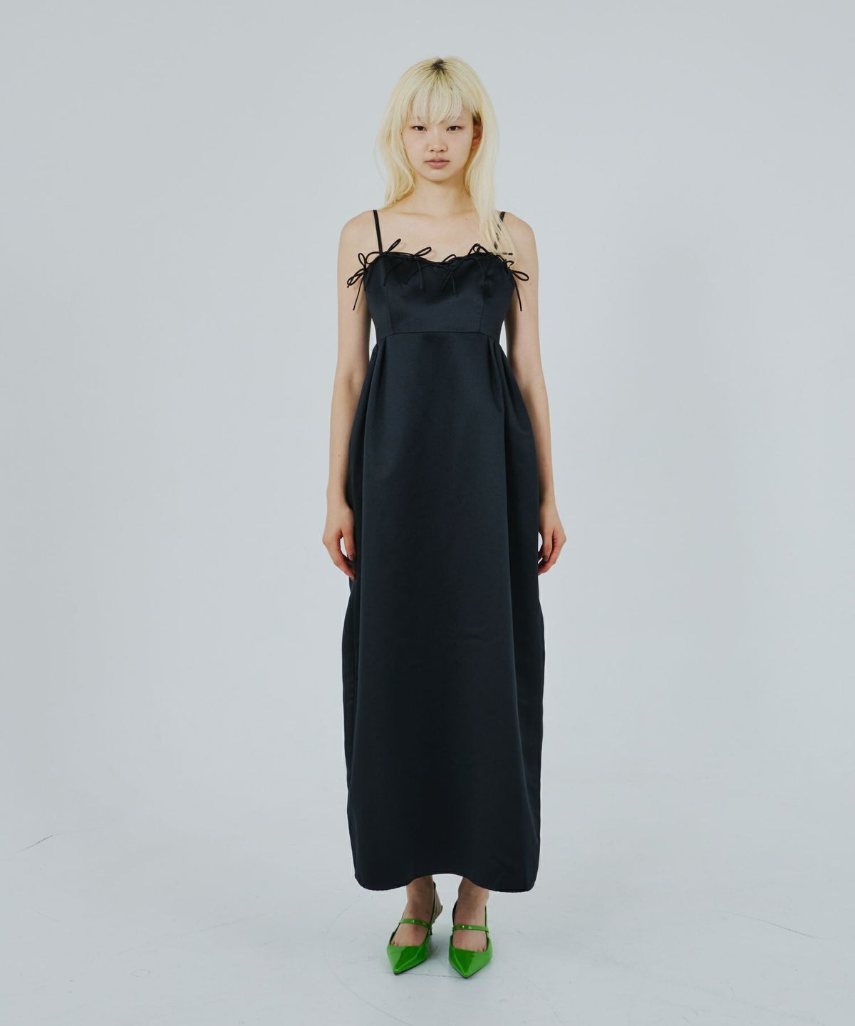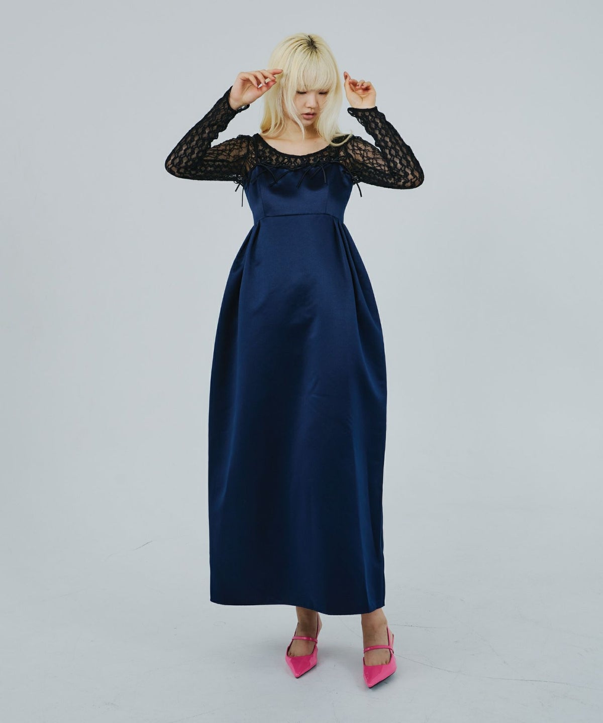 トップにあしらった大きなリボンが視線を惹きつけ、存在感のあるスタイルに。